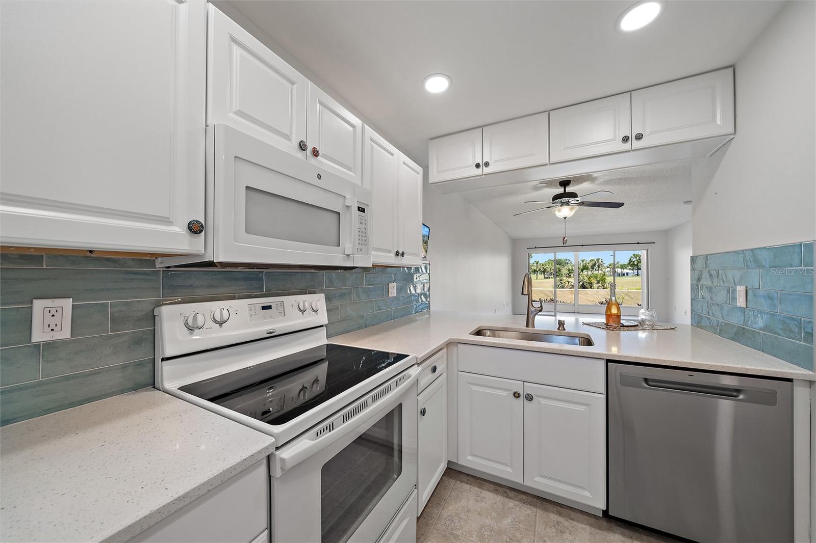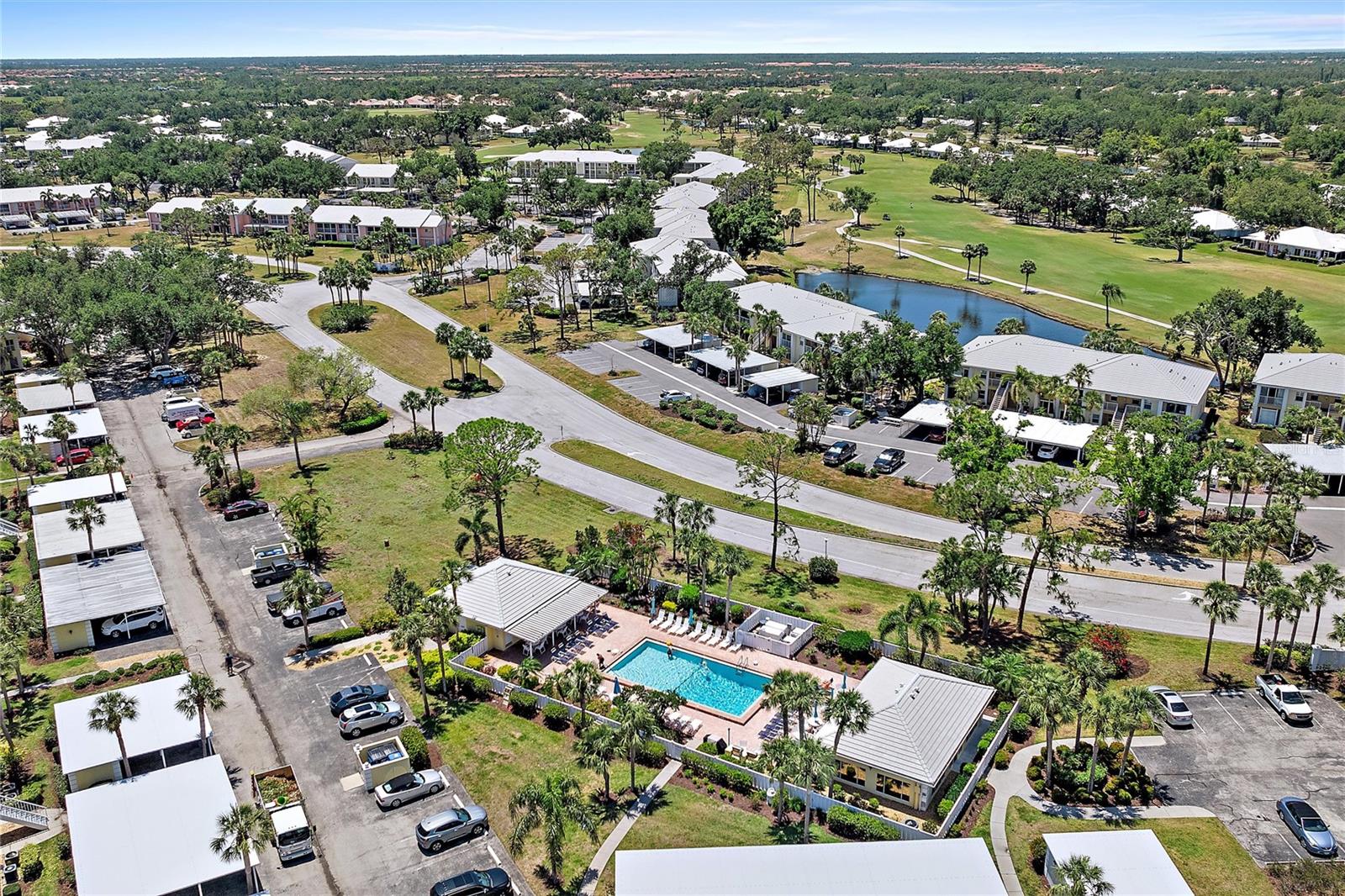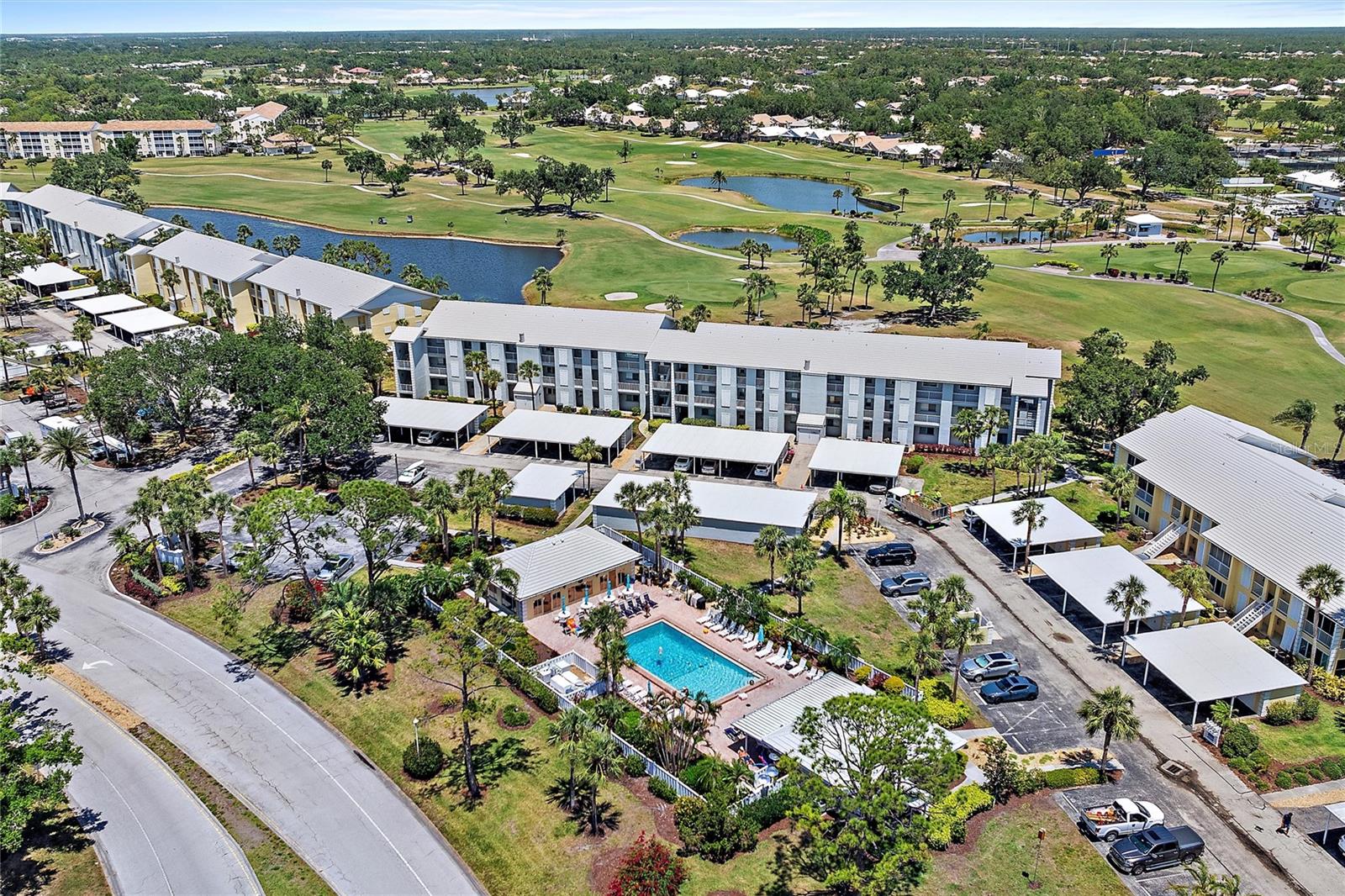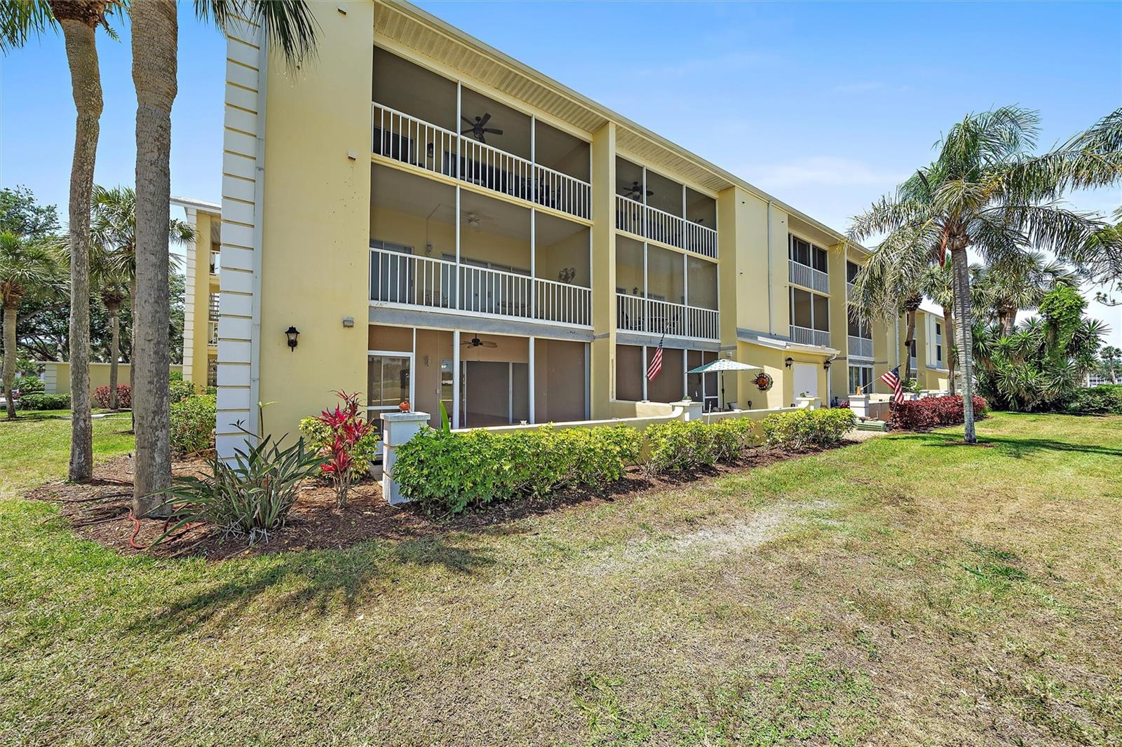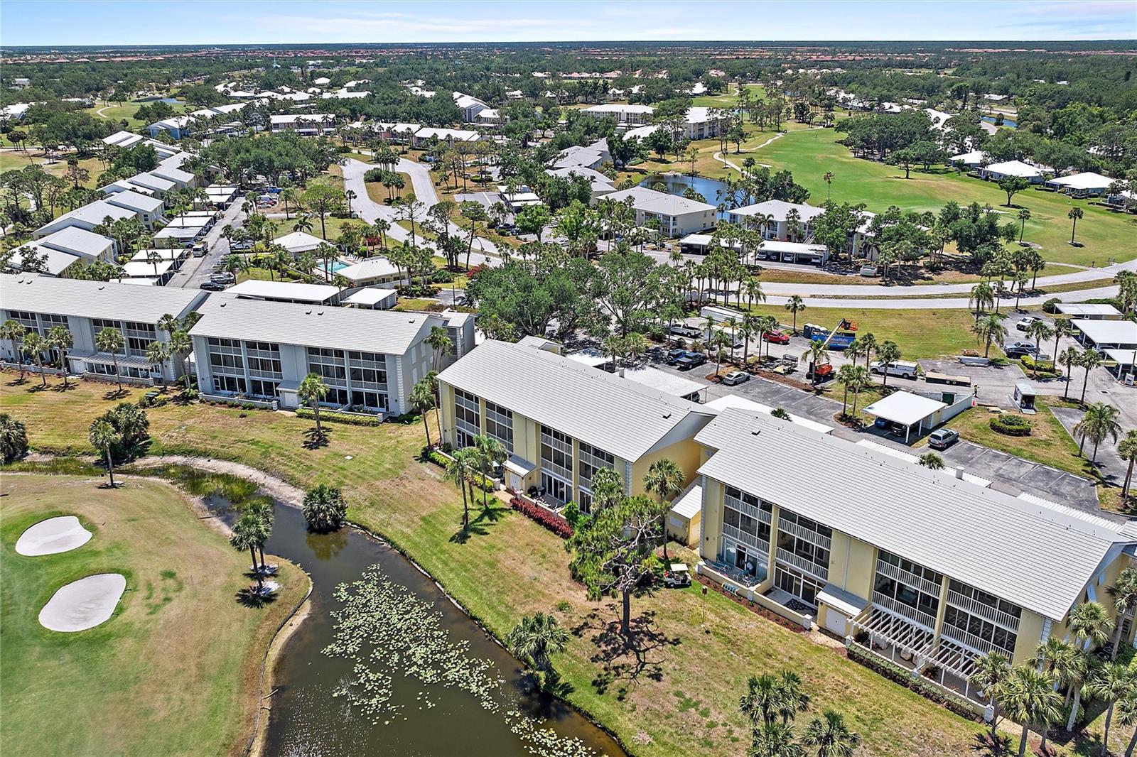 One or more photo(s) has been virtually staged. WOW! Price improved! FIRST-FLOOR End Unit with Golf Course Views in Westchester Gardens. Discover this beautifully updated 2-bedroom, 2-bath END UNIT condo. The thoughtfully redesigned kitchen opens to the main living area and showcases soft-close cabinetry, quartz countertops, a lovely tile backsplash, all designed to enhance functionality. The pantry cabinet features wood pull-out drawers for easy organization. Natural light fills the spacious living and dining area. Enjoy the extra windows in the primary suite and en-suite bath. The ensuite has been tastefully renovated with a coastal contemporary design, featuring tile floors & shower, new vanities, & mirrors with built-in lighting. Tile flooring flows throughout the home—there’s no carpet here—offering both style and ease of maintenance. Enjoy the screened lanai overlooking the golf course & ponds with the addition of the "sun patio". Your PETS are welcome here! There is peace of mind thanks to a Storm Smart Hurricane Screen across the lanai, which provides storm protection at the push of a button. Take note there is a pocket-door creating privacy for your "guest suite". A convenient covered carport and generously sized storage unit are located just beyond your front door. The community pool is just around the corner, and while membership to Plantation Golf & Country Club is optional, you’ll appreciate the beautifully maintained surroundings regardless. Located just minutes from the vibrant shops and dining in Downtown Wellen Park—without being in the midst of the ongoing construction—and under 10 miles to Venice Beach and charming downtown Venice, this home offers both serenity and accessibility. With recent upgrades including a newer HVAC system in 2021, water heater new in 2023, kitchen & entry updates also completed in 2021. Designed for comfort and ease of living, this home combines timeless design with thoughtful updates—perfect for those seeking a relaxed, maintenance-free lifestyle in the heart of Venice and Wellen Park.