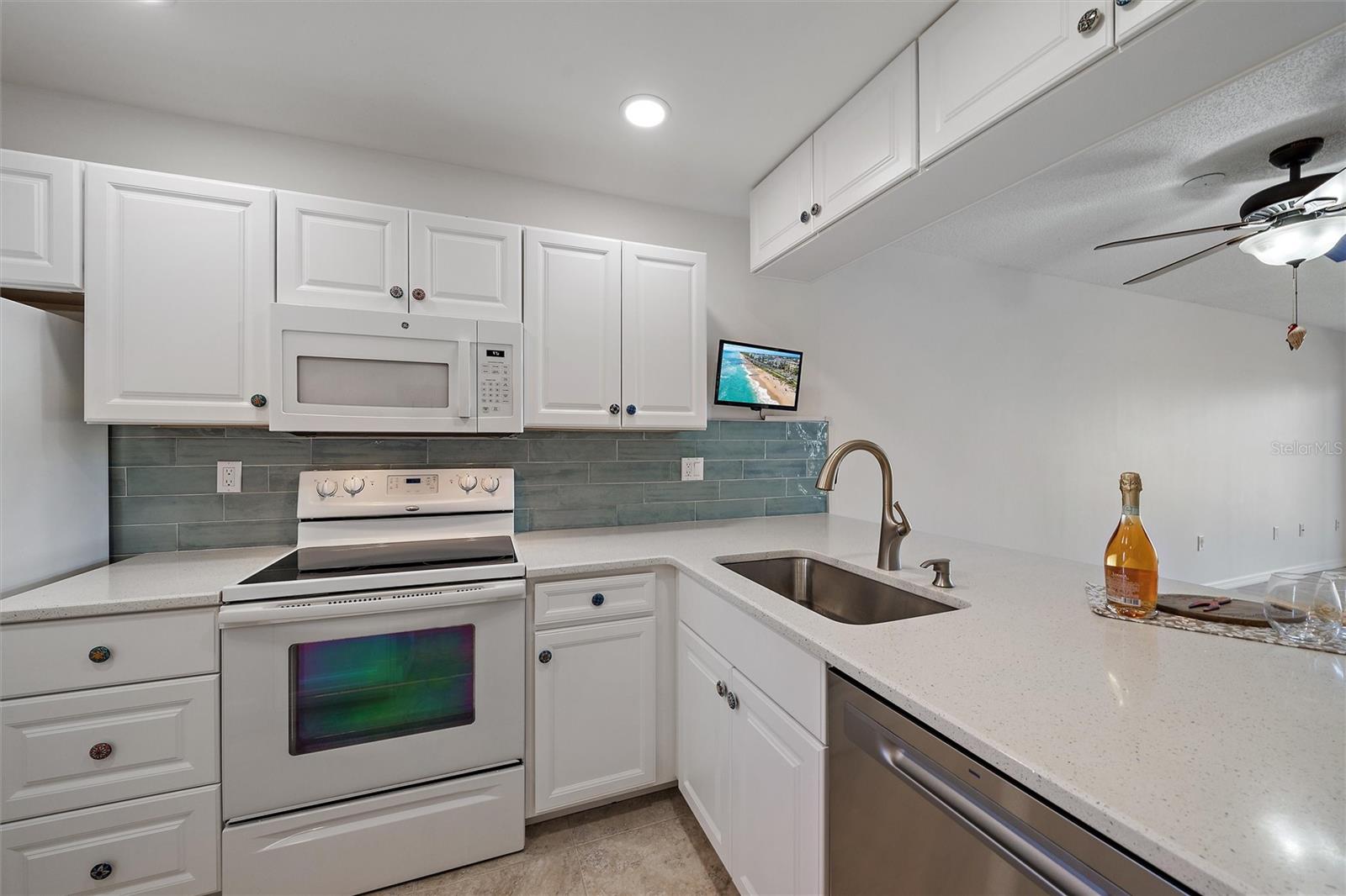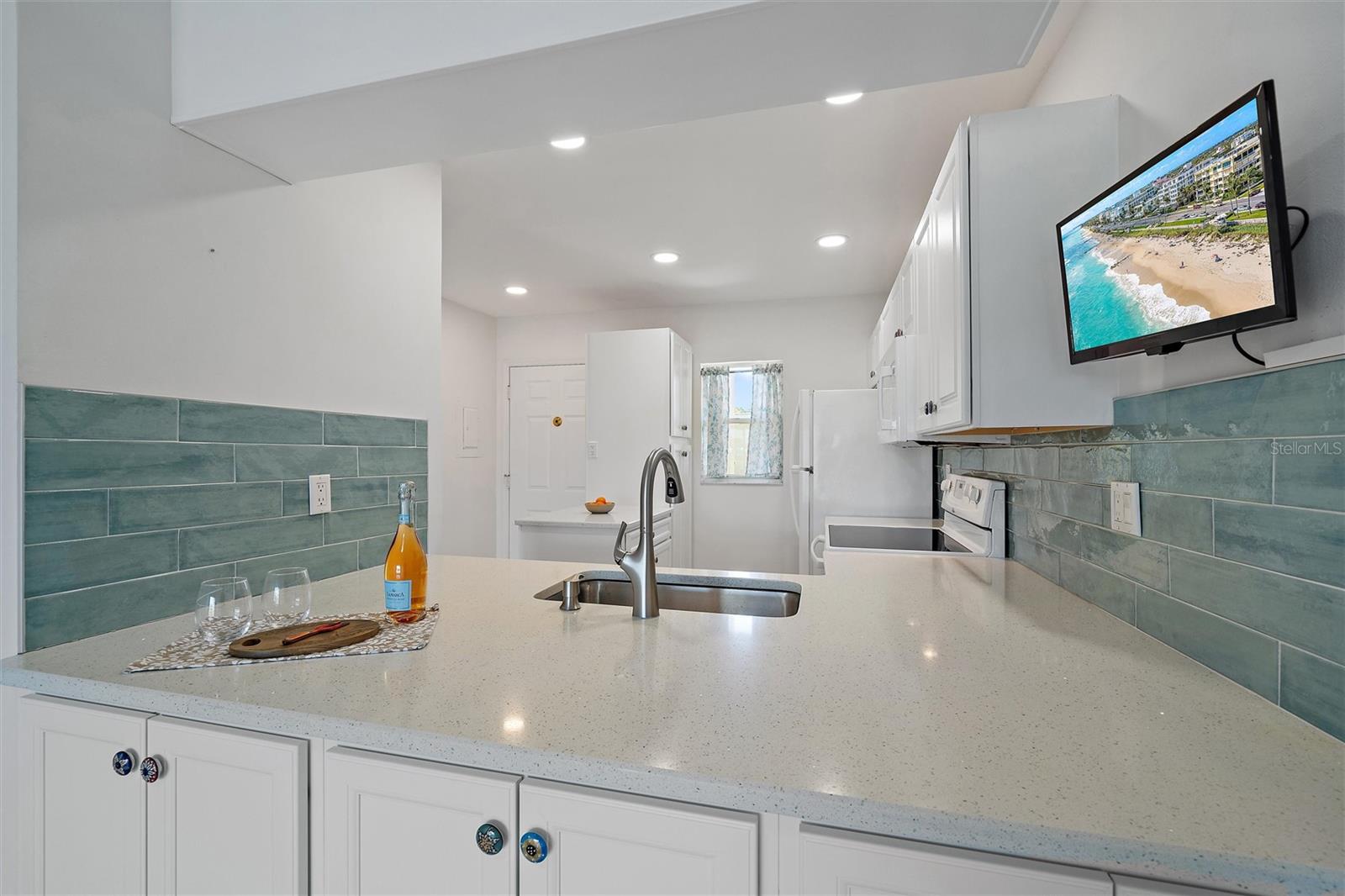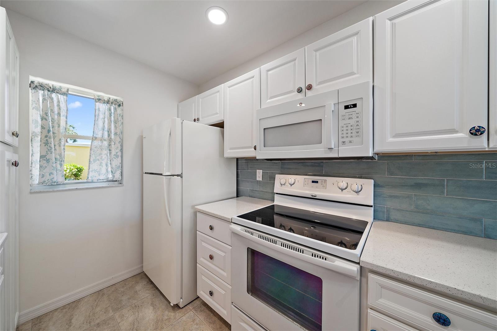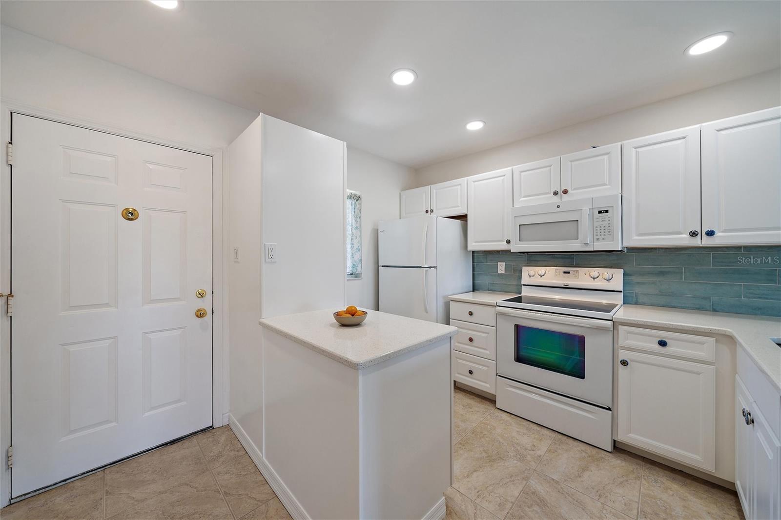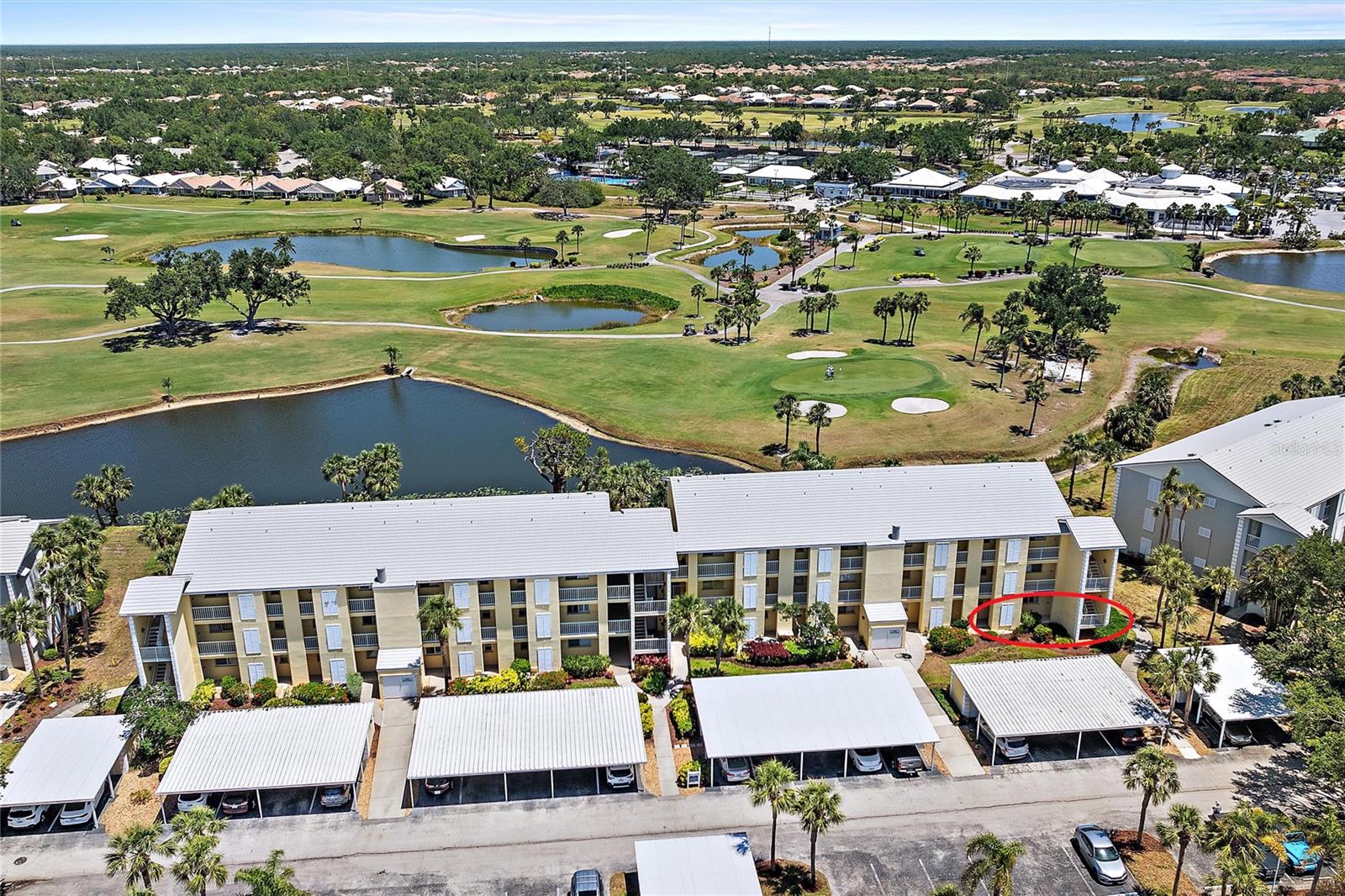 One or more photo(s) has been virtually staged. WOW! Price improved! FIRST-FLOOR End Unit with Golf Course Views in Westchester Gardens. Discover this beautifully updated 2-bedroom, 2-bath END UNIT condo. The thoughtfully redesigned kitchen opens to the main living area and showcases soft-close cabinetry, quartz countertops, a lovely tile backsplash, all designed to enhance functionality. The pantry cabinet features wood pull-out drawers for easy organization. Natural light fills the spacious living and dining area. Enjoy the extra windows in the primary suite and en-suite bath. The ensuite has been tastefully renovated with a coastal contemporary design, featuring tile floors & shower, new vanities, & mirrors with built-in lighting. Tile flooring flows throughout the home—there’s no carpet here—offering both style and ease of maintenance. Enjoy the screened lanai overlooking the golf course & ponds with the addition of the "sun patio". Your PETS are welcome here! There is peace of mind thanks to a Storm Smart Hurricane Screen across the lanai, which provides storm protection at the push of a button. Take note there is a pocket-door creating privacy for your "guest suite". A convenient covered carport and generously sized storage unit are located just beyond your front door. The community pool is just around the corner, and while membership to Plantation Golf & Country Club is optional, you’ll appreciate the beautifully maintained surroundings regardless. Located just minutes from the vibrant shops and dining in Downtown Wellen Park—without being in the midst of the ongoing construction—and under 10 miles to Venice Beach and charming downtown Venice, this home offers both serenity and accessibility. With recent upgrades including a newer HVAC system in 2021, water heater new in 2023, kitchen & entry updates also completed in 2021. Designed for comfort and ease of living, this home combines timeless design with thoughtful updates—perfect for those seeking a relaxed, maintenance-free lifestyle in the heart of Venice and Wellen Park.