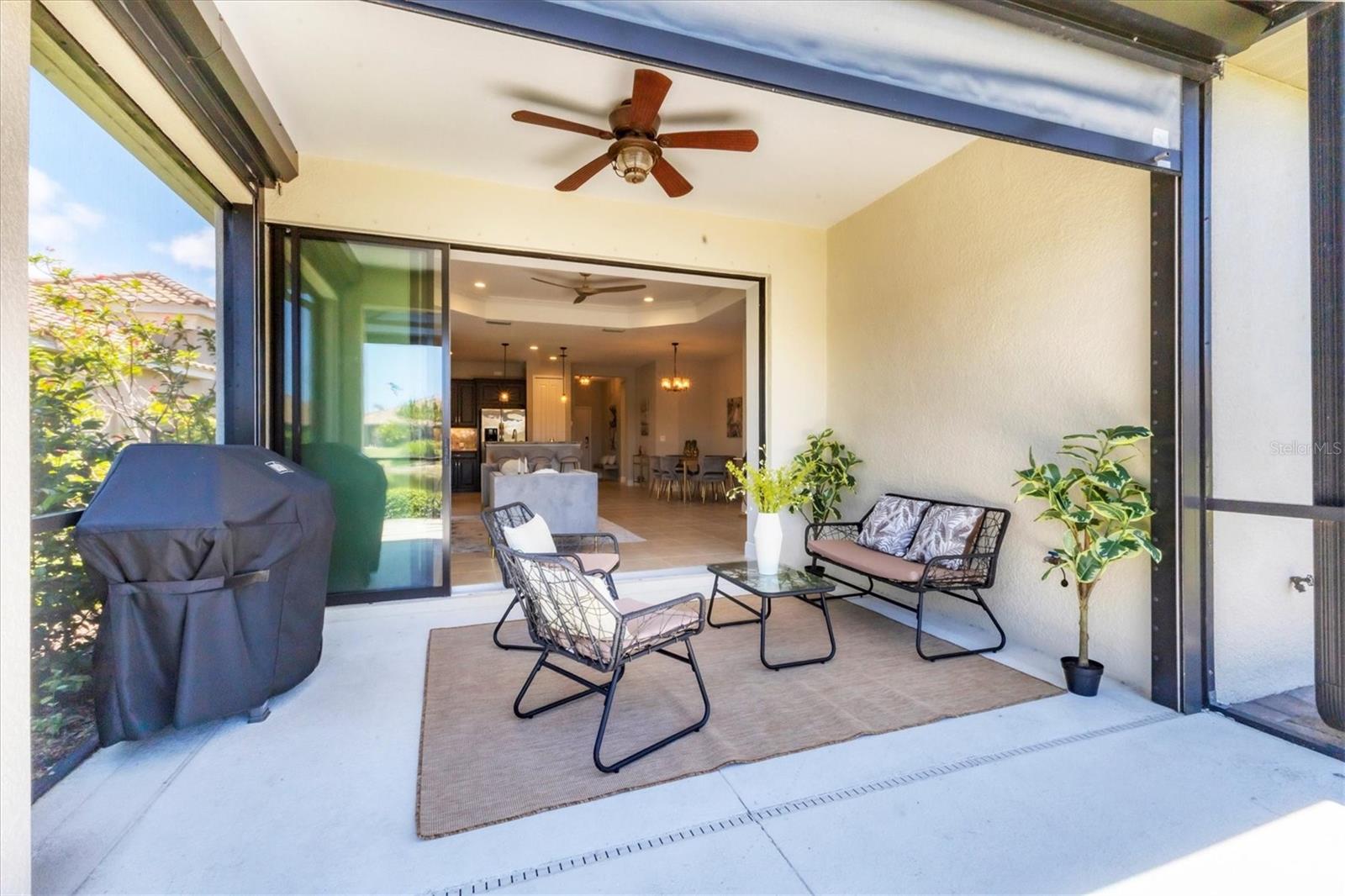 Elegant villa with smart upgrades and refined finishes, a Florida gem with amazing sunsets! Welcome to this beautifully appointed lakefront villa offering a blend of luxury, convenience and cutting-edge technology. In a sought-after, amenity-rich community of Grand Palm, this meticulously maintained home is loaded with thoughtful upgrades inside and out—designed for comfort, style and peace of mind. Some noteworthy exterior features include Storm Smart automatic hurricane screens on the extended lanai ensure effortless protection at touch of a button. Professionally landscaped front, side, and rear yards with custom-molded landscape curbing create eye-catching curb appeal. Gas stub on the lanai is ready for your dream grill setup—ideal for outdoor entertaining. A digital front door lock with integrated camera enhances convenience and security. Utility sink in the garage offers added functionality for everyday tasks. For comfort and technology improvements, stay connected with a monitored alarm system featuring app-controlled access for the thermostat, front door, garage and home cameras. Whole-house surge protection at the electric panel gives you added confidence during storm season. Designer touches include coffered ceilings with crown molding, faux cordless blinds, and ambient recessed and hanging lighting in the great room and kitchen. Striking granite countertops and a high-bar island make this kitchen beautiful and functional. Warm cherry cabinetry with crown molding and satin nickel hardware offers classic elegance. Additional features also include recessed and pendant lighting, tile backsplash set in a modern horizontal layout and top tier finishes throughout. Both guest and primary baths showcase floor-to-ceiling ceramic tile shower enclosures. Custom cherry cabinetry, satin nickel hardware and Corian vanity countertops blend beauty with durability, and whisper-quiet Panasonic exhaust fans with electric timers provide added comfort and efficiency. Additional highlights included a custom Murphy bed in the flex room/office adds versatility for guests or workspace. The primary suite features a private wood door enclosure separating the bedroom from the bath, creating a serene retreat. Don't miss your opportunity to own this standout and maintenance-free home that offers peace of mind, elegant living and smart features tailored for modern life. Schedule your private showing today and receive a one-year home warranty protection plan, two mounted televisions and a natural gas patio grill.