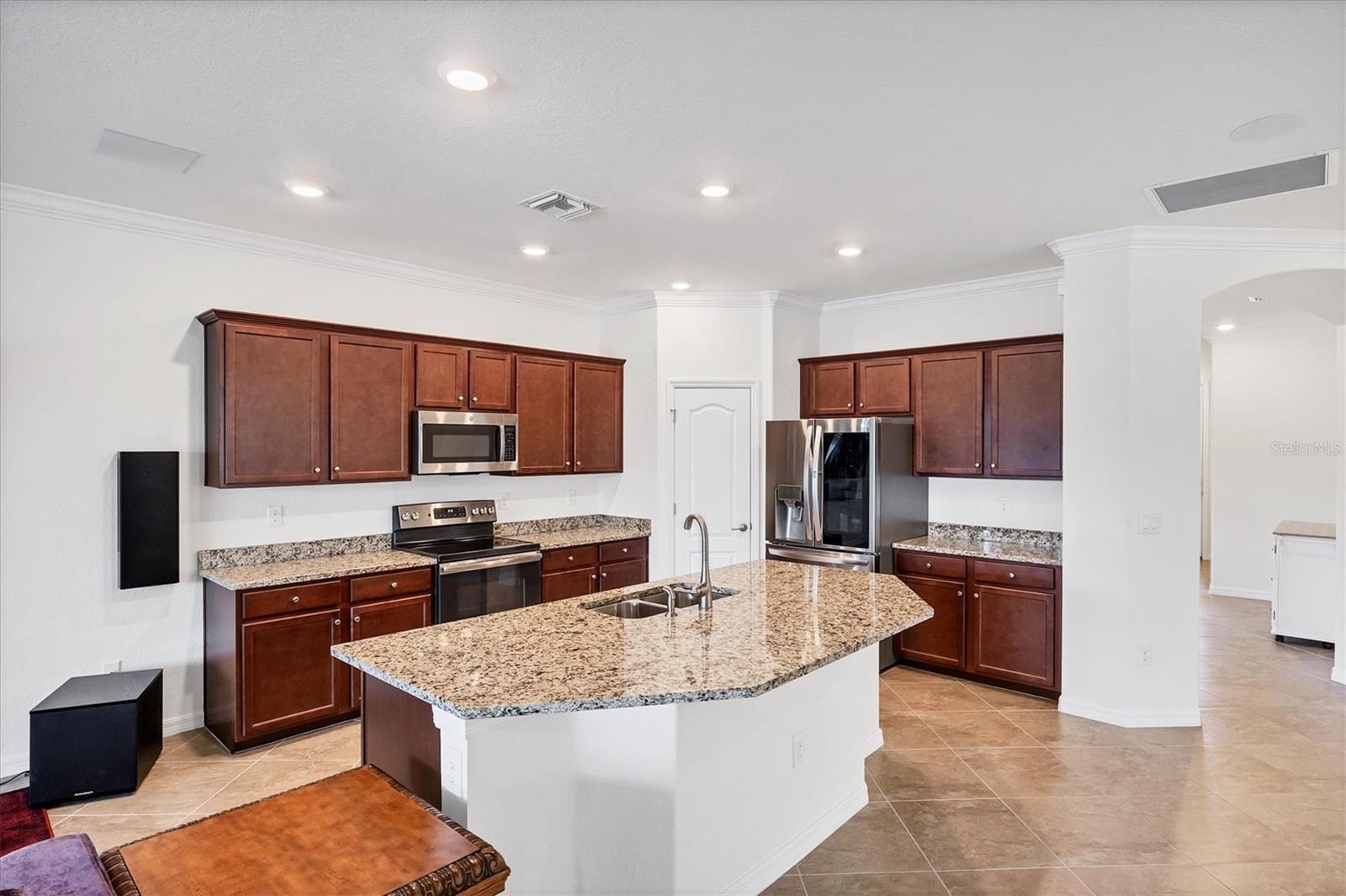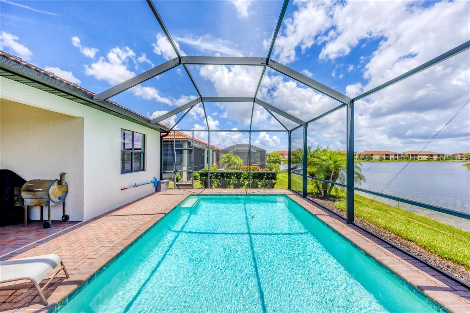 TRULY SPECTACULAR VIEWS!! Private pool and lanai overlooking lake views in all directions. SOUTHWEST EXPOSURE for sun all day long. PAVERED LANAI SURROUNDS SOLAR HEATED POOL. Looking for a little relaxation in the shade- sit on your front porch- a great place for reading a book and watching or engaging with the neighbors walking by. This Milan floor plan has 2BR/2BA and a SEPARATE FLEX ROOM that has multiple uses and can be whatever you prefer. Often used as an office space or den with a pull out sofa for extra guests. The large open great room is the heart of the home, combining living room, kitchen, and dining room areas together for cozy gathering or all out entertaining space. The whole home is enhanced with a Neutral, Warm decor, high ceilings, crown molding, and 8 foot doors. Gourmet kitchen offers GRANITE counters, STAINLESS STEEL appliances/upgraded refrigerator, extra recessed lighting, and Island perfect for eating breakfast or setting out hors d'oeuvres and wine. Tile flooring throughout the main rooms with carpets in the 2 bedrooms only. Spacious en suite master bedroom with 2 WALK IN CUSTOM BUILT closets. Master bath has dual sinks and walk in shower. Large Guest bedroom at other end of home for privacy. Separate laundry room with wash sink. HURRICANE SHUTTERS. Not in Florida to see it in person? Go to the 3D Walkthrough at : https://my.matterport.com/show/?m=heBGDXv4DTf Sarasota National is Venice’s premier community, offering over 1,300 acres of preservation, conservation, lakes, and open spaces with breathtaking views. As an Audubon International Certified Sanctuary, it provides the perfect backdrop for the community’s 18-hole championship golf course. Enjoy resort-style amenities, including a huge pool and spa, Tiki Bar, tennis courts, pickle ball, bocce courts, a 7000 sq. ft. fitness center, a 30,000 sq. ft. clubhouse with dining and incredible views, and a coffee lounge/library/card room/meeting place. Plus, there’s a day spa for relaxation. The community is just minutes from the new Wellen Park shopping area and Atlanta Braves stadium, with Venice Beach and downtown Venice only a short drive away. Whether you enjoy dining, shopping, or outdoor activities, this location has it all. Live the Florida lifestyle and make every day feel like a vacation! Schedule your tour today! BE AWARE, hitting the "contact agent"button on Zillow or 3rd party websites will NOT take you to the person who has the house on the market. SEE THIS GREAT HOME TODAY and FIND YOUR FLORIDA LIFESTYLE!