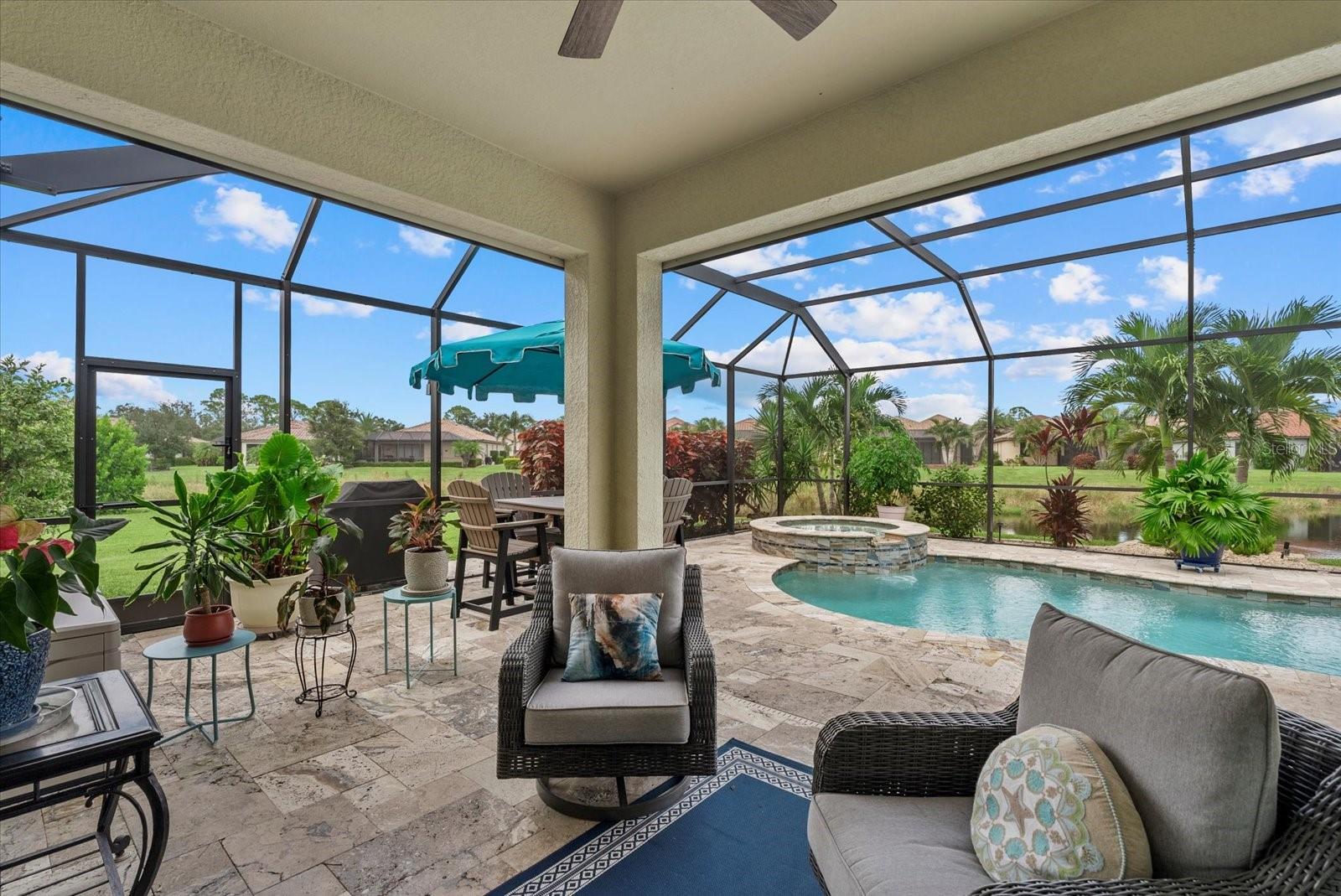 Price improvement in Gran Paradiso. Experience luxury Florida living in this beautifully designed single family pool home in the maintenance free, gated community of Gran Paradiso in Venice, Florida. Set on a quiet cul de sac with a serene water view, this popular Capri floor plan offers spacious open living areas with elegant upgrades throughout. Enjoy exceptional curb appeal with tropical landscaping and an oversized lot that provides privacy and extra green space. Step into your private oasis with an extended screened lanai, heated saltwater pool and spa, travertine tile decking, and color changing LED lights that are perfect for relaxing or entertaining. Peace of mind features include hurricane shutters and impact resistant windows. Inside you will find porcelain tile floors, granite countertops, crown molding, neutral finishes, and a split bedroom layout designed for comfort and functionality. The kitchen includes stainless steel appliances and ample cabinetry, while the two car garage features epoxy flooring and overhead storage. Gran Paradiso offers resort style amenities that include a lagoon style pool, fitness center, tennis and pickleball courts, saunas, steam rooms, and an active social calendar. Conveniently located near Wellen Park, US 41, I 75, shopping, dining, golf, boating, and Gulf Coast beaches, this home is perfect for full time residents or seasonal retreat seekers. Start living the Florida Gulf Coast lifestyle and schedule your private tour today to take advantage of the price improvement.
