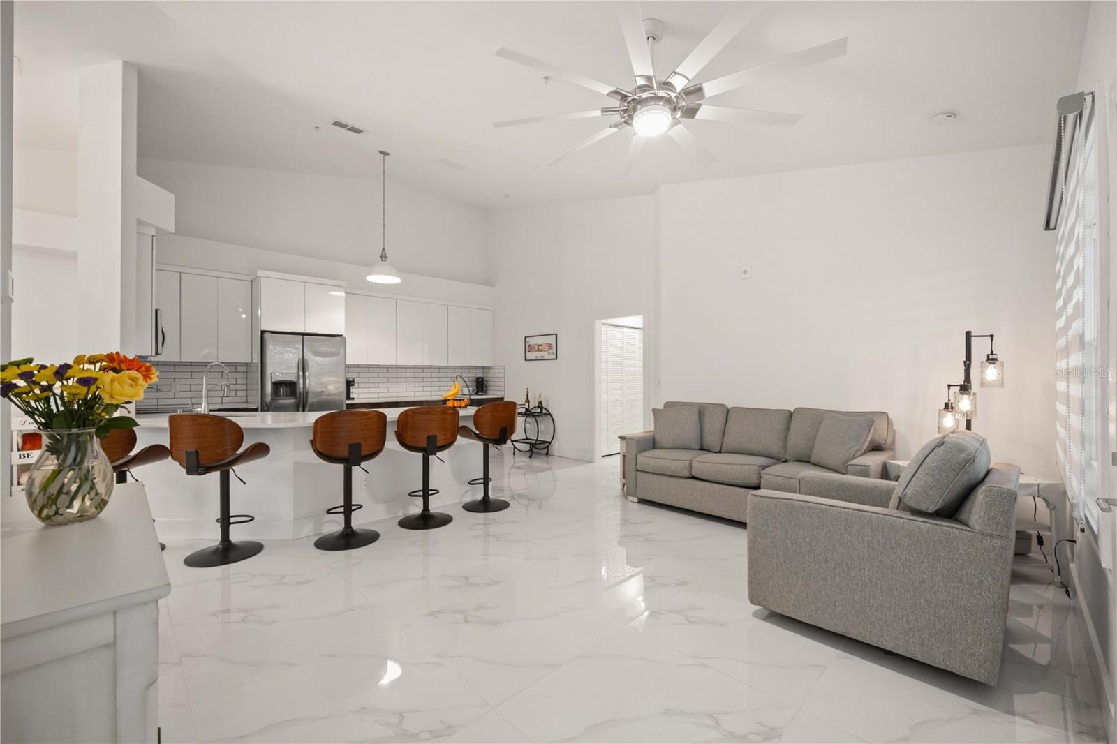 Welcome to this beautifully designed, partially furnished second floor condo that perfectly blends comfort and convenience. Soaring vaulted ceilings create an airy atmosphere, while the popular split bedroom floor plan offers both privacy and an open and inviting flow. The primary suite serves as your private retreat, complete with an en suite bath and spacious walk in closet. The modern kitchen is a standout, featuring stainless steel appliances, sleek quartz countertops and a generous breakfast bal ideal for casual dining or entertaining. Ceramic tile flooring flows seamlessly throughout , enhancing the home's clean and cohesive design. For added practically, a full size washer and dryer are included. Come see for yourself what a great little find this community is with its community pool and ideal location. Close to beaches, golf, shopping, restaurants, and medical facilities.