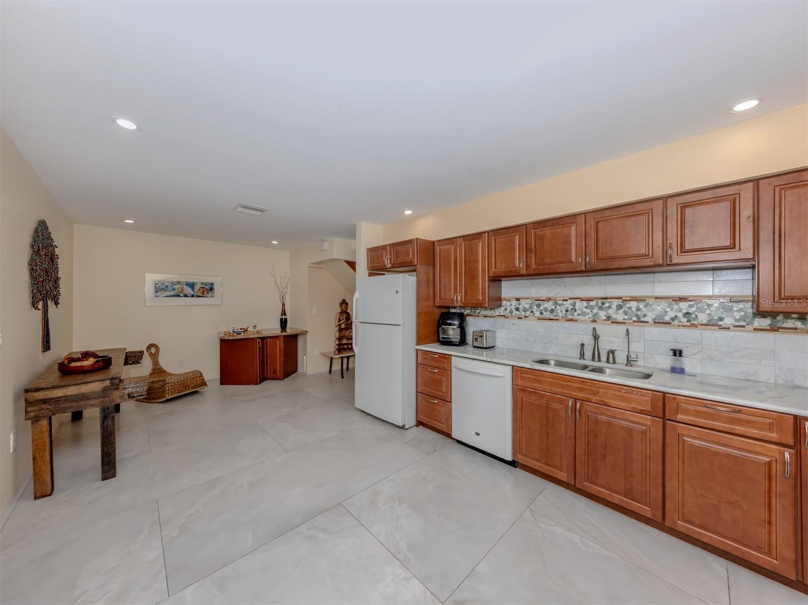 Charming Contemporary Loft Retreat!! Discover the perfect blend of charm and modern style in this beautifully designed 2 bedroom 2 bath home plus a large loft. Kitchen is open and spacious with self close drawers The open concept living area features soaring ceilings, abundant natural light and a cozy wood burning fireplace that adds warmth and character.Thoughtful updates complement the homes inviting feel while the very private lush tropical landscaping offers a tranquil setting to relax and unwind with your morning coffee or your 5 O'clock happy hour. It also features a newer privacy fence, and this lovely house sits on 2 1/2 lots that boasts fruit trees and flowering trees. It's a gardeners delight. This terrific property combines comfort, sophistication and a serene ambience-ideal for those seeking a peaceful retreat close to everything. This home is very unique and has surprises at every turn. A 2 car garage with lots of extra storage. There are also hurricane shutters Lots of insulation in attic and a newer hot water heater. Very Close to the island restaurants, the beach, and the South Venice Ferry.