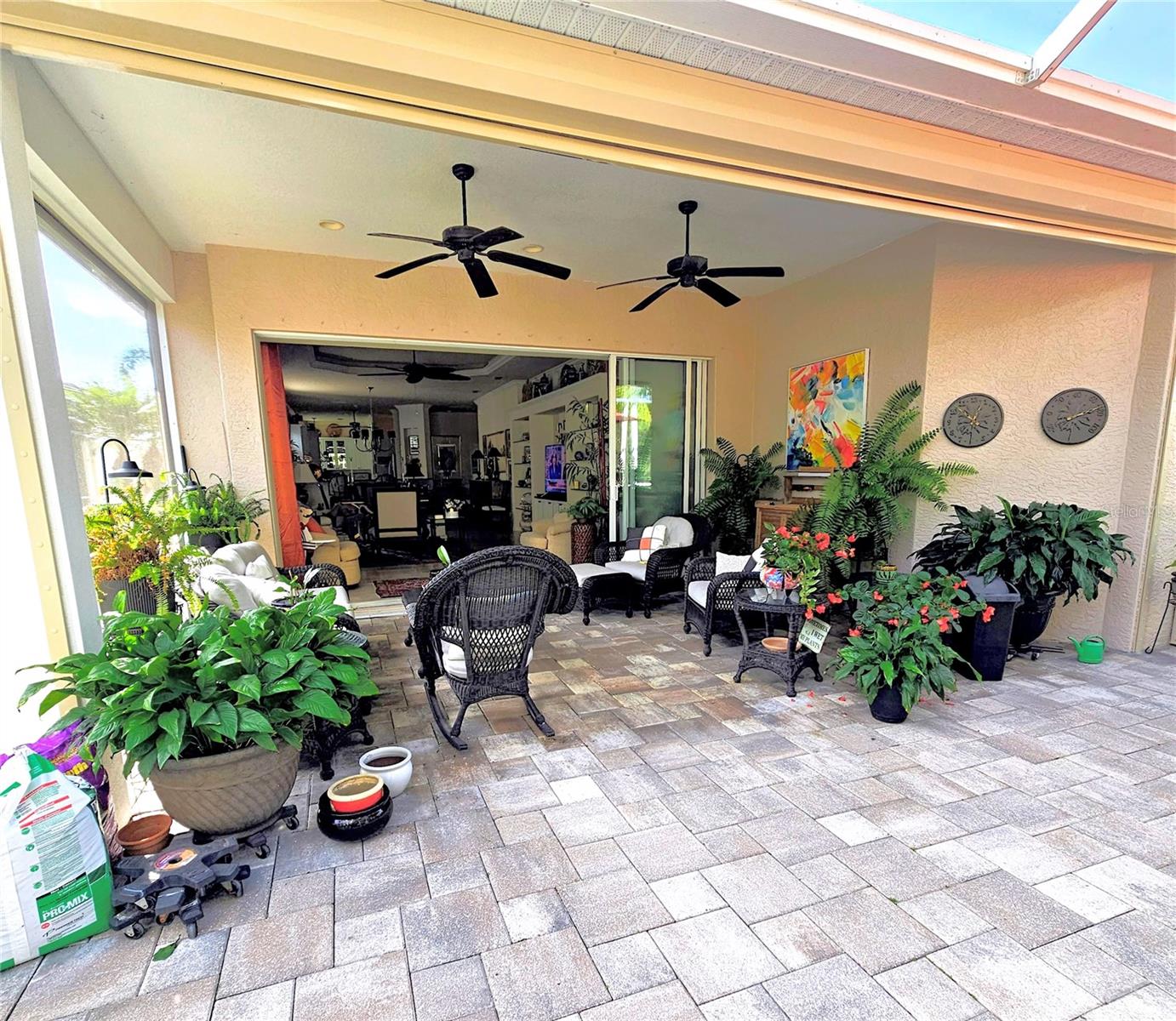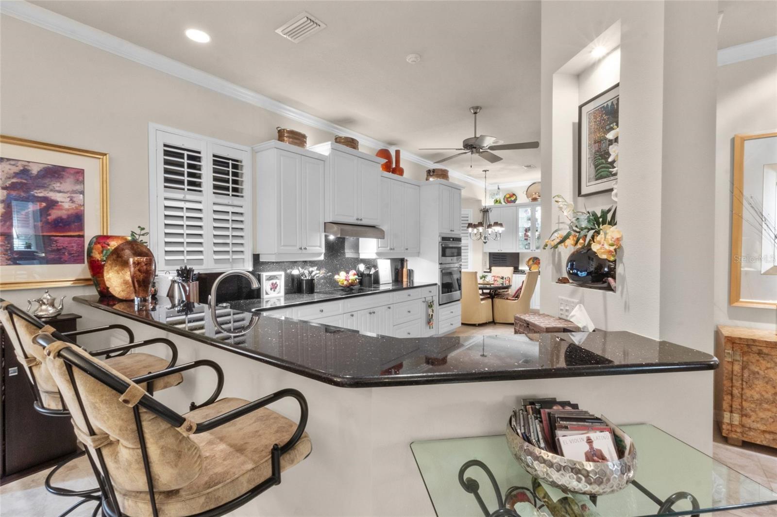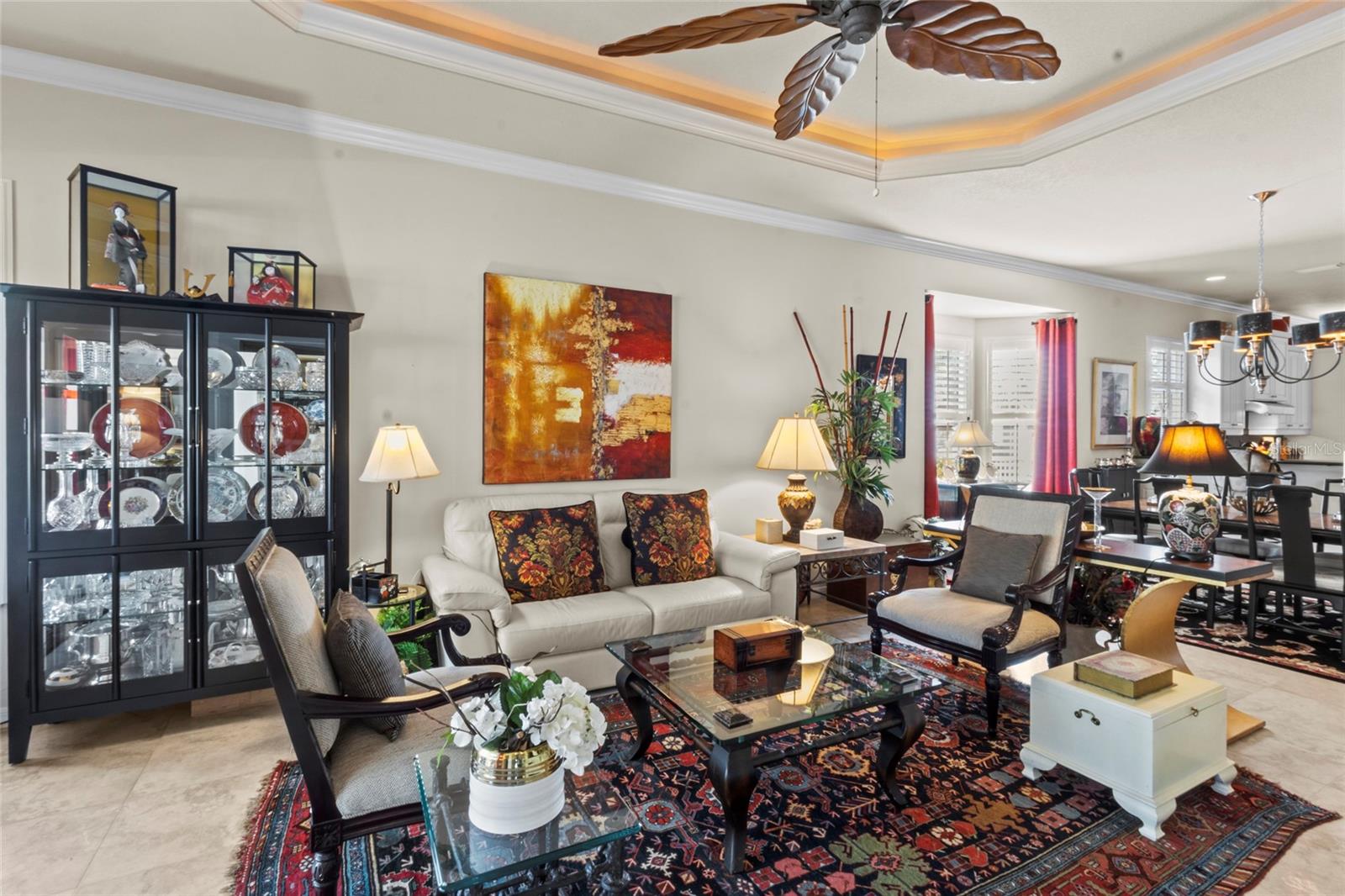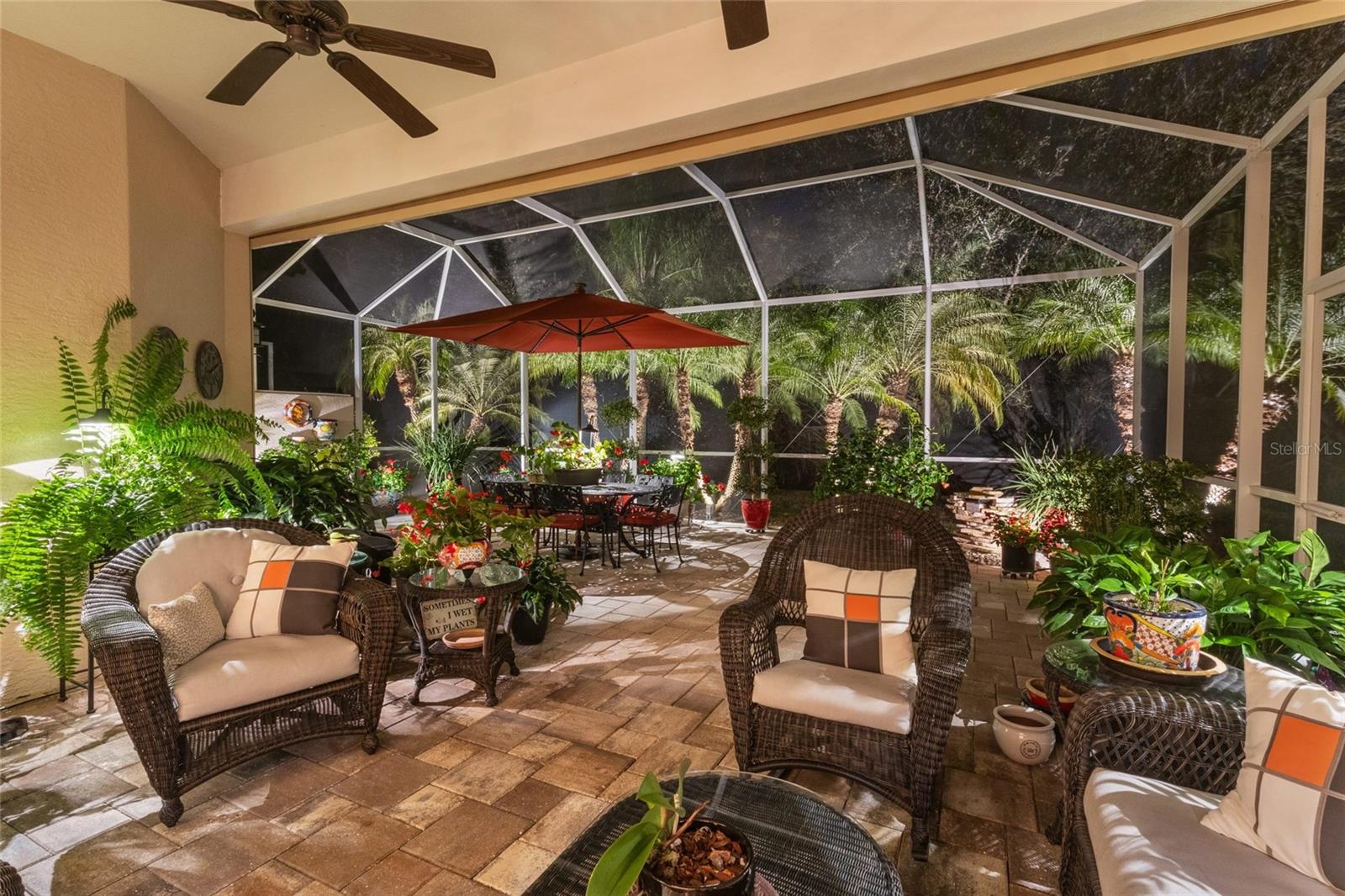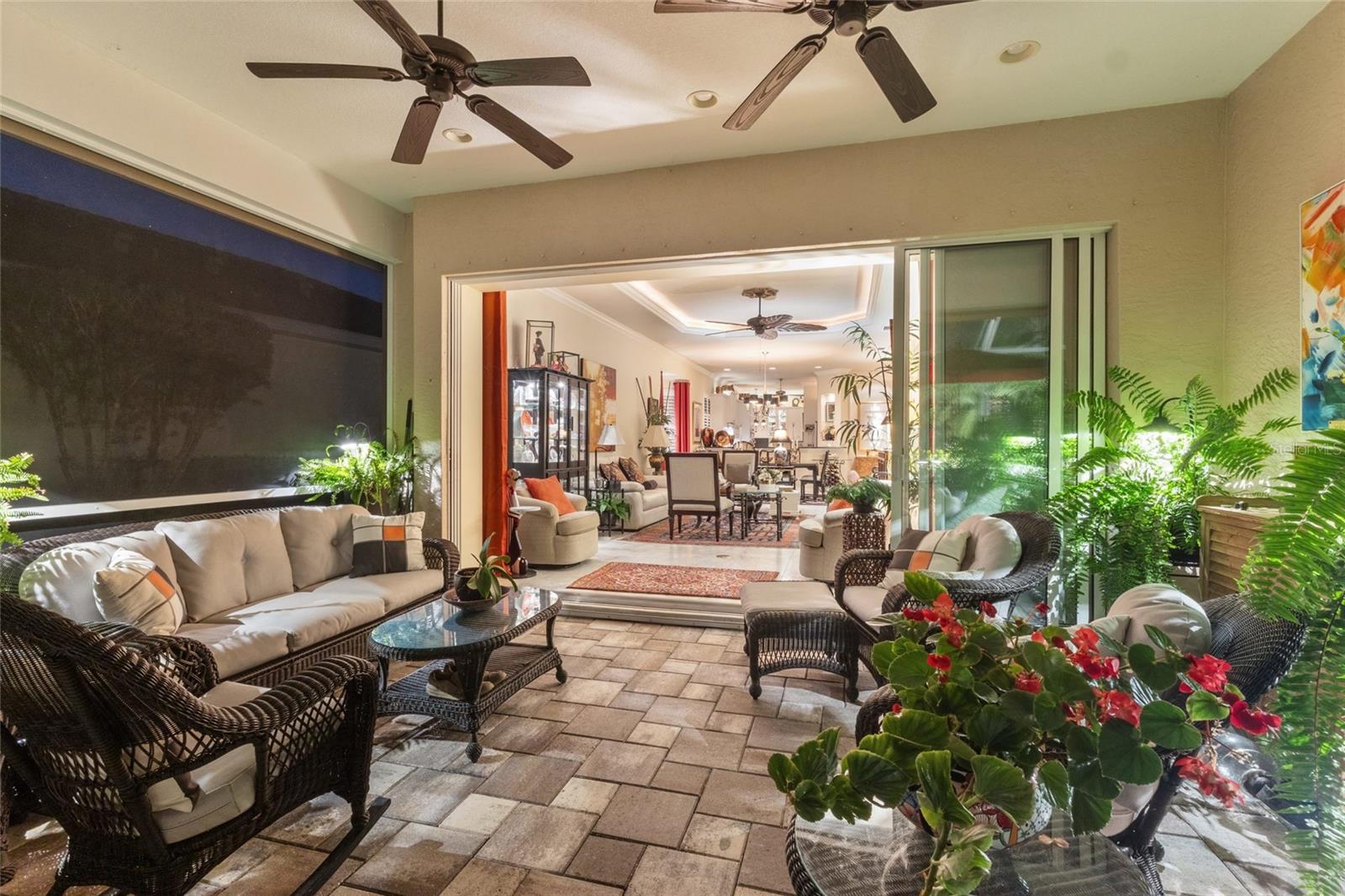 Discover easy, maintenance-free living where everything is handled for you, giving you more time to enjoy the Florida lifestyle. Exterior insurance, roof reserves, lawn care, pest and termite protection, exterior painting, and discounted high-speed internet are included in the quarterly fees. The community offers two pools, a resident-run clubhouse, no CDD fees, and optional membership at Plantation Golf & Country Club for golf, tennis, pickleball, fitness, dining, and social activities. This patio home stands out for its exceptional storage. The primary suite includes two walk-in closets, and the guest suite features another large walk-in closet plus pull-down attic stairs leading to a finished storage room—a rare and valuable feature in Florida homes. Inside, the home is bright and welcoming with neutral tile floors, plantation shutters, crown molding, and tray ceilings. The kitchen has crisp white cabinets, granite countertops, double ovens (2023), induction cooktop with hood vented to outside, Bosch dishwasher (2023), a walk-in pantry, breakfast bar, and an eat-in area framed by a bay window and additional cabinetry. The oversized screened lanai feels like a private tropical oasis, surrounded by lush landscape that creates complete privacy. A bubbling fountain and low-voltage lighting make this space perfect for relaxing or entertaining. Additional highlights include an inside laundry with utility sink, extra cabinetry and counter space, an epoxy-coated garage floor (2025), interior paint (2024), and a new HVAC system with blue light technology (2020). The home is fully storm-ready with impact glass windows, motorized roll-down Kevlar hurricane screen on the covered lanai, and accordion shutters at the primary bedroom slider—allowing quick and complete protection. A third bedroom currently serves as a den/office, offering flexible space for work or hobbies. Immaculately maintained and thoughtfully upgraded, this home offers the rare combination of maintenance-free living, privacy, and exceptional storage in a highly desirable Venice community.
