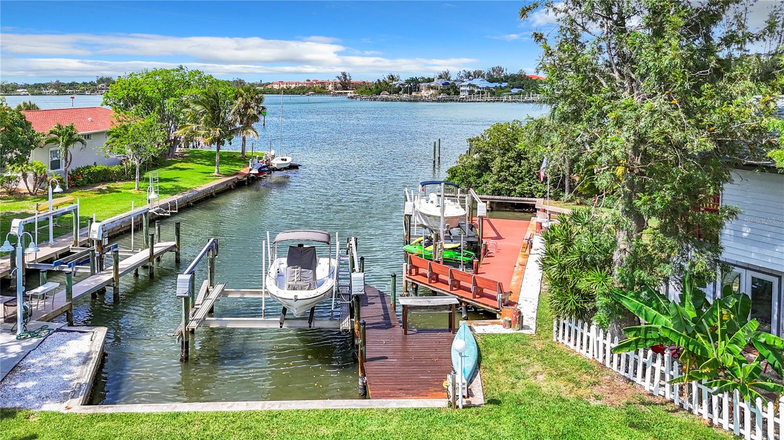This exceptional home is perfectly positioned on the coveted north end of Venice Island, offering nearly a half-acre of prime waterfront living along the Intracoastal Waterway. With a 12,000-lb. electric boat lift and no bridges to the Gulf of Mexico, this property is a dream for avid boaters and water enthusiasts. Directly across from the Roberts Bay Sports Boating Area and just moments from the Yacht Club and Venice Youth Boating Association, the location delivers unmatched access to world-class recreation. Whether you envision a full remodel or a complete custom rebuild, this homesite provides extraordinary potential. Conveniently located just minutes from the Venice Island Airport, golf, tennis, pristine beaches, and the charming downtown Venice Avenue—known for its dining, boutique shopping, farmers market, and year-round festivals—this is one of the most desirable lifestyle settings on the island. Inside, the home has already begun its transformation, featuring new tile flooring throughout the main living area. The entrance welcomes you with abundant natural light from the southern exposure. The expansive great room and dining area boast cathedral ceilings and stunning water views through fully collapsing sliding glass doors that seamlessly blend indoor and outdoor living. The bright, spacious kitchen is appointed with light cabinetry and Corian countertops. A newly enhanced second primary suite offers an impressive walk-in closet with custom built-ins. The main primary suite is generously sized, complete with a Jacuzzi tub overlooking the water—an ideal retreat for relaxation. The outdoor living area is designed for comfort and entertainment, featuring a large, covered lanai with cool deck flooring and ample dining space. The well-maintained saltwater pool provides a serene vantage point to enjoy peaceful ICW views in total privacy. An oversized two-car garage adds exceptional functionality, offering abundant storage, workspace, and an adjacent laundry room. This split-bedroom ranch home is a rare opportunity to secure an extraordinary waterfront property in one of Venice Island’s most sought-after locations.