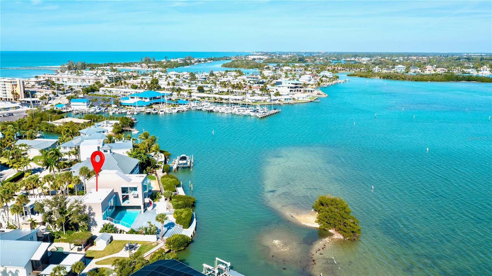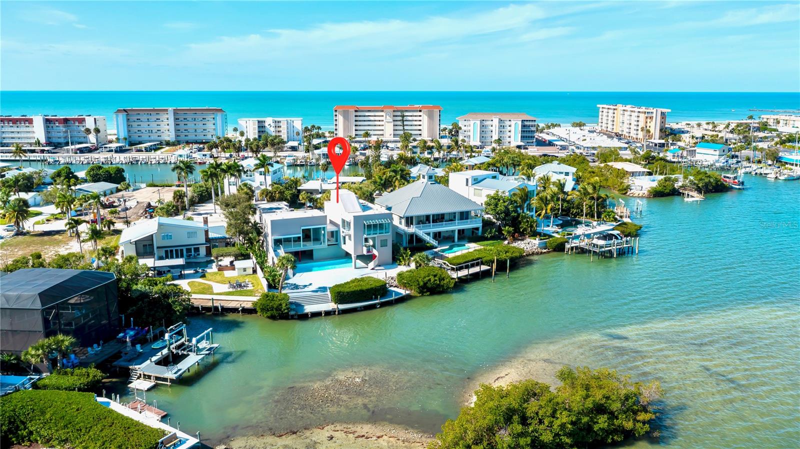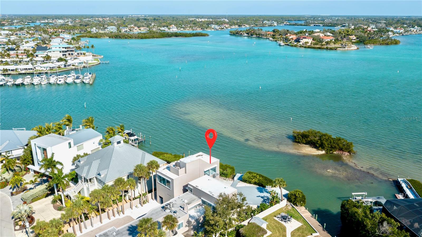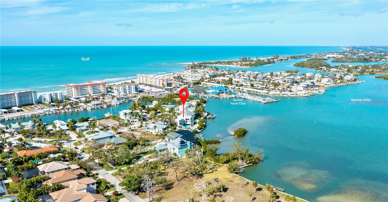 One or more photo(s) has been virtually staged. Bayfront VENICE ISLAND • Designed by architect Carl Abbott • 0.5 mi to Venice Beach • 1.0 mi to Historic Downtown Venice • Roof deck with observation platform. Set on the bayfront along Roberts Bay, this architecturally significant residence designed by Carl Abbott blends sculptural form with experiential living. Located along El Dorado Drive in Venice, the home spans approximately 4,990 square feet with five bedrooms, 3 full baths, and 3 half baths organized into distinct public and private living zones for both entertaining and retreat. Expansive windows, decks, and open courts frame panoramic water views while maintaining privacy from neighboring properties. The private wing includes a multi-level primary suite featuring a glass floor overlooking the pool and a skylight visible from the ground level, creating a direct visual connection to the sky. Curved interior walls guide movement throughout the home, contrasting with the clean-lined exterior massing. A rooftop observation area offers elevated views of Roberts Bay and the Gulf, the night sky, and beautiful sunrises. Exterior security shutters function as architectural elements while providing heat control and storm protection. Two outdoor environments enhance livability: a west-facing private entrance courtyard and an open bay-side court integrated with the landscape. A deep scuba training pool adds a rare recreational feature, while the attached garage provides secure parking. Conveniently positioned approximately 0.5 miles from Venice Beach and 1.0 mile from Historic Downtown Venice, the property is also close to dining, shopping, cultural venues, parks, golf courses, and the Legacy Trail. This bayfront residence offers architectural distinction, privacy, and proximity to the best of coastal Venice living.