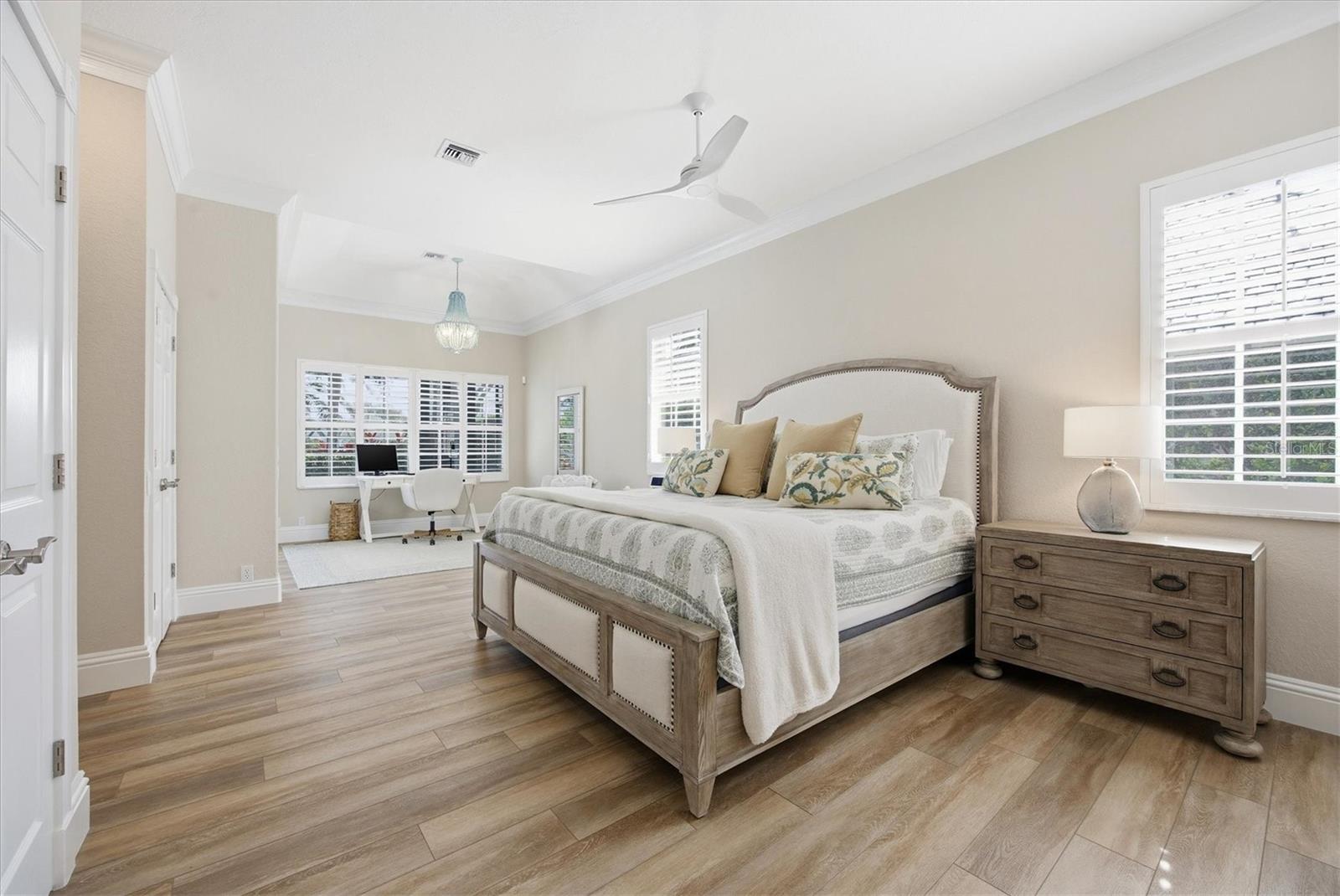 Welcome to this meticulously maintained and stunning residence, where every major system has been recently upgraded for ultimate peace of mind. The home and pool have been thoughtfully updated since 2019 and are complemented by upgraded GE and Thermador appliances. This spacious home offers three bedrooms, four-and-a-half bathrooms, a dedicated office, and an additional flex room that can serve as a fourth bedroom or second office. All bedrooms feature en suite bathrooms, providing comfort and privacy for family and guests alike. Recent high-value upgrades include a brand-new tile roof (2024) and enhanced attic insulation (2024), maximizing energy efficiency. Curb appeal is exceptional with a new paver driveway (2023) and refreshed landscaping. Inside, enjoy pristine water quality with a whole-home water softener and reverse osmosis system. Additional major improvements include a new hot water heater (2025) and pool heater (2025). A whole-house generator ensures reliability and preparedness during any weather event. The home is situated on an oversized corner lot, adjacent to the 4th green and 6th fairway of the Bobcat Course at Plantation Golf & Country Club. Membership to PGCC is optional, offering flexibility, and includes access to golf, tennis, pickleball, social events, and a variety of membership options. Conveniently located just minutes from Wellen Park Downtown and the Atlanta Braves Spring Training facility, this home combines luxury, location, and lifestyle. HOA fees are very reasonable for a community of this caliber, at just $1,900 annually.