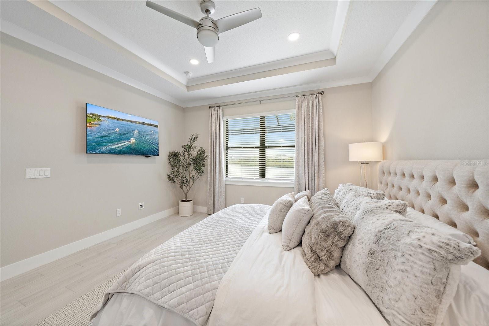 **DESIGNER FURNITURE (partial or all) and GOLF CART AVAILABLE FOR PURCHASE SEPARATELY OR INCLUDE INTO PROPOSAL.** Customized Toll Brothers Rosehall paired villa is loaded with top-of-the-line builder options PLUS additional custom upgrades after purchase including trim work, designer finishes and a huge expanded lanai with lake and fountain views. This beautifully maintained home features 2 bedrooms, 2 bathrooms, and a versatile flex room with a hidden bonus closet—currently styled as an office/TV room/guest space and easily used as a third bedroom. This home features tile flooring throughout, and the 2-car garage features an epoxy-coated garage floor. Notice the upgrades to this home and attention to detail: from the designer lighting & ceiling fans, custom doors, and elegant custom molding and trim work throughout, including eye-catching accent walls in the hallway and flex room. The executive gas kitchen, complete with built-in KitchenAid appliances, quartz counter tops, large island & custom pantry door. The guest bathroom is equally impressive, showcasing a UPGRADED gorgeous walk-in shower with upgraded tile and a luxury rain shower head in addition to the handheld. Open the back glass sliders to your huge expanded lanai that wraps around the back of the villa, featuring a picture-frame screen that creates unobstructed, postcard-worthy views of the serene lake and fountain—a true showstopper and the ideal place to relax morning or night. Schedule your private showing today.