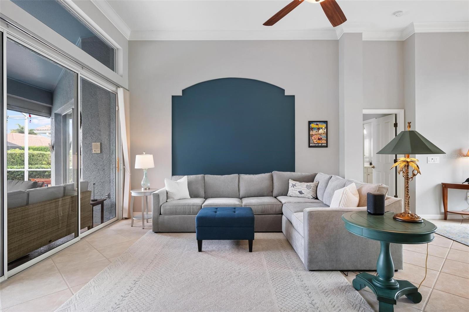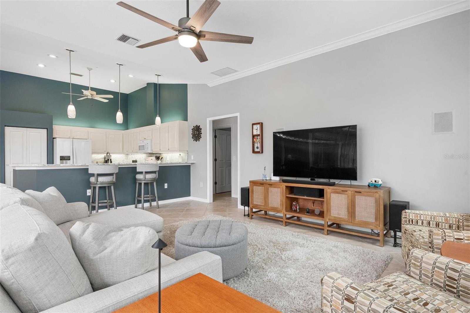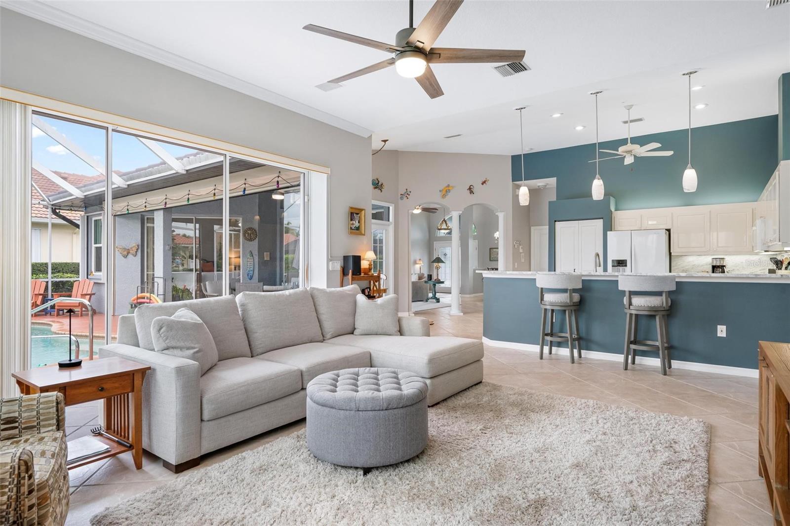 Visually striking from the moment you arrive, this exceptionally well-cared-for Aruba 3 by J & J Homes showcases outstanding curb appeal and thoughtful updates throughout. This 3-bedroom, 2-bath pool home with an oversized 3-car garage welcomes you through double leaded-glass entry doors into a light-filled foyer with soaring 12-foot ceilings, crown molding, and a wall of glass overlooking the lanai and pool. Architectural details abound, including tall crown molding, transom windows, wall niches, and refined finishes that elevate every space. The desirable split floor plan offers privacy for family and guests, while large-format diagonal porcelain tile enhances the living areas and vinyl laminate flooring in the bedrooms ensures a clean, carpet-free lifestyle. The expansive living spaces open effortlessly to the outdoors through three sets of 8-foot sliding glass doors in the living room, great room, and primary suite—creating a seamless indoor-outdoor experience. At the heart of the home, the open island kitchen impresses with beautiful granite countertops and a charming dinette framed by an aquarium window overlooking the pool and lush landscaping. The spacious primary suite features custom closet built-ins and a generous bath with dual vanities and a walk-in shower. Outdoor living shines within the covered lanai and caged pool, surrounded by native tropical foliage—your own private retreat. Major updates include a new barrel tile roof in 2025 with transferable warranty, fresh interior and exterior paint, and full storm protection with impact glass front windows and hurricane shutters throughout. Pride of ownership is evident at every turn, with a full list of upgrades available. Centrally located just minutes from beaches, historic Downtown Venice, Downtown Wellen Park, and abundant shopping and dining, this home is set within a community with a modest HOA and no CDD fees, ensuring lasting beauty and exceptional value.