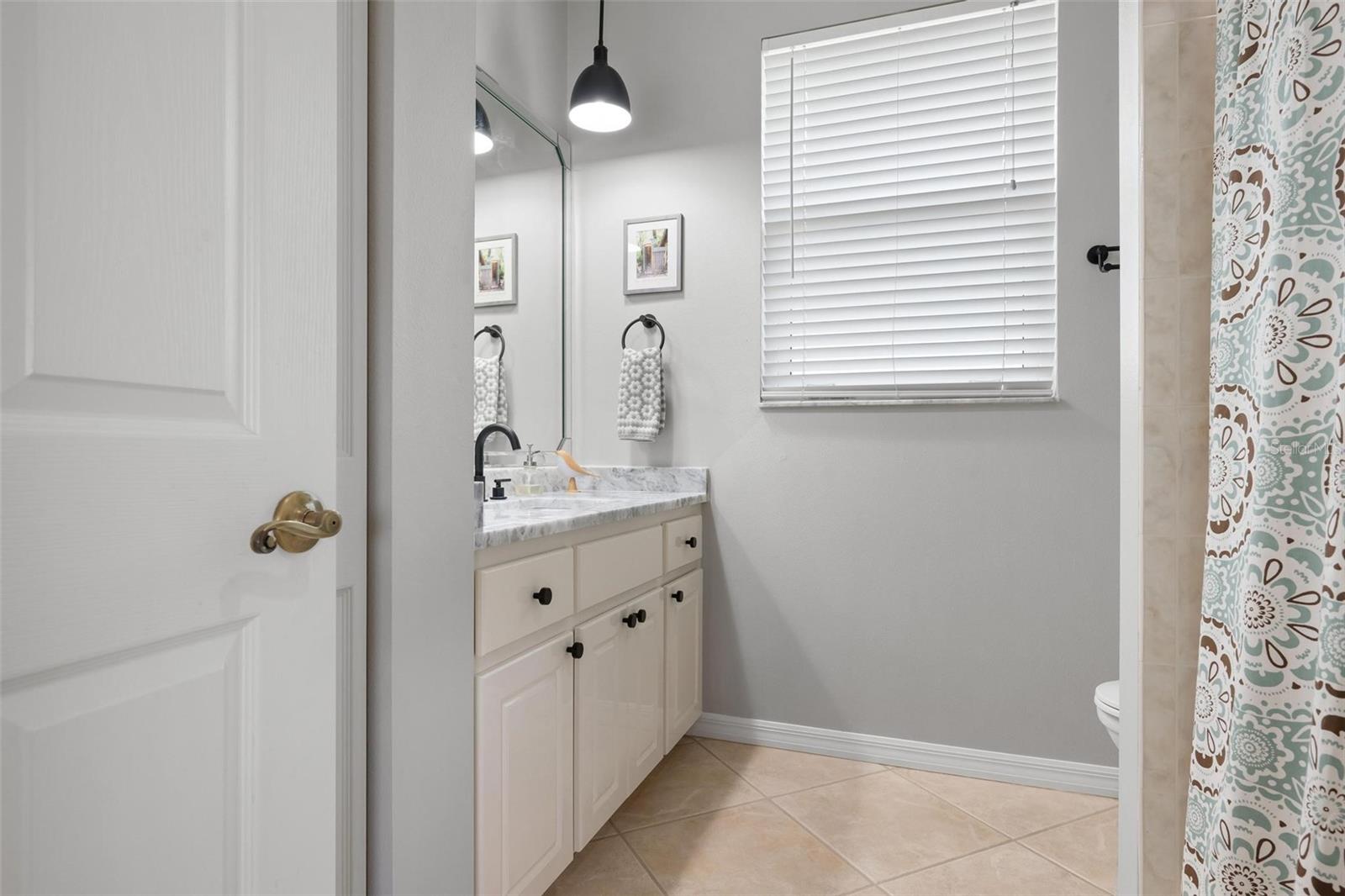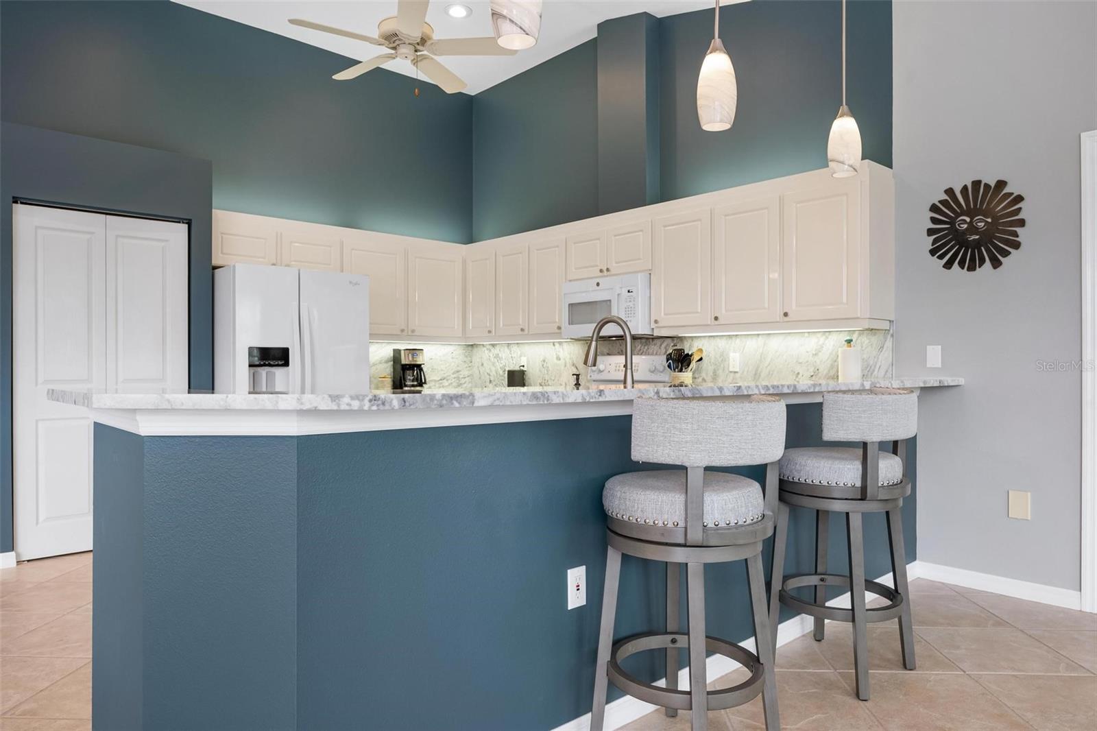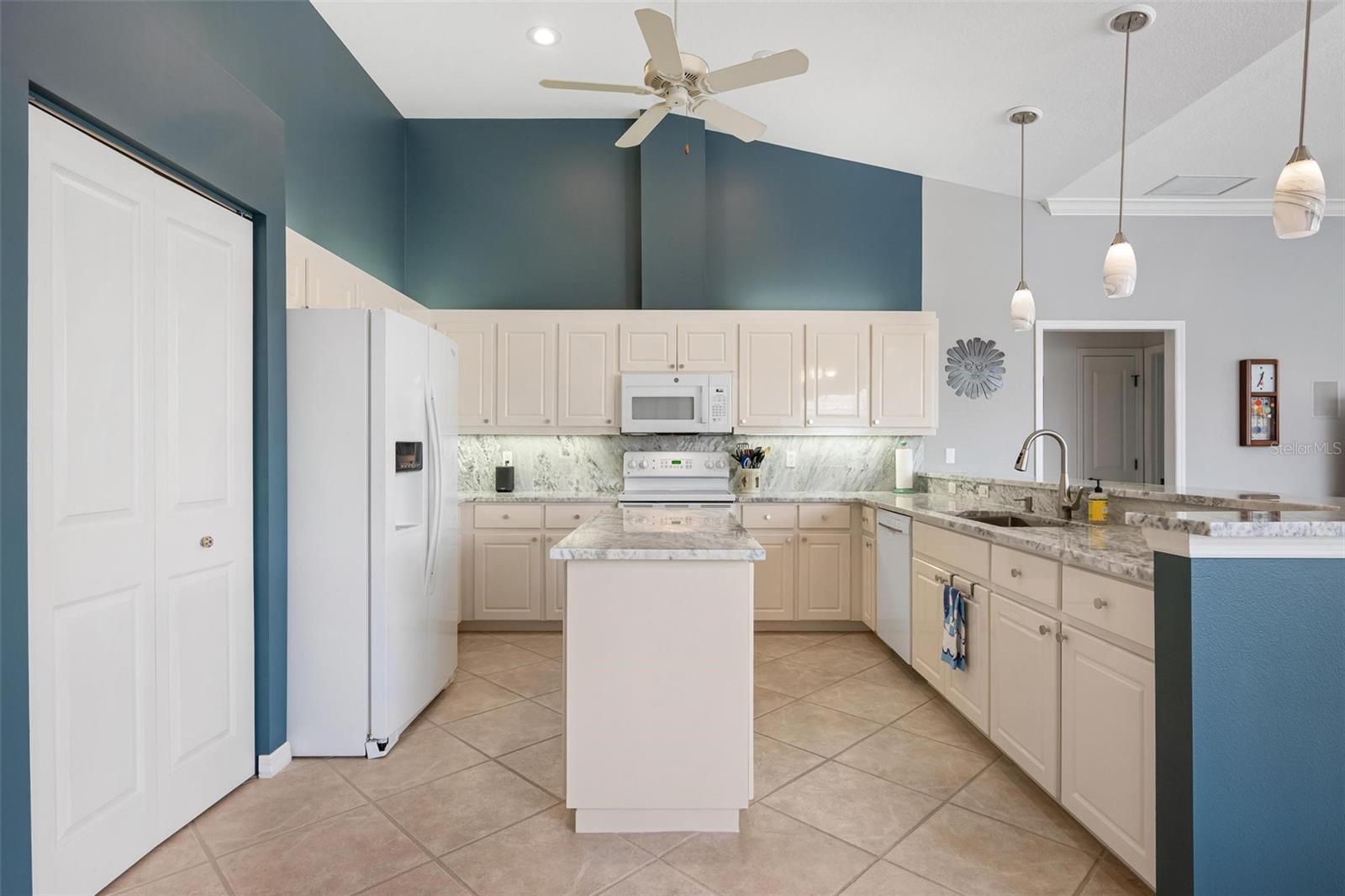 Visually striking from the moment you arrive, this exceptionally well-cared-for Aruba 3 by J & J Homes showcases outstanding curb appeal and thoughtful updates throughout. This 3-bedroom, 2-bath pool home with an oversized 3-car garage welcomes you through double leaded-glass entry doors into a light-filled foyer with soaring 12-foot ceilings, crown molding, and a wall of glass overlooking the lanai and pool. Architectural details abound, including tall crown molding, transom windows, wall niches, and refined finishes that elevate every space. The desirable split floor plan offers privacy for family and guests, while large-format diagonal porcelain tile enhances the living areas and vinyl laminate flooring in the bedrooms ensures a clean, carpet-free lifestyle. The expansive living spaces open effortlessly to the outdoors through three sets of 8-foot sliding glass doors in the living room, great room, and primary suite—creating a seamless indoor-outdoor experience. At the heart of the home, the open island kitchen impresses with beautiful granite countertops and a charming dinette framed by an aquarium window overlooking the pool and lush landscaping. The spacious primary suite features custom closet built-ins and a generous bath with dual vanities and a walk-in shower. Outdoor living shines within the covered lanai and caged pool, surrounded by native tropical foliage—your own private retreat. Major updates include a new barrel tile roof in 2025 with transferable warranty, fresh interior and exterior paint, and full storm protection with impact glass front windows and hurricane shutters throughout. Pride of ownership is evident at every turn, with a full list of upgrades available. Centrally located just minutes from beaches, historic Downtown Venice, Downtown Wellen Park, and abundant shopping and dining, this home is set within a community with a modest HOA and no CDD fees, ensuring lasting beauty and exceptional value.