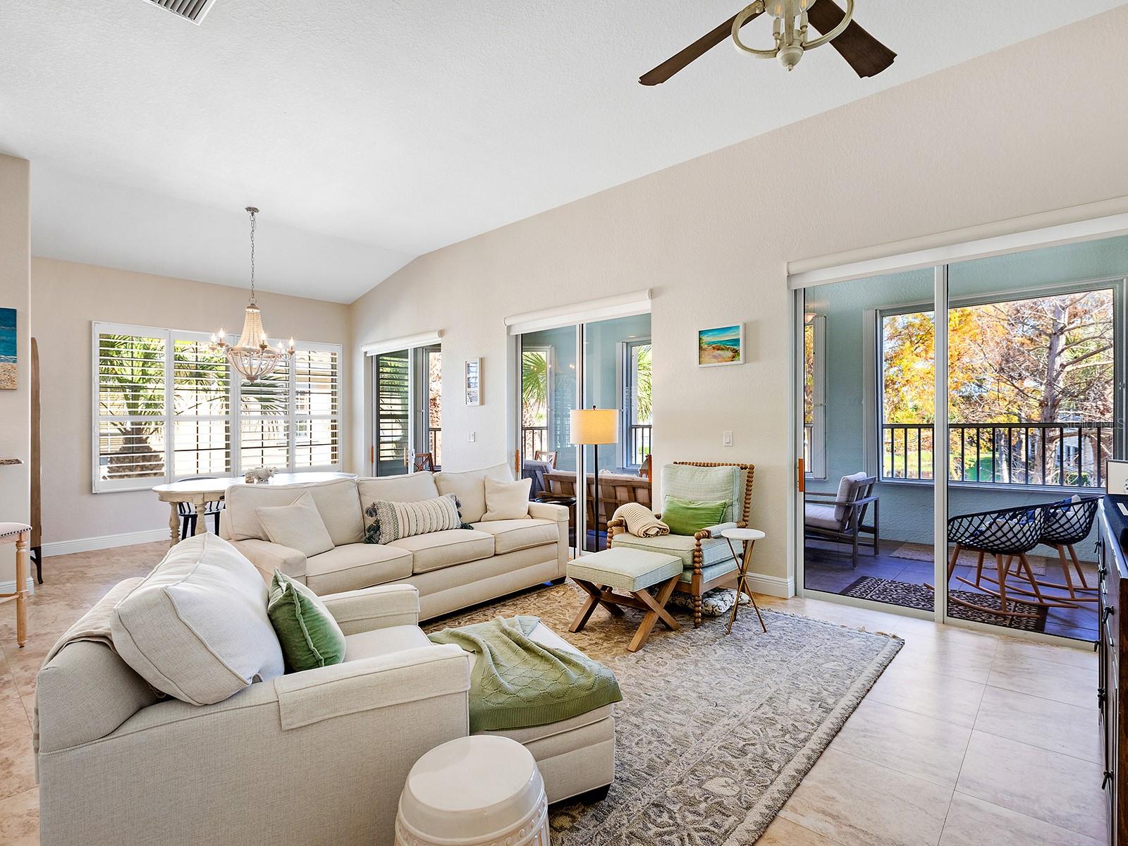 Offered funished, this rare carriage-style lakefront condominium with a sprawling floor plan that lives like a freestanding home. Located within the gated Triano community in the heart of Venice, perfectly situated between the Waterford and Capri Isles Golf Clubs. This architecturally impressive residence showcases soaring 11-foot ceilings, high-end finishes throughout, and a warm, inviting interior complemented by abundant storage. Enjoy a premier central Venice, Florida location with maintenance-free living, concrete construction, hurricane-protected windows, and true lock-and-leave convenience. Serene lake views create a tranquil backdrop, best appreciated from the oversized tiled lanai—an exceptional outdoor living space. Resort-style amenities include a pool, clubhouse, and fitness center. Ask your REALTOR for the full feature sheet—this one is truly special. Some exclusions apply to furnishings. List available upon request.