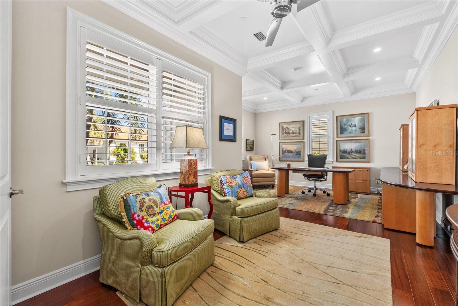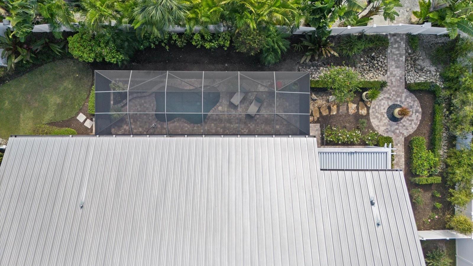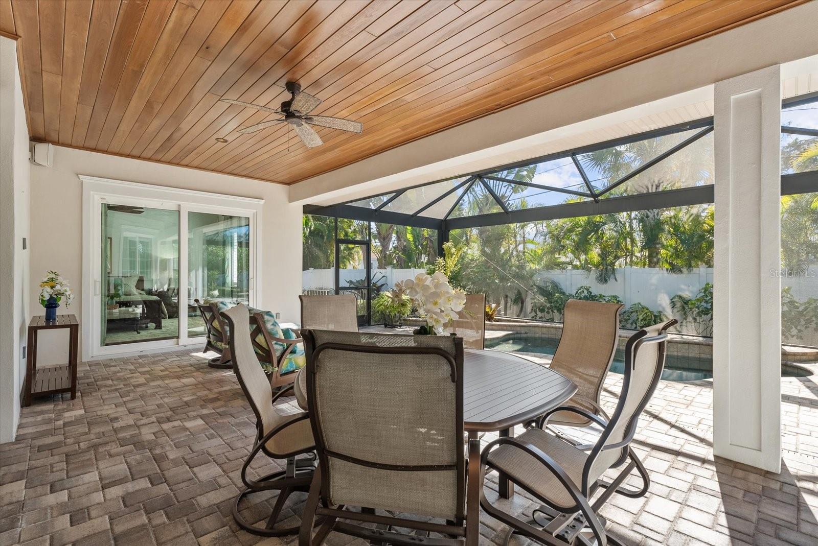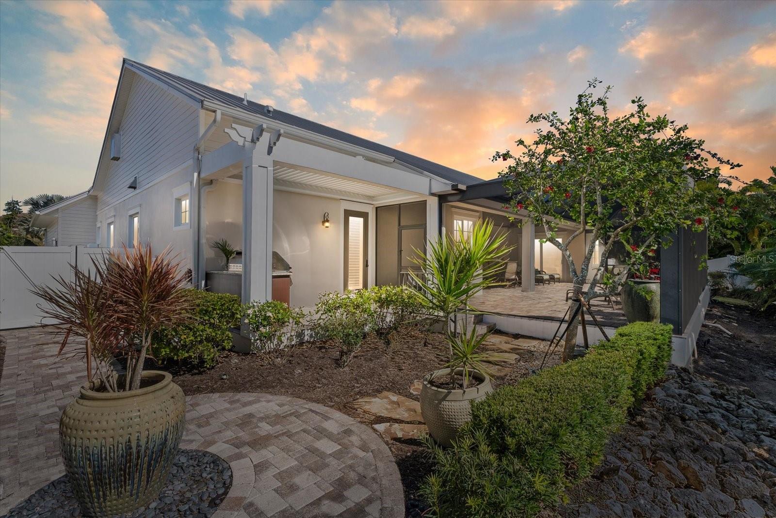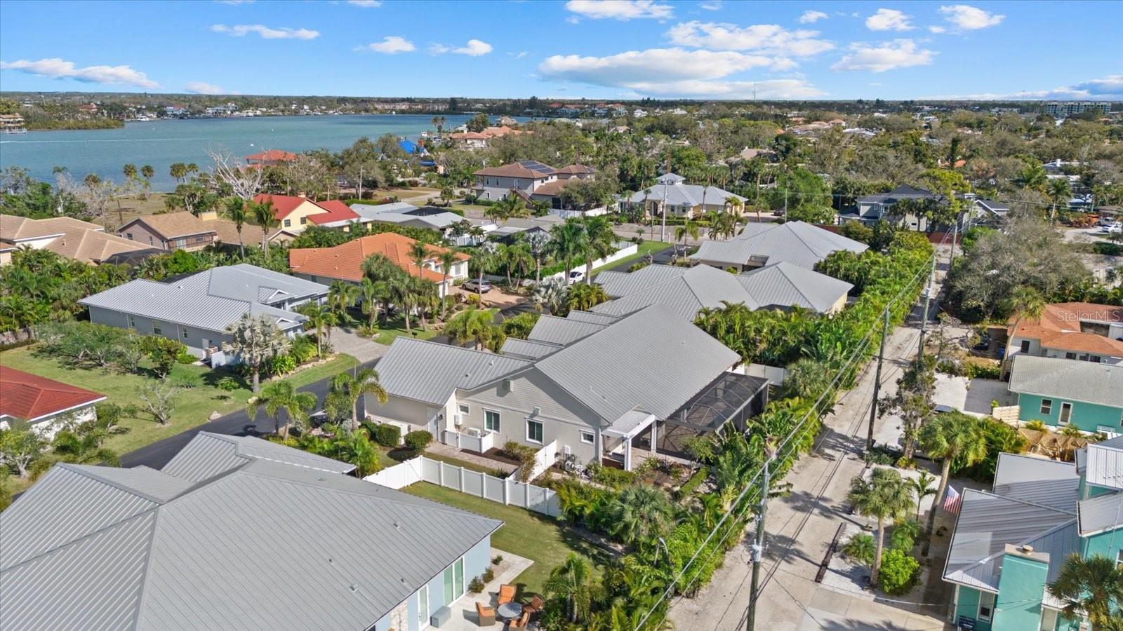 3 BEDROOM. 3 BATH. LARGE DEN/STUDY. POOL. PRIVATE STREET! PGT HURRICANE IMPACT WINDOWS AND DOORS. NO WATER INTRUSION. METAL ROOF. Located on the Island of Venice, this exceptional open-concept, natural light-filled, coastal residence offers refined architectural detail, stunning functional design and true peace of mind. The home has remained high and dry through all storms and features a Generac generator. The elevated entrance leads to a foyer accented by elegant wainscoting, solid-core doors, windows with intricate casings, and a 19- foot cathedral ceiling. The adjoining study/den provides a flexible space for relaxation or home office and features coffered ceilings. The main living area is open to a 13-foot cathedral ceiling finished with tongue and groove, wood beams, surround sound, and grounded by African mahogany engineered hardwood flooring. It is accented by a wet bar with wine storage, a copper sink, and a paneled under counter beverage refrigerator. The kitchen is both elevated and functional, featuring a paneled refrigerator and freezer, induction cooktop, built-in microwave/convection oven, additional built-in oven, and a vented range hood. Custom wood cabinetry is finished with crown molding and seeded glass inlays with integrated lighting, complemented by extended storage above the refrigerator and a spacious custom pantry. The oversized island includes built-in storage and bookcases on either end. Dining space connects effortlessly to the kitchen and living areas. The primary suite is a private retreat with two expansive custom walk-in closets and a beautifully appointed bathroom featuring white shaker cabinetry, split vanities with a dedicated makeup area, exotic granite countertops, built-in medicine cabinets, and double-sided custom vanity mirrors. The spacious shower includes privacy glass and a striking onyx inlay. Guest accommodations are thoughtfully designed to be spacious, with large walk-in closets. One guest bedroom features an en-suite bathroom, while the other guest bathroom is adjacent to the third bedroom. The laundry room offers built-in closets and custom storage, keeping everyday living organized. The garage continues the home’s elevated standard with insulated oversized 9-foot doors, epoxy flooring, electric car charger, generator connection, water blow-throughs, and an elevated entrance. Outdoor living is a highlight. The lanai features tongue and groove ceilings, clear- view screens, and a sliding glass door system that fully pockets away for seamless indoor-outdoor flow. A large patio surrounds the 6-foot-deep propane-heated Pebble Tec spool with custom jets, fountain, and safety fence. Entertaining is enhanced by a gas grill, marine-grade outdoor kitchen cabinetry, buried propane, and a remote-operated Absolute Aluminum pergola. Zoysia grass, extensive landscape and exterior lighting, windows accented with shutters, and a wired security system completes the exterior. Ideally located 1 block from public beach access and approximately 8 blocks from downtown Venice, with boutique shopping and casual or fine dining options, this home offers the perfect balance of island serenity and everyday convenience.