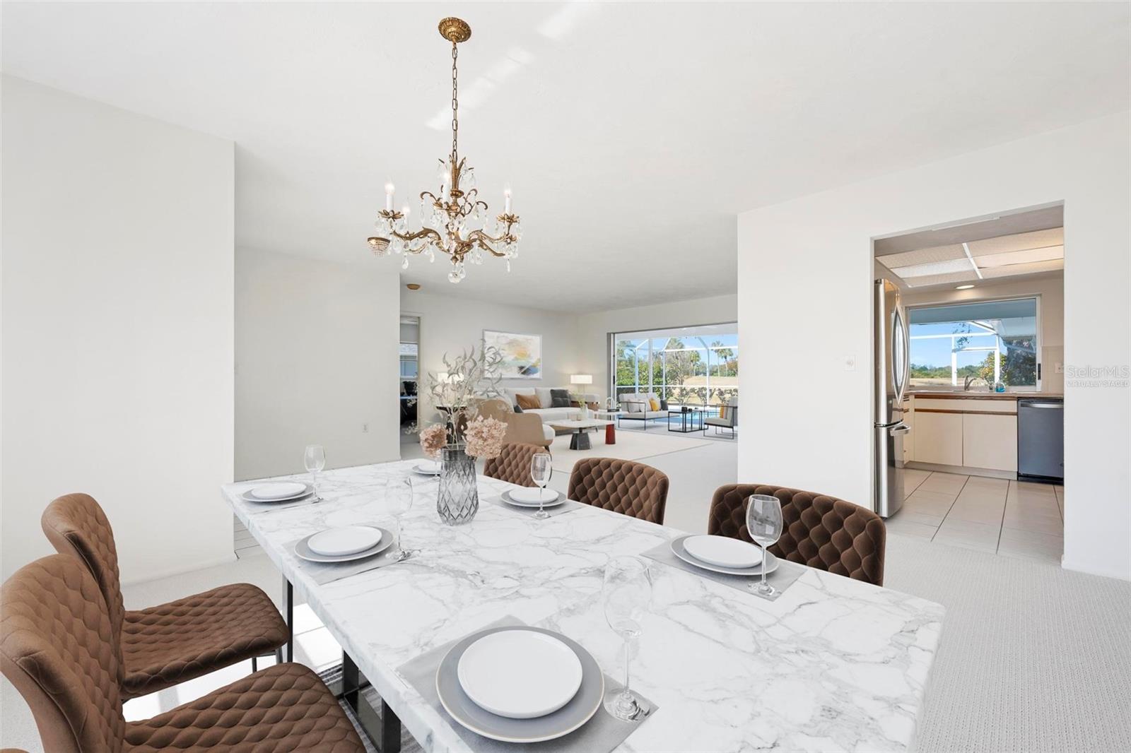 One or more photo(s) has been virtually staged. Perfect opportunity for a buyer ready to create their own vision! This timeless Lincoln Homes split-bedroom design offers 3 bedrooms, 2 baths, a 2-car garage, and a caged pool overlooking the golf course — all in a highly desirable central Venice location. Major mechanical updates provide peace of mind, including a new shingle roof (2020), new A/C (2023), and water heater (2020). Fresh interior paint and brand-new carpeting make the home immediately livable while you plan your updates and personal design touches. The thoughtful split floor plan offers privacy for family and guests, and all three bedrooms feature walk-in closets. Enjoy over 400 square feet of covered lanai space — perfect for entertaining or relaxing by the pool while taking in tranquil golf course views. Located near Jacaranda West Country Club, where you can enjoy the 18-hole course and grill room with or without membership. This excellent central location places you within 15 minutes of area beaches, historic downtown Venice, downtown Wellen Park, CoolToday Park (Spring Training home of the Atlanta Braves), plus abundant shopping and dining. Low HOA fees and no CDD fees add to the appeal. Bring your ideas and unlock the full potential of this well-built home in a fantastic location!