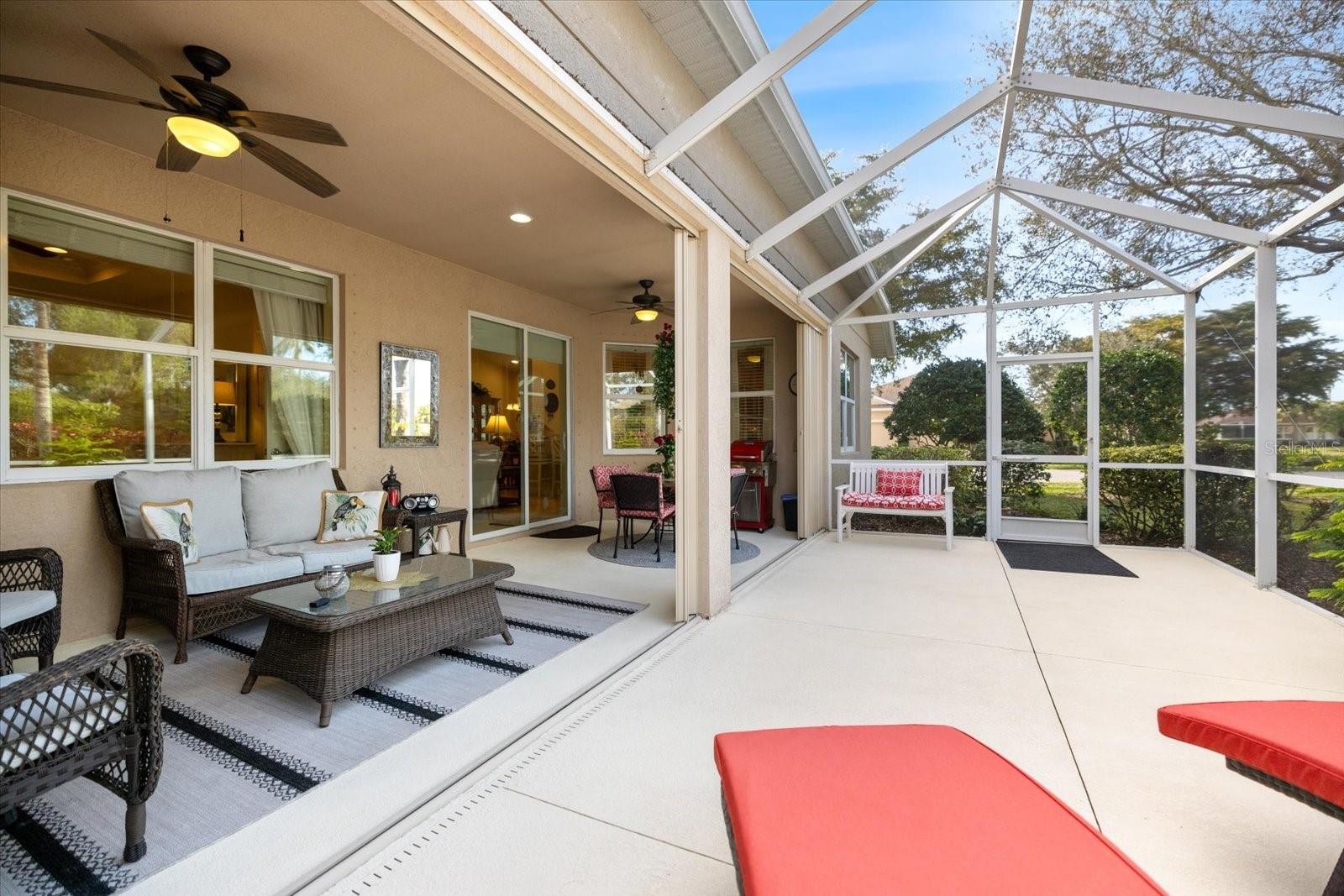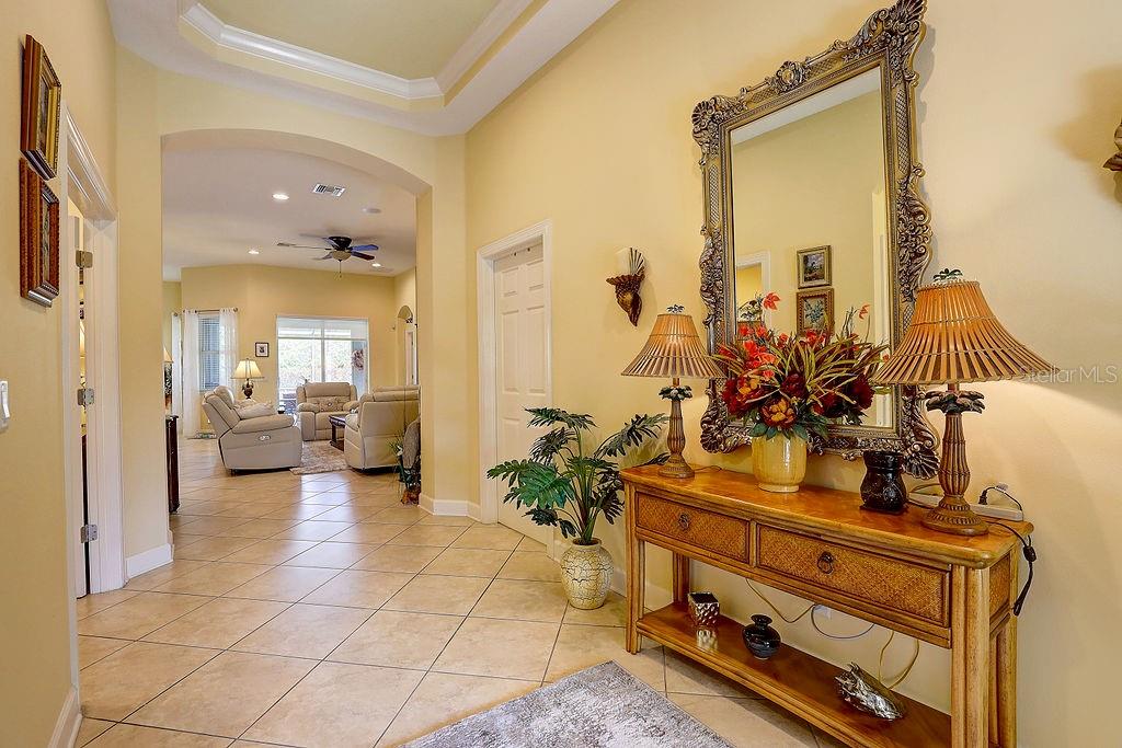 Welcome to one of the most exceptional homes in Verona Reserve—the former Fairmont Model ideally positioned on the largest lot in the entire community, offering rare privacy, expanded outdoor living, and room to add a pool without disturbing the existing extended lanai. This custom-built 3-bedroom, 2-bath residence delivers model-home elegance with extensive recent upgrades and true move-in-ready confidence, located in a gated, maintenance-free neighborhood with very low HOA fees, no CDD, and not in a flood zone. Step through beveled glass double doors into a light-filled interior featuring soaring 11-foot ceilings, tray details, crown molding, and an open-concept layout designed for both entertaining and everyday comfort. Diagonal ceramic tile flooring, designer ceiling fans, custom drapery, and refined finishes create a polished yet welcoming atmosphere. The kitchen offers 42-inch wood cabinetry, solid surface countertops, tile backsplash, stainless steel appliances including new dishwasher, range, and microwave (2025), generous pantry storage, and breakfast bar for gathering. The spacious primary suite features a tray ceiling, dual walk-in closets, double vanities, and a large walk-in shower. One of the most impressive highlights is the 572-square-foot extended covered lanai (22x26), creating a true outdoor living room overlooking lush tropical landscaping on the community’s premier homesite. Recent improvements during 2024-2025 include a new air conditioning system with transferable warranty, new washer and dryer, new bedroom flooring, new tile backsplashes, clear and accordion storm shutters, garage insulation and attic access stairs, laundry room cabinetry, lanai privacy blinds, and freshly painted interior and exterior. Residents enjoy a heated community pool, brick-paver sundeck, sidewalks, dog park, and secure gated entry just minutes from Historic Downtown Venice, beaches, dining, golf, tennis, pickleball, live entertainment daily, medical facilities, I-75, and area airports. This is refined Florida living on the best lot in Verona Reserve—offering space, upgrades, privacy, and long-term value in one of Venice’s most desirable gated communities.
