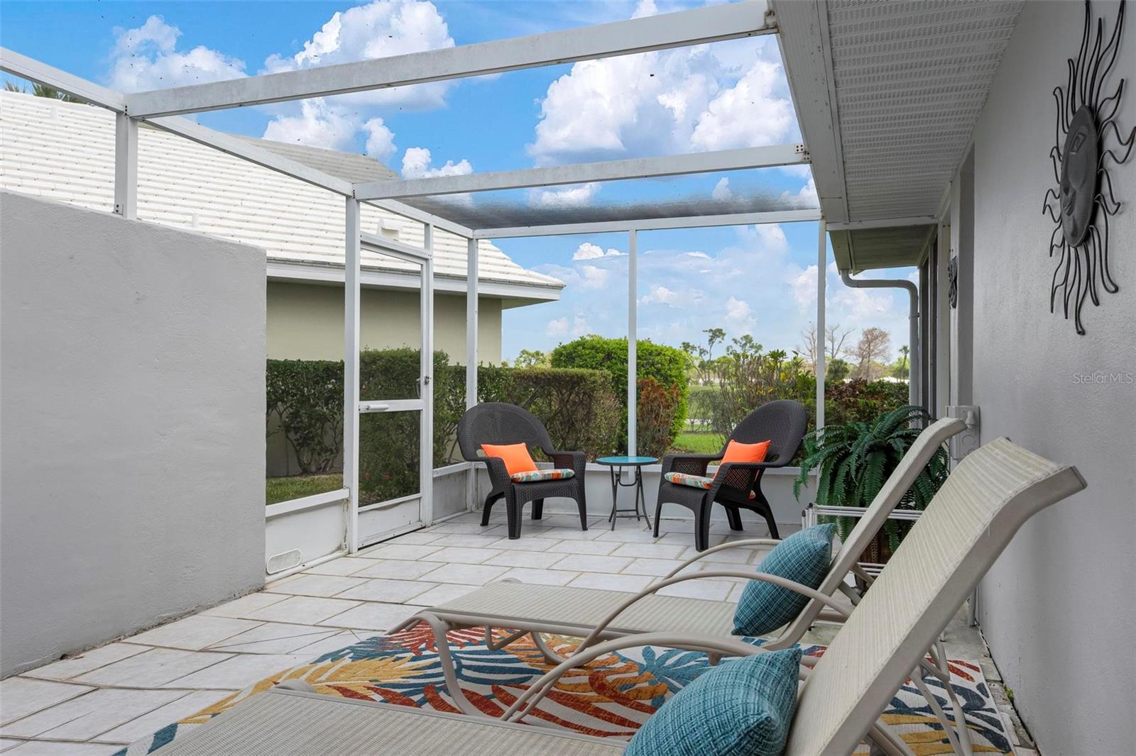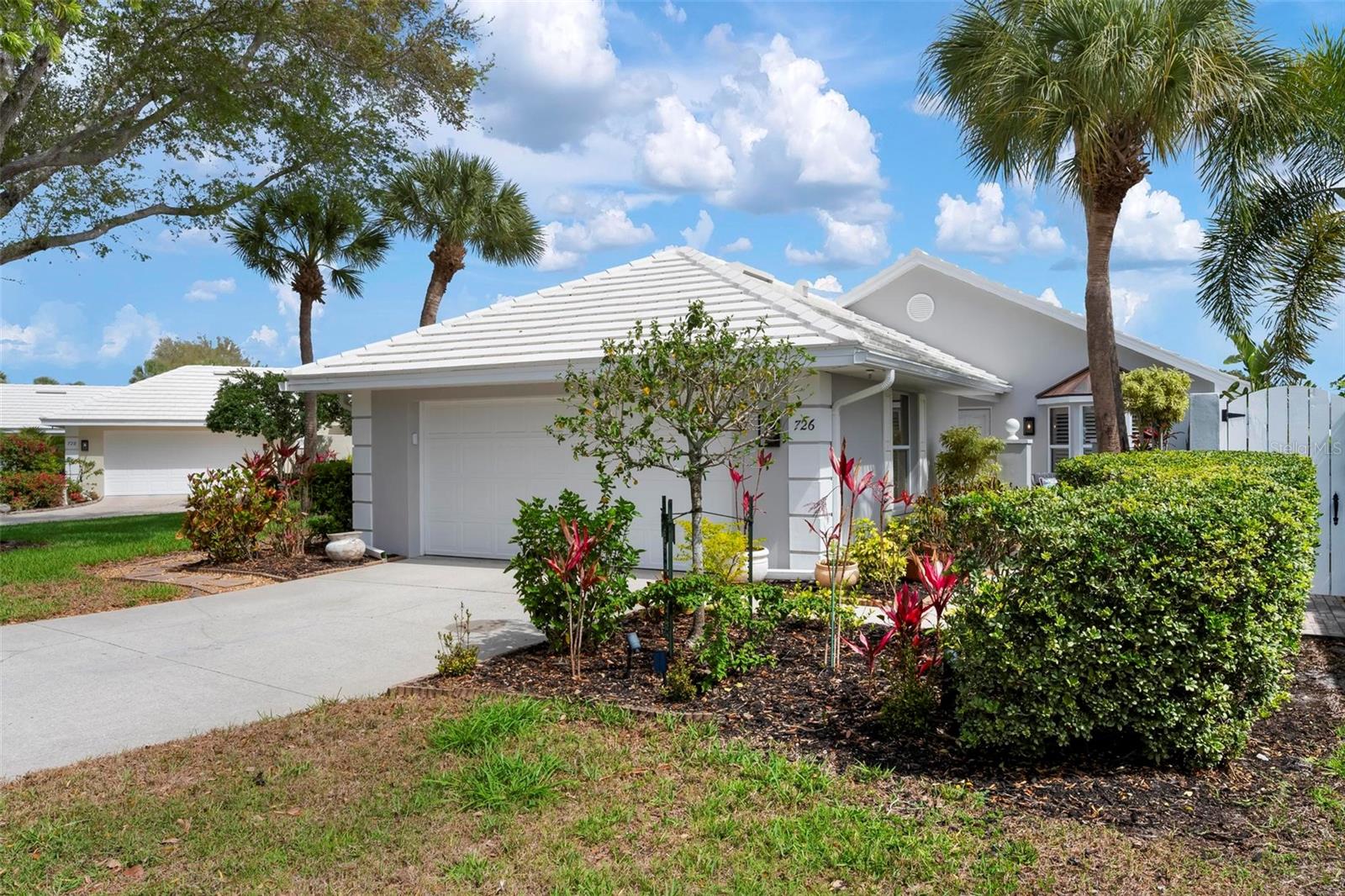 This beautifully appointed 2-bedroom, 2-bath villa with a 2-car garage enjoys what may be the most desirable setting within the Villas of Somerset at The Plantation, where sweeping panoramic golf and water views create an atmosphere of tranquility that is felt the moment you arrive. A charming winding walkway leads to a welcoming courtyard entry accented by copper roofing, colorful glazed planters, tile flooring, and new gutters, setting the tone for a home that is as inviting as it is distinctive. Inside, vaulted ceilings and an open living area bathed in natural light frame the breathtaking scenery beyond, while tile flooring throughout and trendy coastal furnishings give the residence the polished feel of a professionally designed model home. Being offered turnkey furnished, the entire package is thoughtfully curated and ready to enjoy from day one. Outdoor living is truly exceptional, featuring both a screened and covered lanai and an expansive 450+ square-foot caged patio—ideal spaces for morning coffee, sunset cocktails, or simply relaxing while overlooking the lush fairways and shimmering water. Recent updates include a new A/C system in 2025, ensuring comfort and peace of mind. Membership at Plantation Golf & Country Club is optional and offers a variety of lifestyle opportunities including two championship golf courses, pickleball, Har-Tru tennis, bocce, a resort-style pool, fitness center, and multiple social and dining venues. More than just a villa, this residence delivers a true sense of well-being and effortless Florida living—a home perfectly outfitted to enjoy its exceptional location, the tropical climate, and the relaxed elegance of life at The Plantation.
