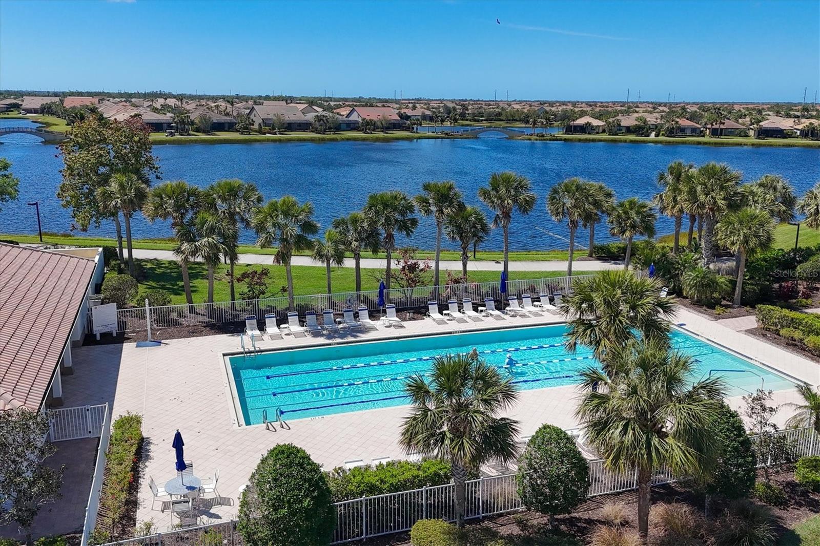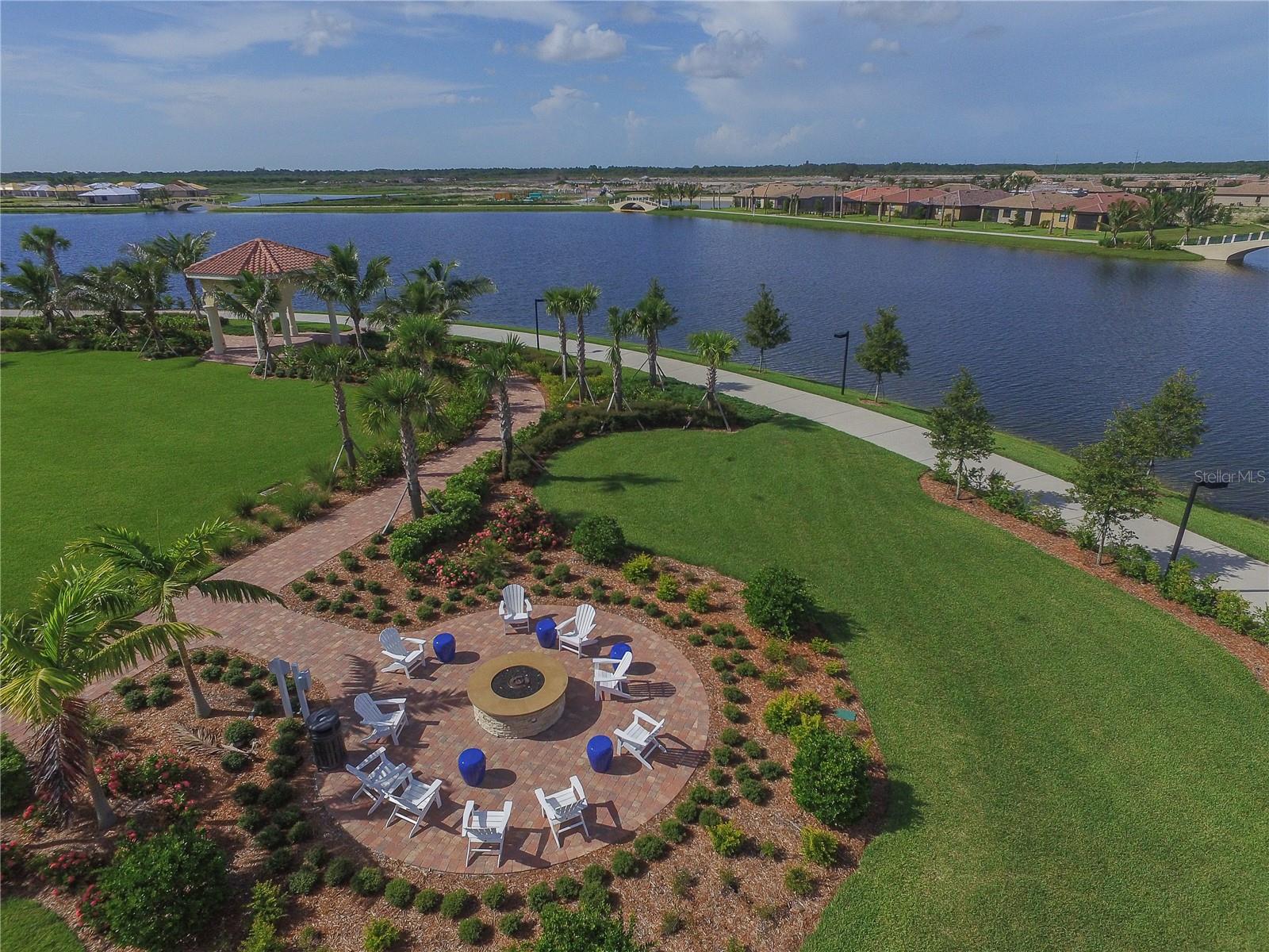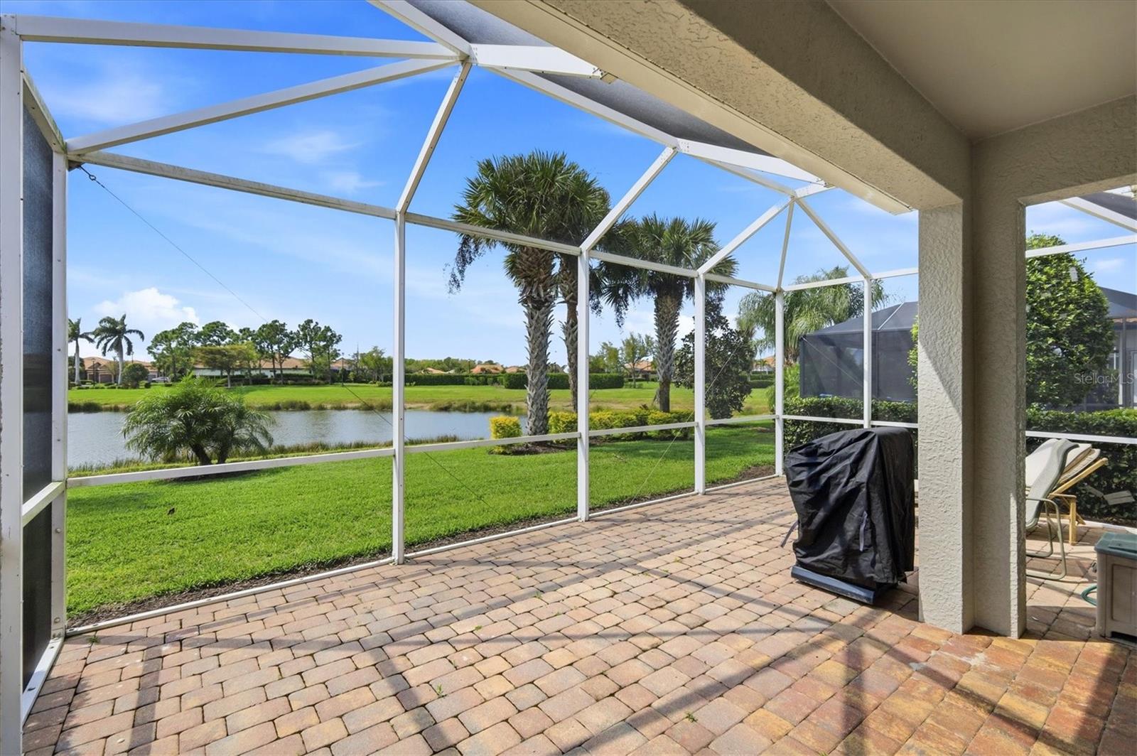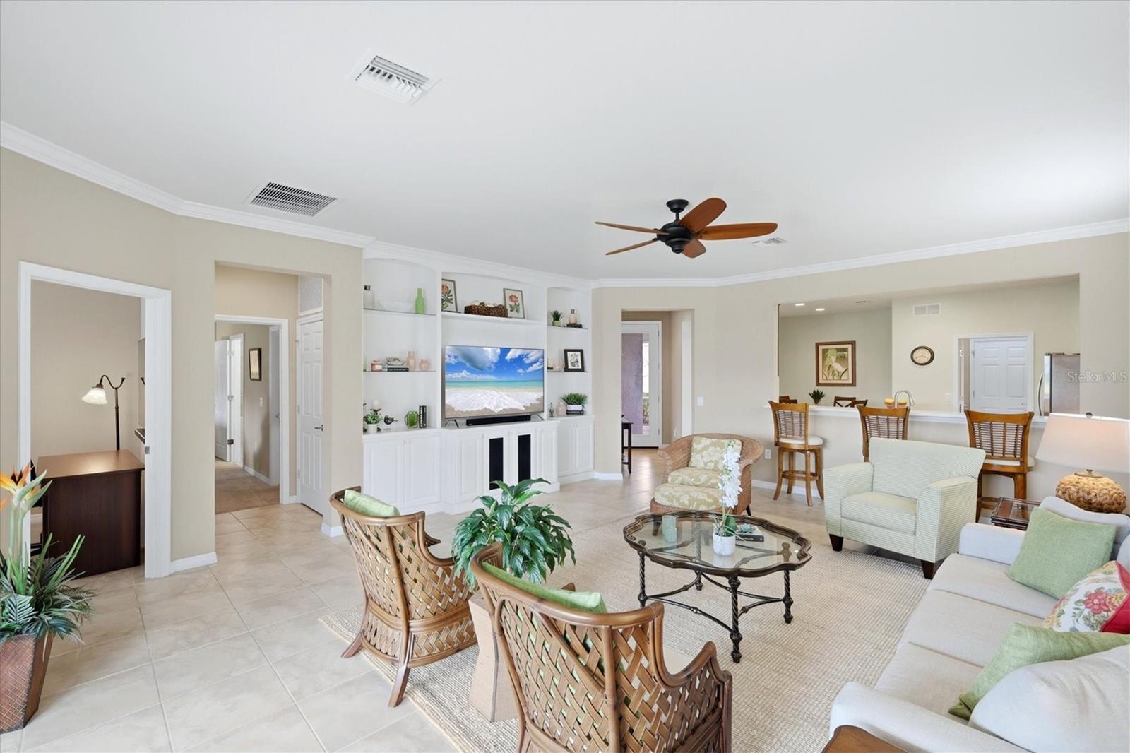 DON'T WAIT TO SEE THIS ONE! GORGEOUS LAKE VIEWS AND SPECTACULAR SUNSETS! This 2BD/2BA/DEN/2CG will not disappoint. Extremely spacious living area with crown molding accents, plantation shutters on windows, built ins for TV and shelves, and sliding doors to lanai. Windows on the South side make this a bright and cheery room. Step out onto the pavered and EXTENDED lanai. Sit, relax, and watch the beautiful SUNSETS and admire the TROPICAL LANDSCAPING. Entertain to the fullest with the huge lanai, lake views, and sunny exposure. Back inside- tile flooring throughout main areas with carpet in the 2 bedrooms. Large pass through window to kitchen. Kitchen has been updated with BEAUTIFUL QUARTZ counters and STAINLESS STEEL appliances. EXTRA RECESSED LIGHTS. Island in the center great for food prep, casual dining, and a place for friends to sit and chat. Separate nook space for breakfast or more formal affairs. SEPARATE DEN can be closed off with solid door when needed. Master bedroom with en suite bath that offers dual sinks and walk in shower with bench seat and dual head rain shower fixture. Same UNIQUE QUARTZ COUNTERS as kitchen. Walk in closet. Guest bedroom at other end of home for privacy. Guest bath updated with same QUARTZ counters and updated fixtures as master. Laundry room has folding counter space, storage cabinets, and updated washer/dryer. Need a little break from the sun? Sit on the screened in front porch. Home has been lovingly decorated with neutral paint and colorful accents. TURNKEY FURNISHING ARE NEGOTIABLE. Islandwalk is a Premier resort style community offering 2 Clubhouses with swimming pools/spa and fitness centers, 12 lighted pickleball courts,8 Har Tru tennis courts, bocce ball, Dog Park and 2 activities directors coordinating tons of activities/social events. Designed w/ the outdoors in mind- walking paths and bridges flow throughout the community amidst the tropical landscape. Located minutes to Manasota Beach, Venice Beach, shopping, and Venice Downtown with its quaint shops, restaurants, and theatres. Plus just around the corner from the Atlanta Braves stadium and spring training camp, the NEW WELLEN PARK designed community with tons of restaurants, shops, and activities, The 80 acre Grand Lake with numerous outdoor water activities and walking trails. Back gate is now open for easy access to enjoy all the activity choices outside of Islandwalk. RUN, RUN, RUN, DON'T WALK. Don't miss out- this is the new upcoming PLACE TO BE!!! Start living your Florida Lifestyle Today!!