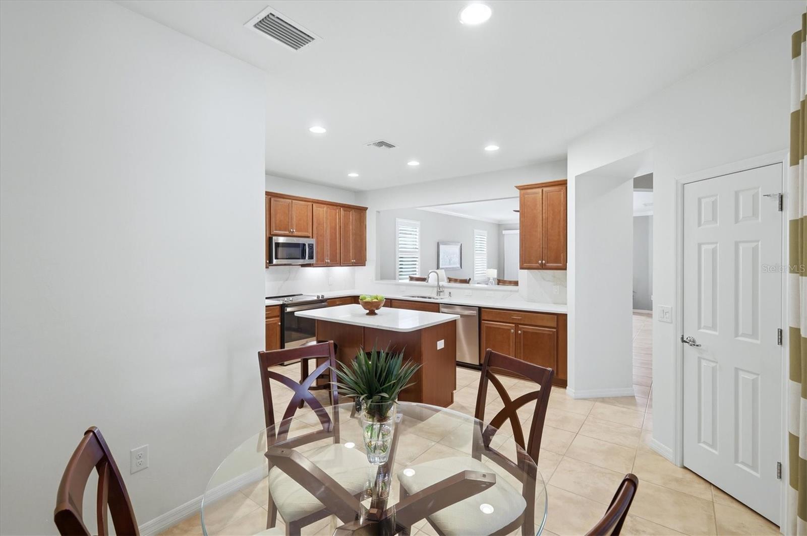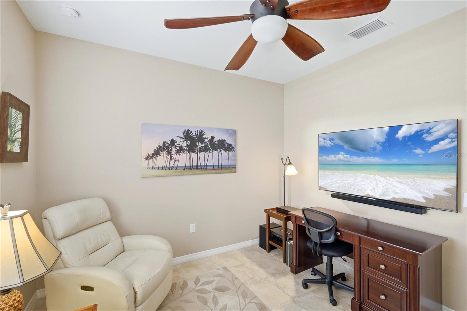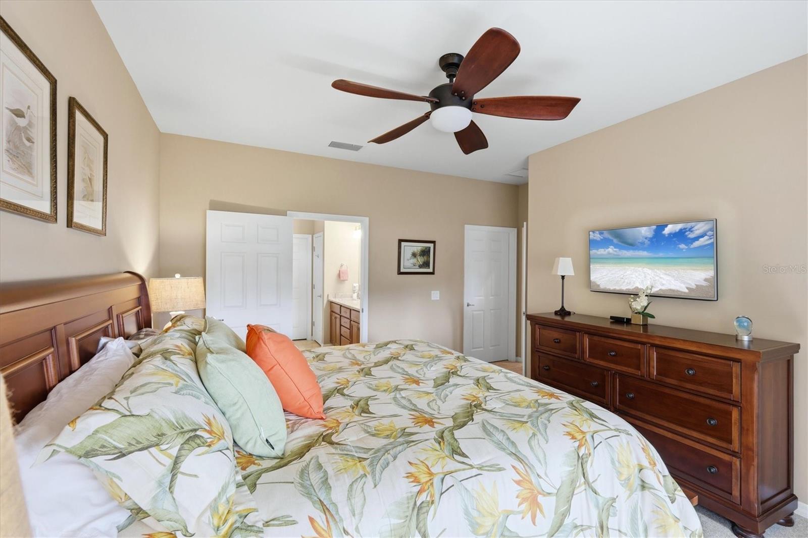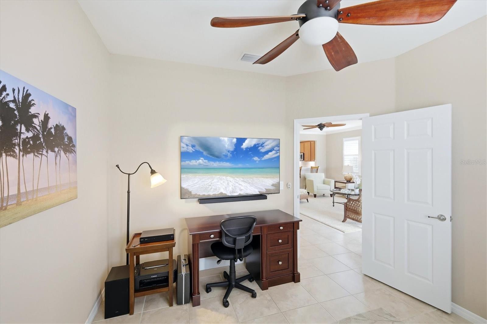 DON'T WAIT TO SEE THIS ONE! GORGEOUS LAKE VIEWS AND SPECTACULAR SUNSETS! This 2BD/2BA/DEN/2CG will not disappoint. Extremely spacious living area with crown molding accents, plantation shutters on windows, built ins for TV and shelves, and sliding doors to lanai. Windows on the South side make this a bright and cheery room. Step out onto the pavered and EXTENDED lanai. Sit, relax, and watch the beautiful SUNSETS and admire the TROPICAL LANDSCAPING. Entertain to the fullest with the huge lanai, lake views, and sunny exposure. Back inside- tile flooring throughout main areas with carpet in the 2 bedrooms. Large pass through window to kitchen. Kitchen has been updated with BEAUTIFUL QUARTZ counters and STAINLESS STEEL appliances. EXTRA RECESSED LIGHTS. Island in the center great for food prep, casual dining, and a place for friends to sit and chat. Separate nook space for breakfast or more formal affairs. SEPARATE DEN can be closed off with solid door when needed. Master bedroom with en suite bath that offers dual sinks and walk in shower with bench seat and dual head rain shower fixture. Same UNIQUE QUARTZ COUNTERS as kitchen. Walk in closet. Guest bedroom at other end of home for privacy. Guest bath updated with same QUARTZ counters and updated fixtures as master. Laundry room has folding counter space, storage cabinets, and updated washer/dryer. Need a little break from the sun? Sit on the screened in front porch. Home has been lovingly decorated with neutral paint and colorful accents. TURNKEY FURNISHING ARE NEGOTIABLE. Islandwalk is a Premier resort style community offering 2 Clubhouses with swimming pools/spa and fitness centers, 12 lighted pickleball courts,8 Har Tru tennis courts, bocce ball, Dog Park and 2 activities directors coordinating tons of activities/social events. Designed w/ the outdoors in mind- walking paths and bridges flow throughout the community amidst the tropical landscape. Located minutes to Manasota Beach, Venice Beach, shopping, and Venice Downtown with its quaint shops, restaurants, and theatres. Plus just around the corner from the Atlanta Braves stadium and spring training camp, the NEW WELLEN PARK designed community with tons of restaurants, shops, and activities, The 80 acre Grand Lake with numerous outdoor water activities and walking trails. Back gate is now open for easy access to enjoy all the activity choices outside of Islandwalk. RUN, RUN, RUN, DON'T WALK. Don't miss out- this is the new upcoming PLACE TO BE!!! Start living your Florida Lifestyle Today!!
