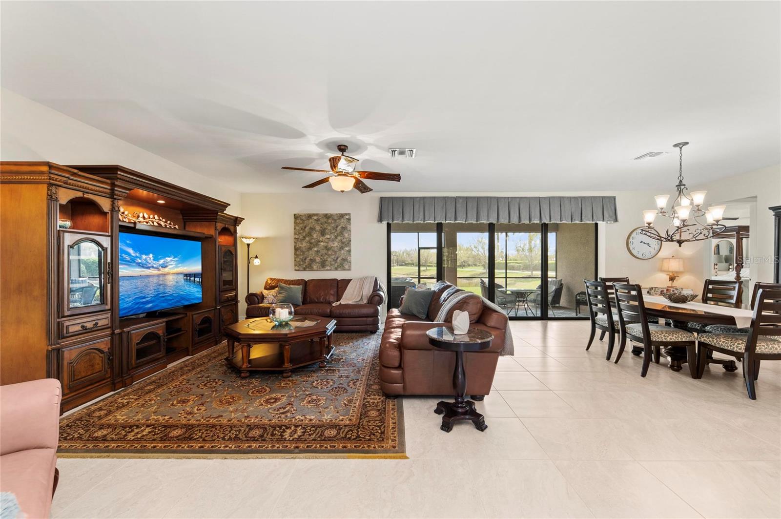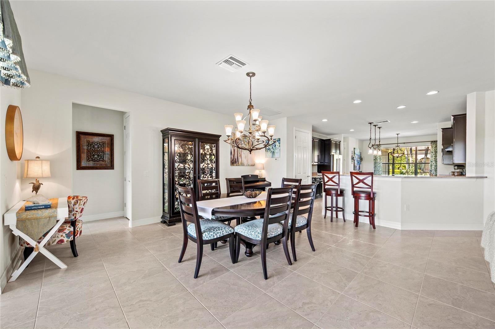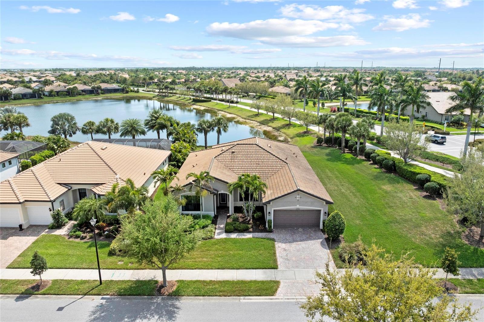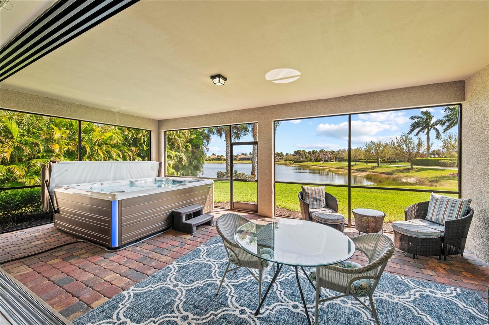 This rare Tangerly Oak model offers an exceptional opportunity to own a thoughtfully upgraded and lightly lived-in home that truly stands apart. With 2,757 square feet of living space - larger than the typical one-story Pinnacle model—this residence delivers both added space and enhanced functionality. Unlike most Pinnacle layouts, this home features four generously sized bedrooms, including a desirable second bedroom with its own private en suite bath and a large walk-in closet, perfect for guests or multi generational living. From the moment you enter, you’ll notice upscale design elements throughout, including 8-foot interior doors, higher baseboards, and tile flooring that flows seamlessly throughout the entire home. The spacious eat-in kitchen is designed for both everyday living and entertaining, offering abundant cabinetry, ample storage, and plenty of room to gather. A true highlight of the home is the one-of-a-kind wall of four sliding glass doors spanning over 15 feet, opening completely to the extended lanai for seamless indoor-outdoor living. The oversized corner lot provides exceptional privacy along with expansive, long water views, all with a sought-after southern exposure that fills the home with natural light—especially during the winter months. Step outside to your own private retreat, featuring a premium Hot Spring Prism seven-person hot tub installed in 2020. Designed for a full-body hydrotherapy experience, it includes 73 jets powered by three pumps, a deeply relaxing lounger seat, a powerful footwell jet, a freshwater salt system, multi color lighting, and a backlit waterfall for added ambiance—all offering luxury without the maintenance of a full pool. Set on an expansive 9,788 square foot executive homesite, the property also benefits from a large berm that enhances privacy and tranquility. Additional features include hurricane impact glass windows and doors throughout, including the quadruple sliders, a four-foot extended garage, and a large laundry room with plenty of space for storage and functionality. Lovingly maintained by its original owners and used only seasonally for approximately two months per year, this home has never been rented and remains in exceptional condition. Ideally located just a short walk from the impressive 14,000 square foot Resort Center, 11,000 square foot Event Center, multiple pools, and an array of world-class amenities, this home offers the perfect blend of luxury, comfort, and convenience.