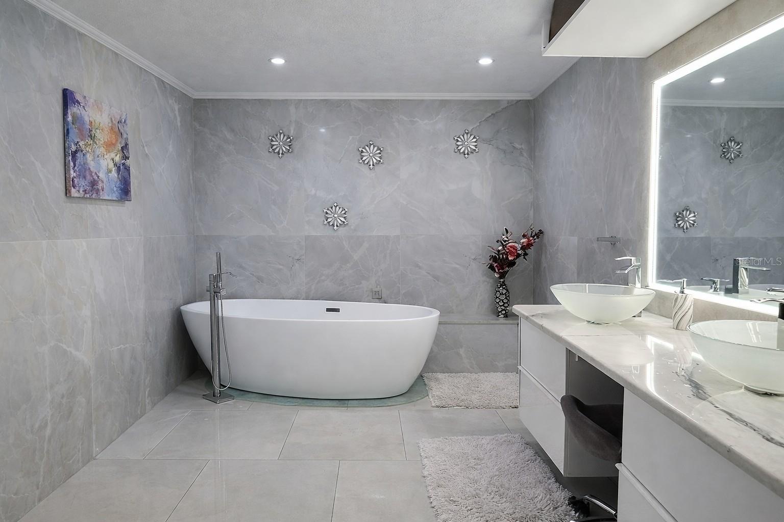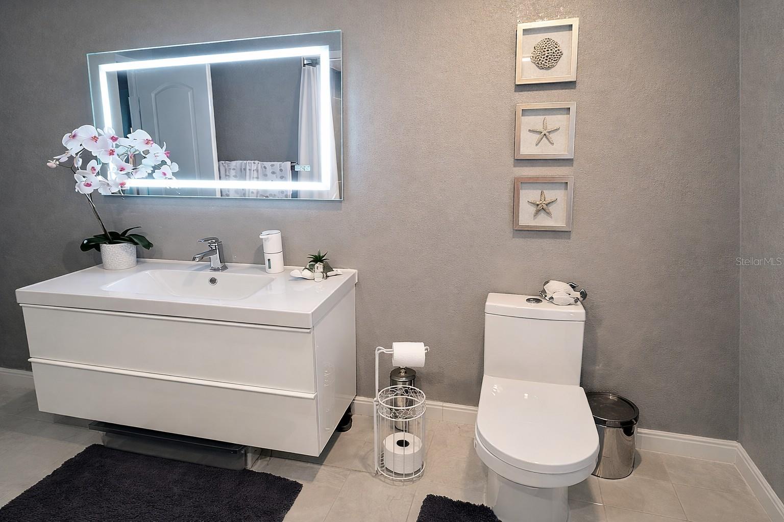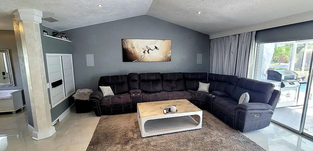 Jacaranda West fully remodeled home (2021) with golf & tennis community access and low HOA approx. $40/month. Features new roof, new appliances, updated kitchen and baths, and extensive smart-home automation controlling lighting, curtains, pool pump, sprinklers, lanai misting system, and keyless Bluetooth entry. The finished garage IN-LAW SUITE offers a private entrance, full kitchen, bathroom with shower, laundry, and added interior/exterior storage. The main kitchen includes a pot filler, RO system, appliance lift, media hub, and integrated touchscreen control center with Wi-Fi, Bluetooth, cameras, and quiet built-in ventilation. Primary suite showcases full-height tile, 5’x5’ walk-in shower with thermostatic valve, bidet, freestanding tub, Bluetooth ceiling speakers, and walk-in closet with direct laundry access. Outdoor living features a freestanding kitchen with refrigerator and Wi-Fi grill. Most furniture included (excluding lanai)