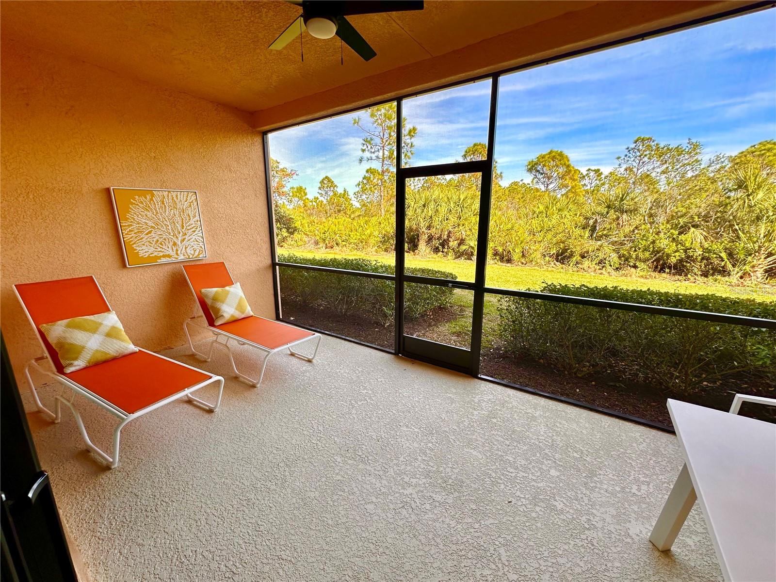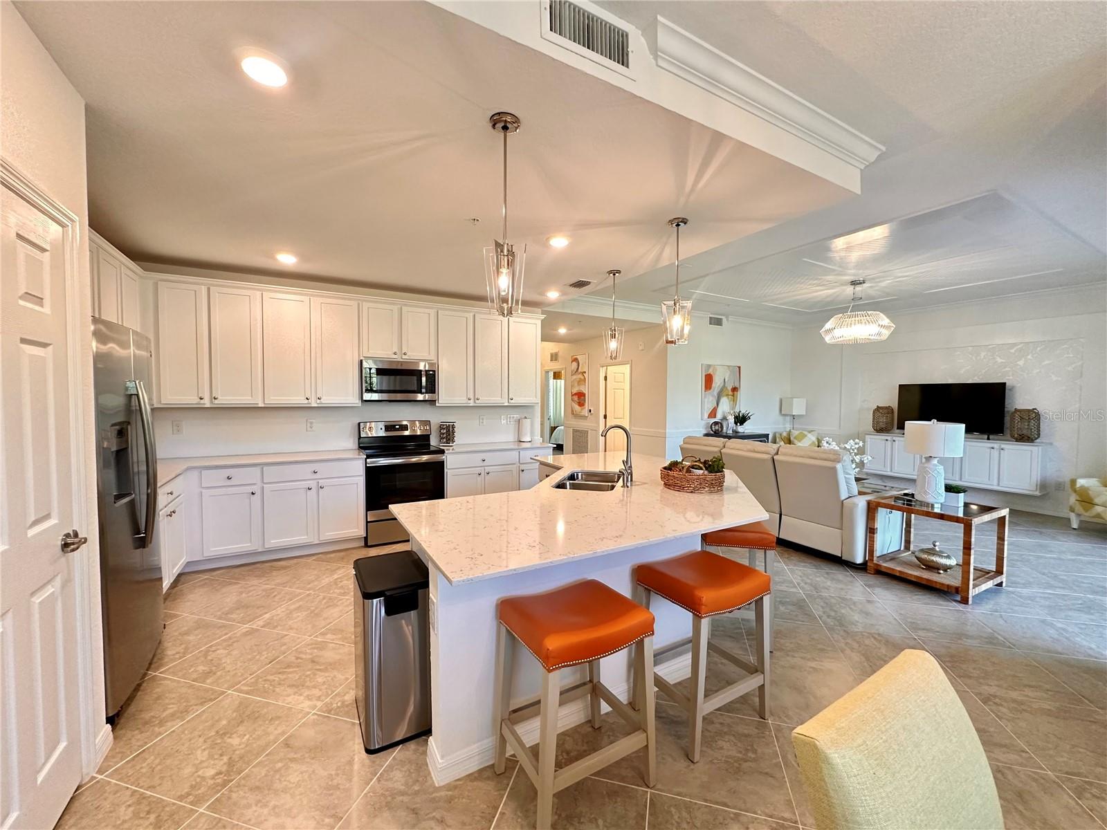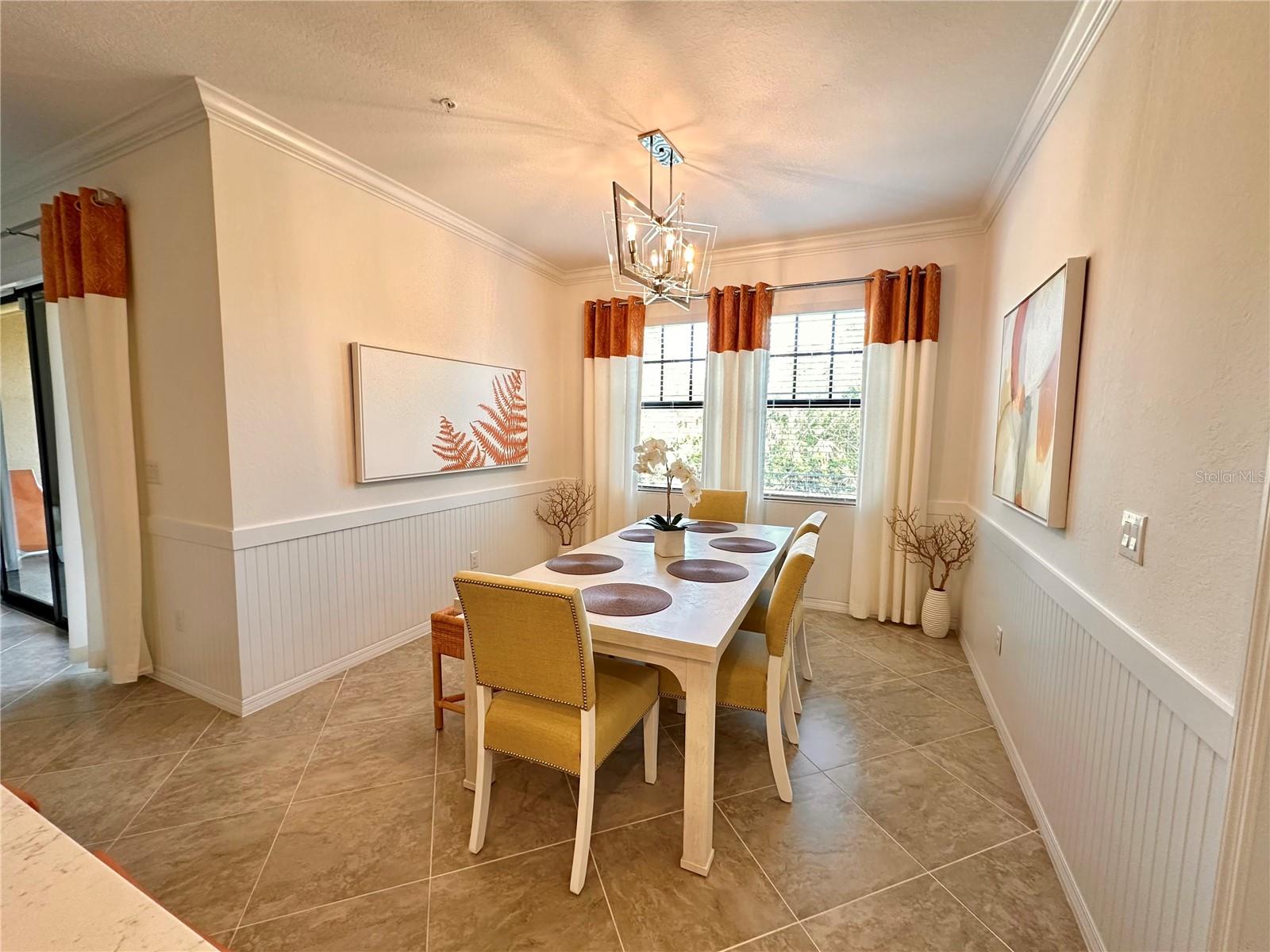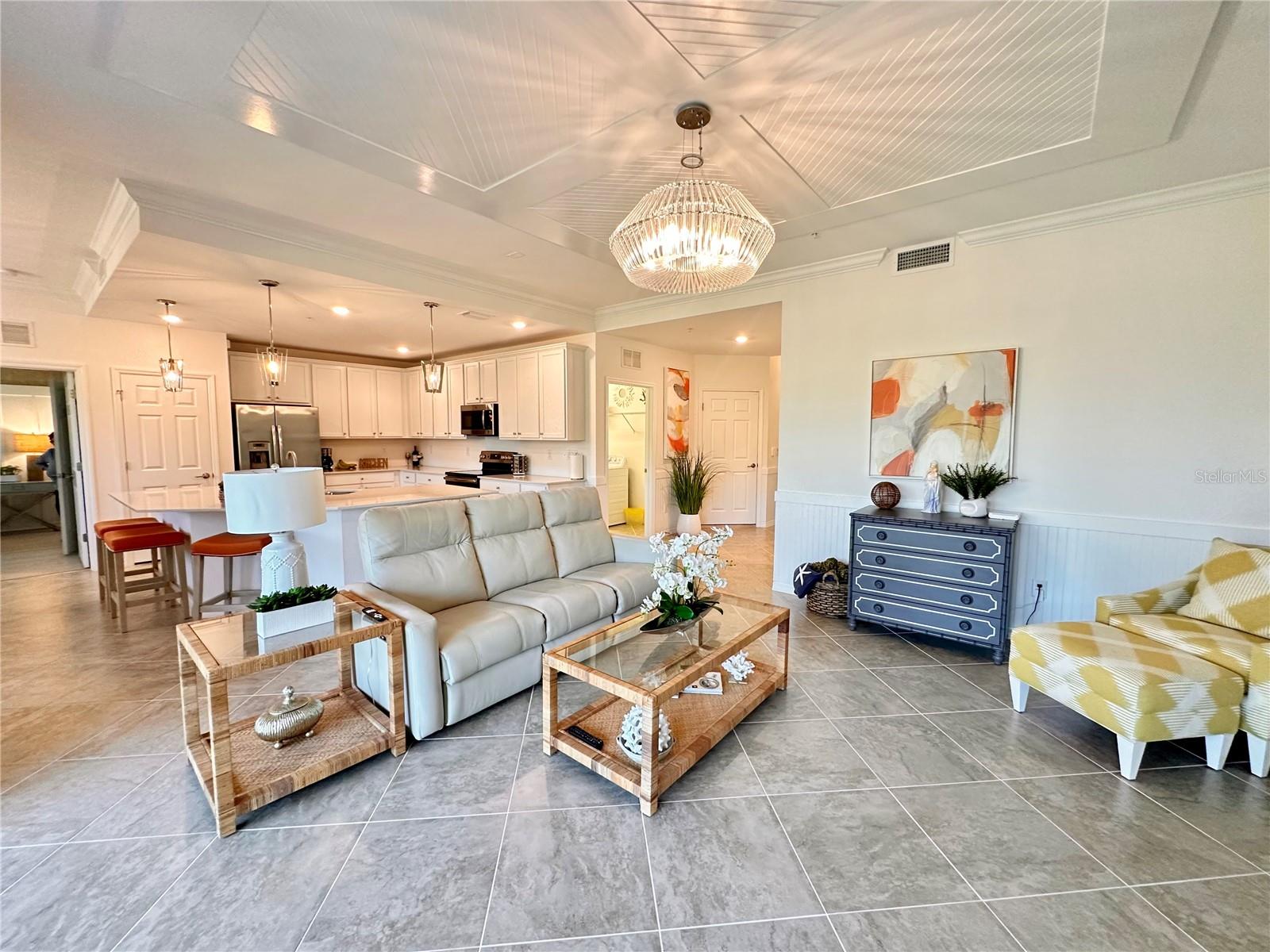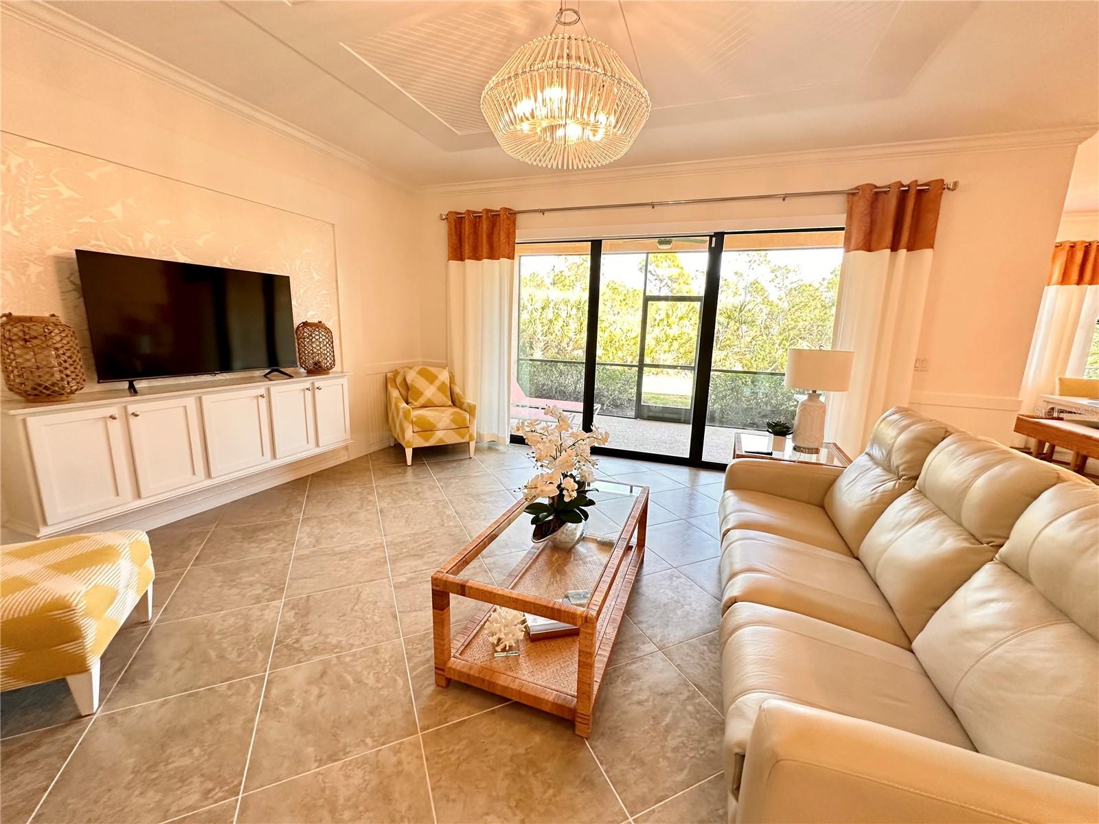 Fully furnished, this stunning condo has been beautifully decorated and remodeled with meticulous attention to detail. Discover resort-style living in this exquisitely designed home located in the prestigious Sarasota National community, in non-flood zone. This condominium offers a thoughtfully designed split floor plan featuring 2 bedrooms, 2 baths, and an expansive open-concept living space perfect for both relaxing and entertaining. The chef-inspired kitchen serves as the centerpiece of the home, complete with an oversized island with counter-height seating, stainless steel appliances, quartz countertops, elegant pendant lighting, and shaker-style cabinets. Brushed nickel hardware and decorative accents add a modern yet timeless touch. The adjacent living and dining areas feature custom trim and designer lighting, exuding a sense of sophistication. Triple sliding glass doors open to the lanai, revealing serene views of the lush preserve. The primary suite is a luxurious retreat with a spa-like ensuite bathroom featuring dual sinks, a separate water closet, and a spacious walk-in closet. Additional highlights include an oversized laundry room, a one-car garage, and impact-resistant windows and doors, ensuring peace of mind. This condo is loaded with designer upgrades, including diagonal tile flooring, crown molding, tray ceilings, decorative wainscoting, wallpaper accents, and custom lighting—all creating an ambiance of refined luxury. Located in Sarasota National, an amenity-rich community, residents enjoy access to a main clubhouse with a full-service dining room, a bar and lounge, a library, and a coffee room. Fitness enthusiasts will appreciate the state-of-the-art gym, spa treatment rooms, group fitness spaces, and locker rooms. The resort-style pool features lap lanes, a spa, beach entry, and a poolside tiki bar. Additional amenities include tennis courts, bocce, pickleball, an event lawn, expansive patios, and a dedicated dog park. The HOA fee covers water, sewer, basic cable, pest control, exterior maintenance, irrigation, and access to the world-class amenities. This prime location is just moments from Wellen Park Town Center, offering unique shops, fine dining, a Farmer’s Market, live entertainment and more. It’s also close to historic Downtown Venice and the pristine Gulf Coast beaches.