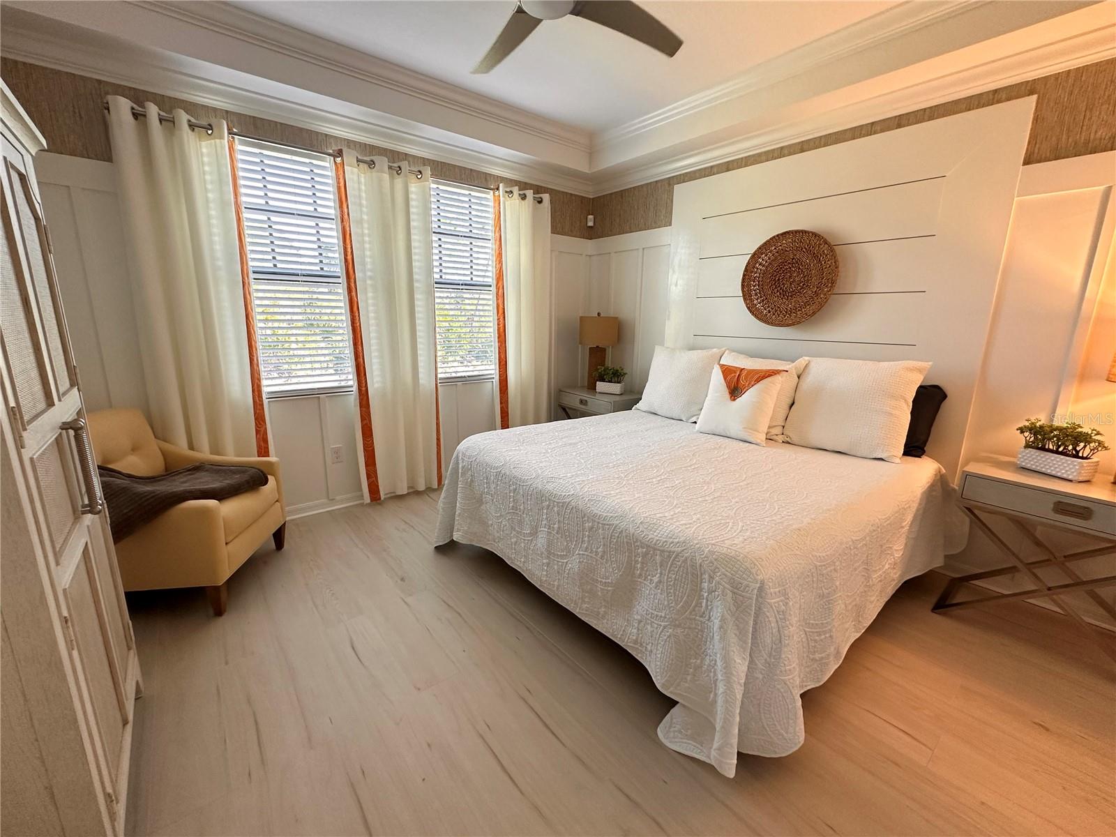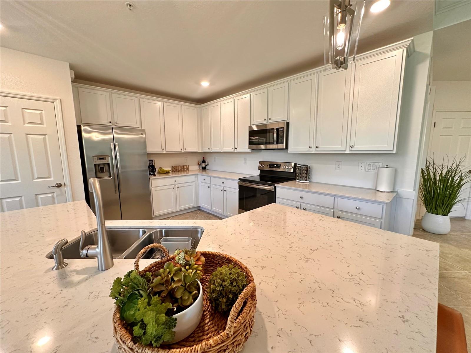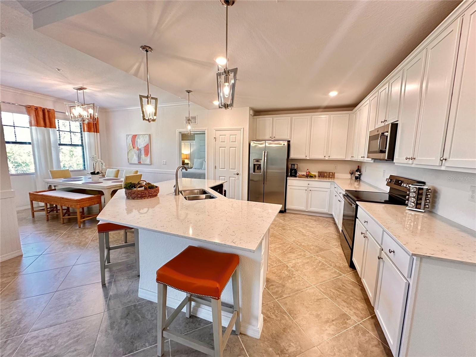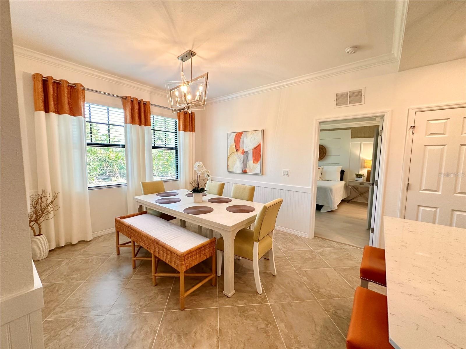 Fully furnished, this stunning condo has been beautifully decorated and remodeled with meticulous attention to detail. Discover resort-style living in this exquisitely designed home located in the prestigious Sarasota National community, in non-flood zone. This condominium offers a thoughtfully designed split floor plan featuring 2 bedrooms, 2 baths, and an expansive open-concept living space perfect for both relaxing and entertaining. The chef-inspired kitchen serves as the centerpiece of the home, complete with an oversized island with counter-height seating, stainless steel appliances, quartz countertops, elegant pendant lighting, and shaker-style cabinets. Brushed nickel hardware and decorative accents add a modern yet timeless touch. The adjacent living and dining areas feature custom trim and designer lighting, exuding a sense of sophistication. Triple sliding glass doors open to the lanai, revealing serene views of the lush preserve. The primary suite is a luxurious retreat with a spa-like ensuite bathroom featuring dual sinks, a separate water closet, and a spacious walk-in closet. Additional highlights include an oversized laundry room, a one-car garage, and impact-resistant windows and doors, ensuring peace of mind. This condo is loaded with designer upgrades, including diagonal tile flooring, crown molding, tray ceilings, decorative wainscoting, wallpaper accents, and custom lighting—all creating an ambiance of refined luxury. Located in Sarasota National, an amenity-rich community, residents enjoy access to a main clubhouse with a full-service dining room, a bar and lounge, a library, and a coffee room. Fitness enthusiasts will appreciate the state-of-the-art gym, spa treatment rooms, group fitness spaces, and locker rooms. The resort-style pool features lap lanes, a spa, beach entry, and a poolside tiki bar. Additional amenities include tennis courts, bocce, pickleball, an event lawn, expansive patios, and a dedicated dog park. The HOA fee covers water, sewer, basic cable, pest control, exterior maintenance, irrigation, and access to the world-class amenities. This prime location is just moments from Wellen Park Town Center, offering unique shops, fine dining, a Farmer’s Market, live entertainment and more. It’s also close to historic Downtown Venice and the pristine Gulf Coast beaches.