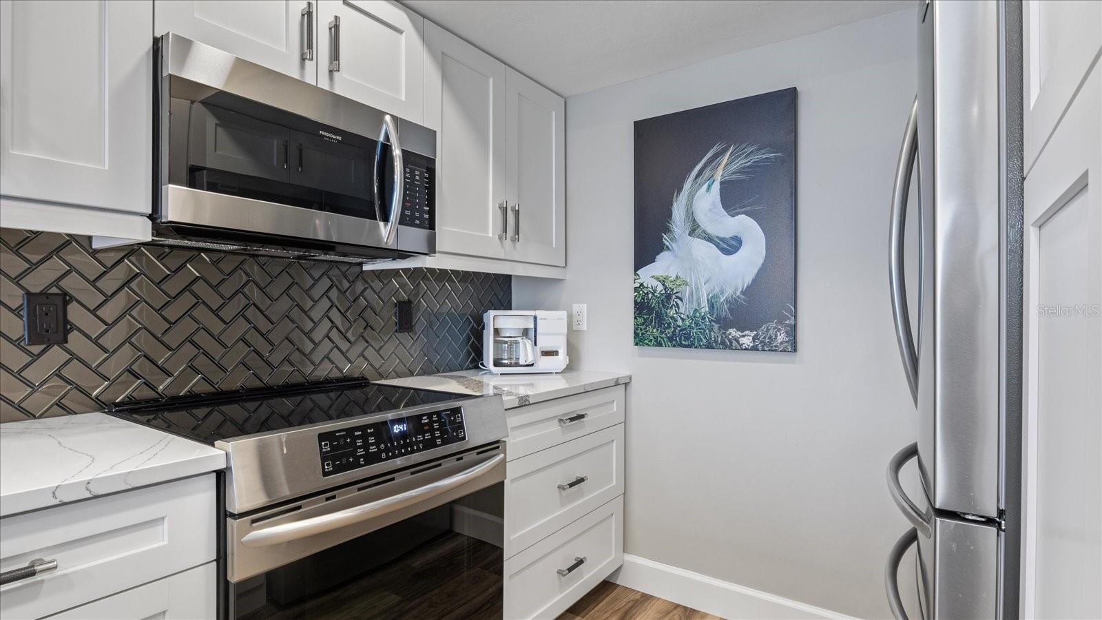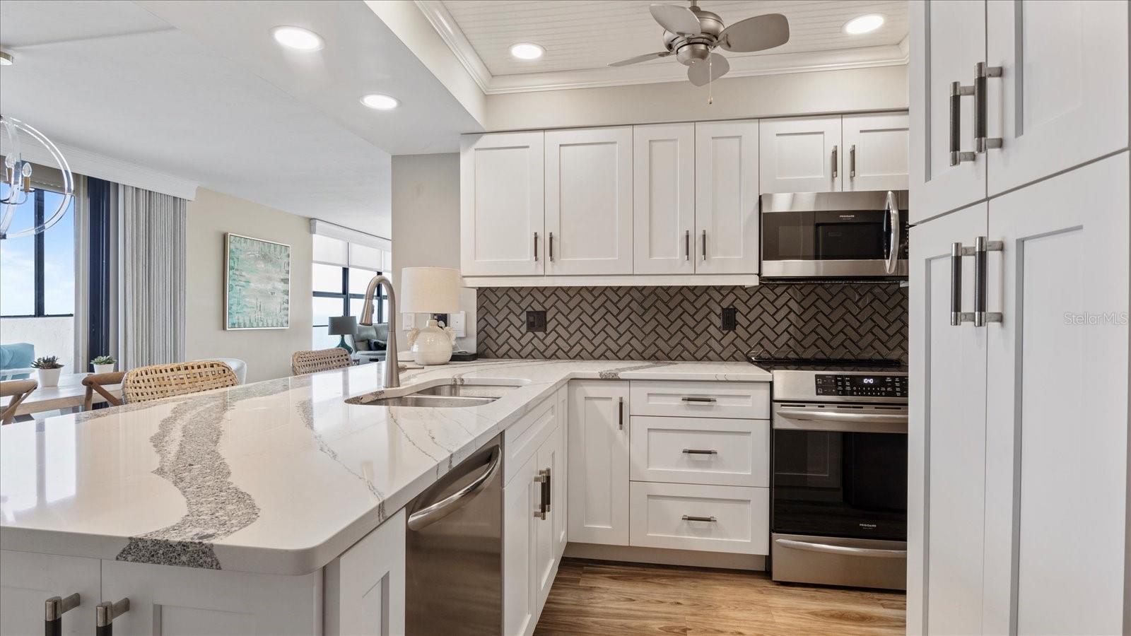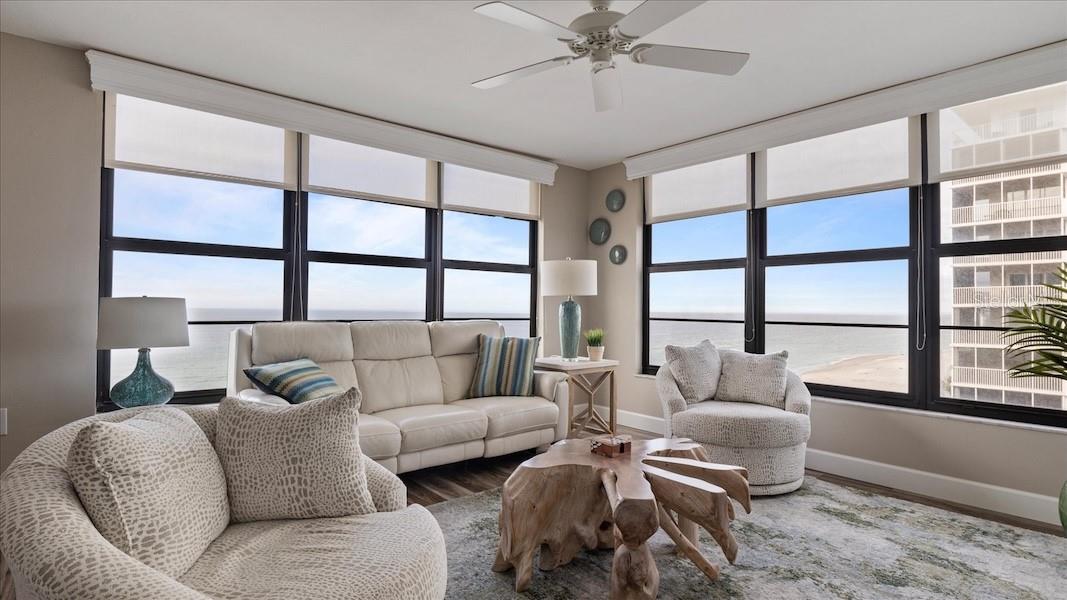 WELCOME TO WORLD CLASS GULF OF MEXICO VIEWS from the 6th Floor, 2B/2B, North Tower residence in the premier, BEACHFRONT property of Valencia on the Gulf. This beautiful, open concept floor plan gives you an immediate, unobstructed view of the Gulf the moment you walk in the door. Recently remodeled in 2022, at a cost of over $200,000, the unit was gutted and received a new facelift from top to bottom. Included in the renovation were new vinyl flooring throughout, new white mission-style cabinets and stylish quartz counters in kitchen and bathrooms. Topline Frigidaire Gallery appliances, including an induction stove, add to the sophistication of the kitchen. Bathrooms display a touch of elegance. View Gulf of Mexico waters from a spacious Master Bedroom that features a generous walk-in closet. Valencia on the Gulf was named 2023 Community of the Year on the west coast of Florida. Amenities include a fitness center with new equipment and a library, both of which were remodeled in 2024 at a cost of $50,000. Currently, new carports are slated for completion in January 2025. Each of three buildings were painted in 2024 and has its own outside grill, plus there’s Shuffleboard and a swimming pool on site for your pleasure. Fully furnished, this turnkey unit is ready for you to immediately enjoy Florida living.