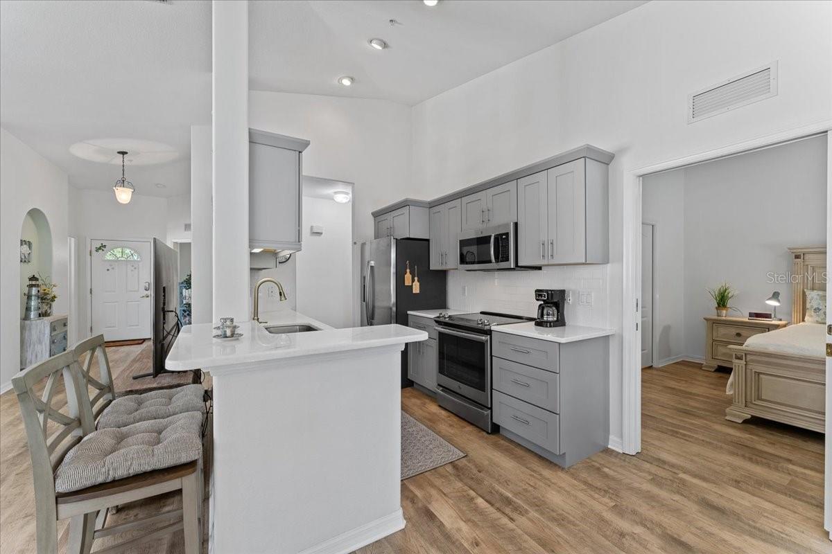 Welcome to the premier resort style gated community of Casa di Amici in Venetia! This lovely well designed 1383 sq. foot residence offers a private one car garage plus convenient parking at your doorstep. An inviting entrance with seating leads you into the 3 bed 2 bath home with high cathedral ceilings, providing height and light to this seamless open space with a thoughtful split bedroom floorplan. Check out the beautiful flooring and comfortable living room with ceiling fan. The gorgeous kitchen offers quality cabinets, gleaming quartz tops, under counter lighting and upgraded appliances, including a new Bosch dishwasher and a fridge with ice and water dispenser. You will love this kitchen! From the dining room you can look out over the tropical pond and there's plenty space to entertain friends and family. Nice primary suite with 2 separate closets, one of which is a large walk in closet. The master bath provides dual sinks and a private spot for the commode. Two more nice size bedrooms can serve as guest rooms or home office. The "wow" spot is the screened back lanai, which is where you can spend your time watching the sparking pond, fountain and Florida wildlife, while mature landscaping lends total seclusion and serenity. It's a perfect place to enjoy the sunset. Convenient laundry room with room for cleaning essentials and additional storage. This home is in superb move in condition and the foreign sellers are including all the furniture and equipment with the sale. If you prefer bringing your own, we can get the content removed. Brand-new ac system 2024, new hot water heater 2020. Get fit at the gym or enjoy a swim in the sparkling pool. Furthermore, you can play tennis, shuffleboard, pickleball, basketball, bocce or join at the activities in the fabulous clubhouse. Pets are welcome.
