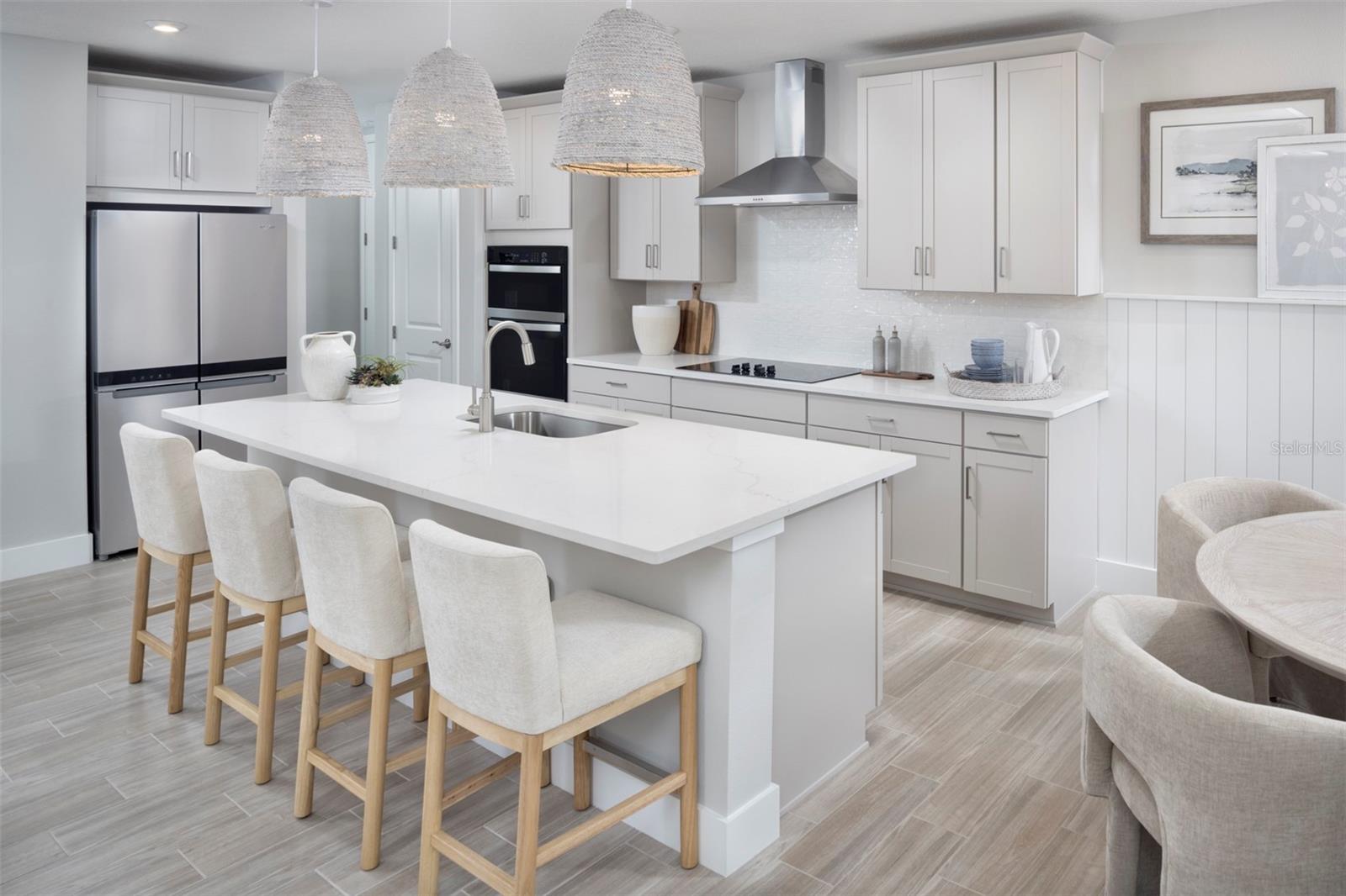 This beautifully designed first-floor coach home delivers 1,406 sq. ft. of light-filled living space with 2 bedrooms, 2 full bathrooms, and a powder bathroom, blending comfort, style, and easy-living convenience. An open-concept layout creates a smooth, natural flow from the dining area to the kitchen and great room, making everyday living and entertaining feel effortless. The kitchen shines with soapstone-inspired quartz countertops, abundant white shaker cabinetry, stainless steel appliances, and an inviting island breakfast bar that seats five. A unique linear-pattern tile backsplash adds a modern touch, while the walk-in pantry enhances storage. The spacious primary suite offers a peaceful retreat with a large walk-in closet featuring shelving on three walls and an elegant primary bathroom with a raised dual-sink vanity, oversized shower with a ledge, linen closet, and private water closet. The split-bedroom layout ensures privacy, with the second bedroom and full bathroom thoughtfully positioned on the opposite side of the home. Sliding glass doors open to a screened lanai—perfect for relaxing mornings or breezy evenings. Additional features include 8-foot interior doors, a conveniently located laundry room near the garage that keeps noise away from the living spaces, and a ClareOne Smart Home Technology package for everyday convenience. Residents also enjoy access to fantastic community amenities, including resort-style pools, lakefront recreation, fitness facilities, walking and biking trails, dog parks, play spaces, and a full calendar of social activities—plus close proximity to Downtown Wellen’s waterfront dining, lively entertainment, weekly events, and the area’s most beautiful Gulf Coast beaches, placing endless fun and outdoor enjoyment just minutes from home. ***Photos, renderings and plans are for illustrative purposes only and should never be relied upon and may vary from the actual home. Pricing, dimensions and features can change at any time without notice or obligation. The photos may be from a furnished model home and not the home offered for sale.