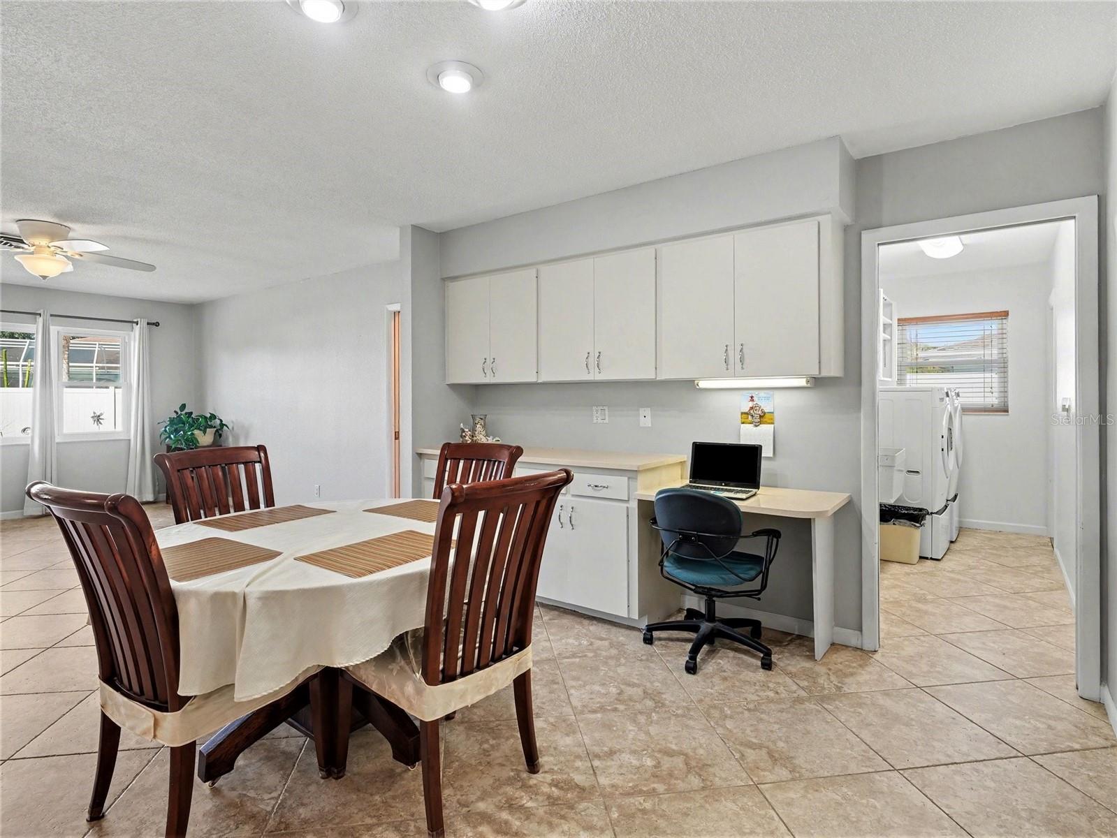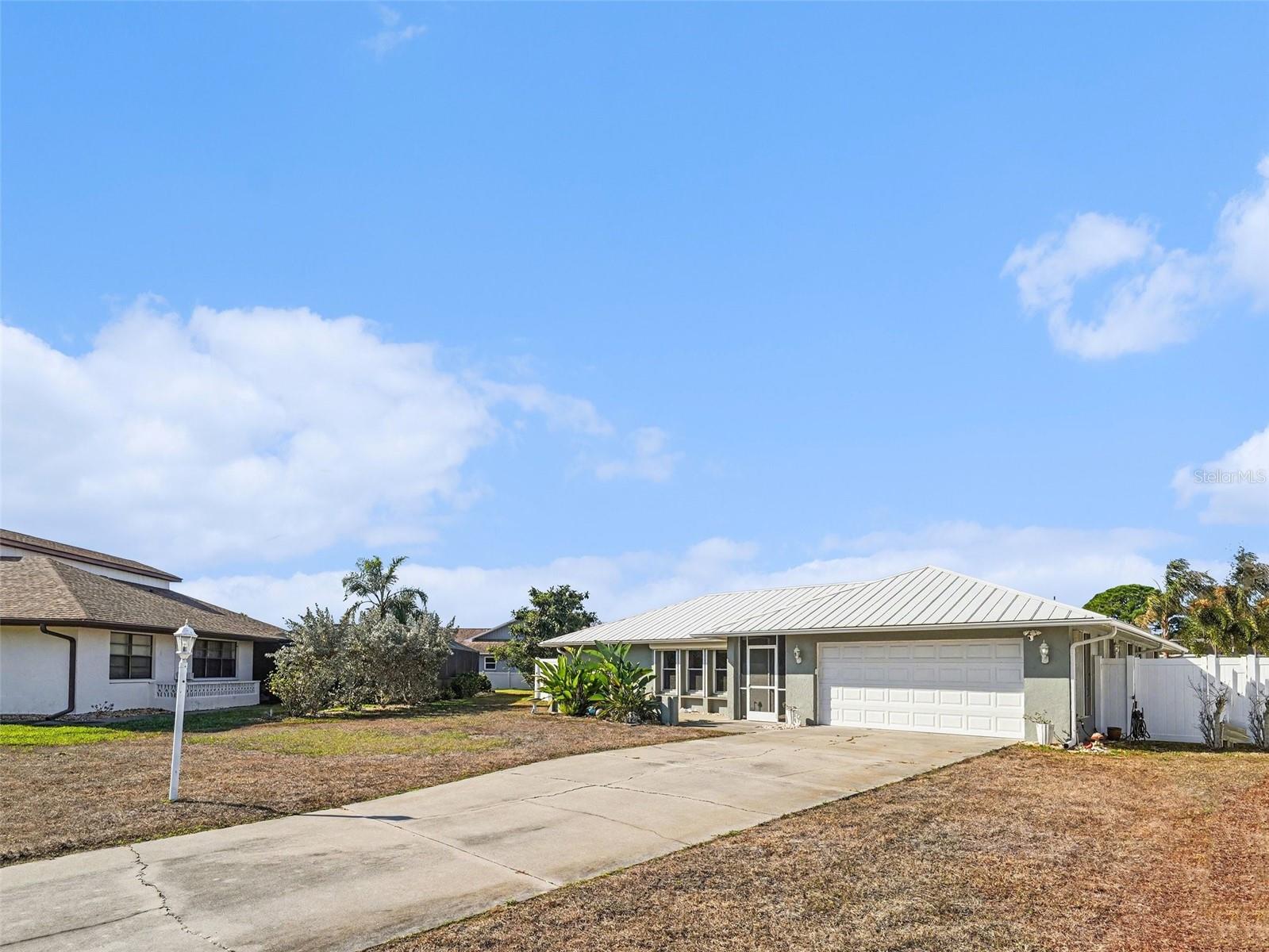 Charming VERY LARGE 2 bedroom home in Pinebrook South. Fenced back yard. Extra large lanai with Vinyl sliders. Hurricane Protection for windows, doors. Kitchen is centrally located. Home is off the beaten path, on quiet cul-de-sac. Newer Barrel Metal Roof 2020, water heater 2024, furnace 2020, Porcelain Tile throughout, Quartz counter top. Built in desk in the dining. Carpet in living and bedrooms. Needs your decorating ideas Connection 220 for outside hot tub. This is a must See!