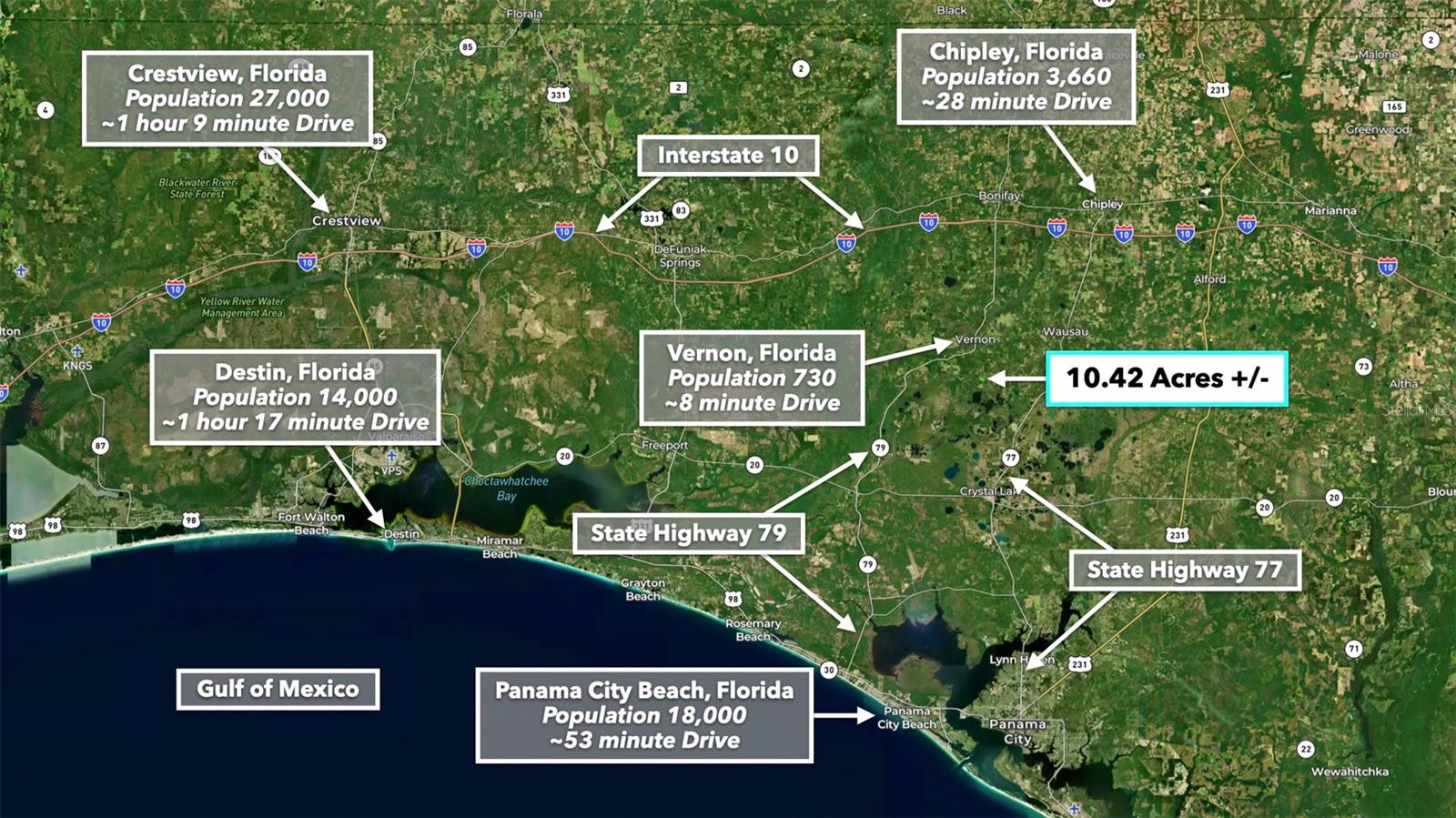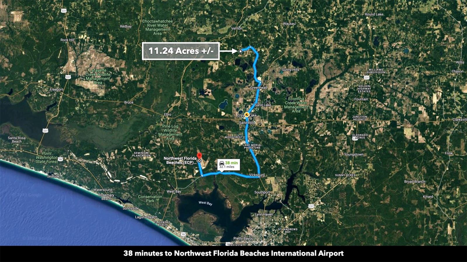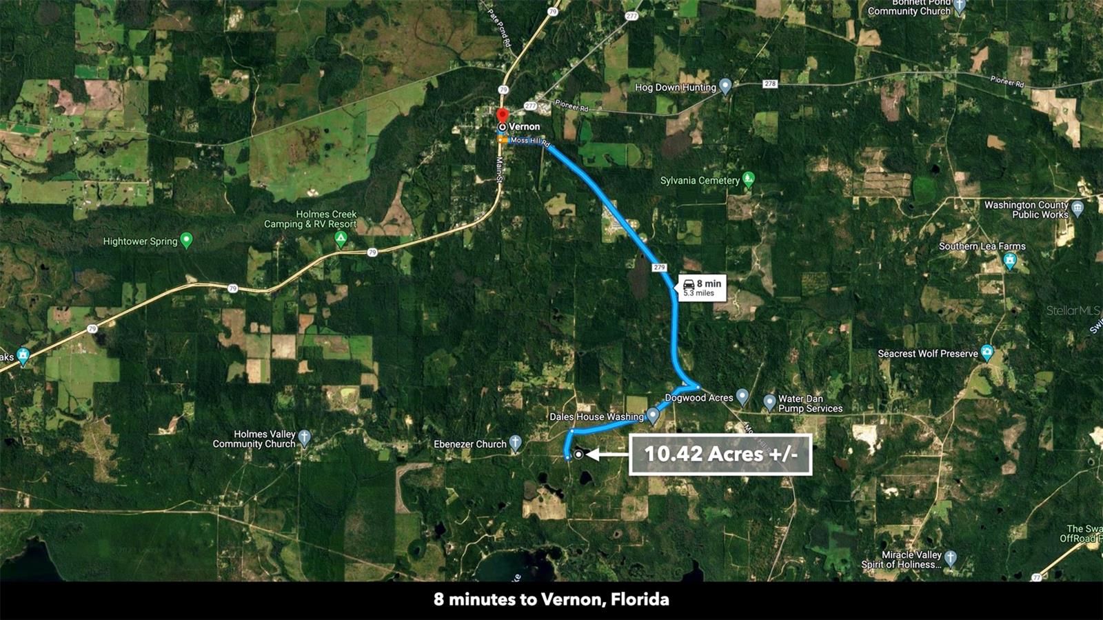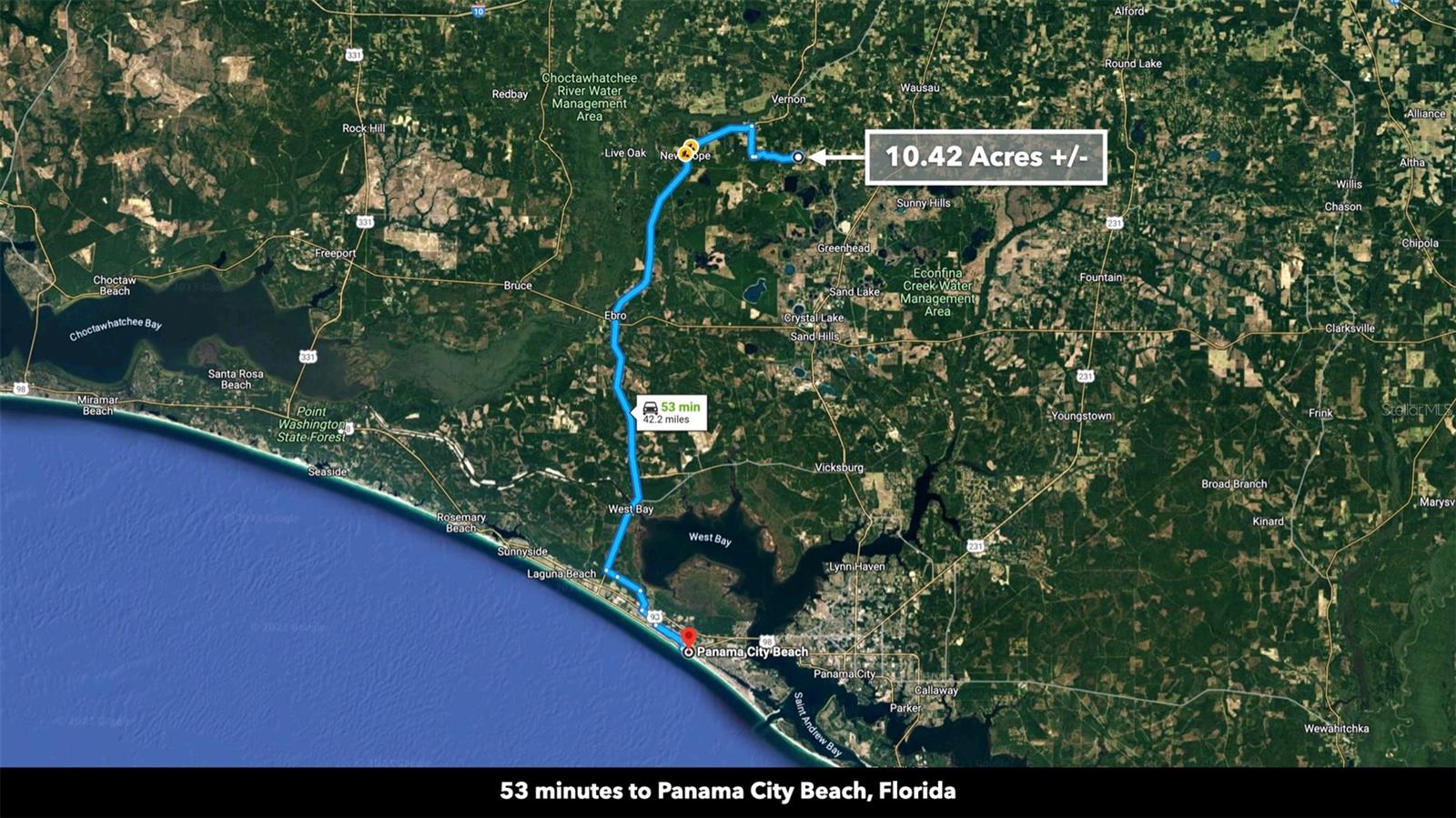 You don’t have to go far for beautiful off-grid living in Washington County, Florida. This lush 10.42 Acre property is less than an hour from Panama City Beach. It’s close enough to what you need and far enough from what you don’t. Enjoy idyllic scenes of farms, woodlands, and well-spaced homesites. You won’t find tourists and beachcombers here among the serene pines, hardwoods, and farmland. This medium-sized property suits almost any vision: a tiny home, cozy cabin, seasonal RV base, or a spacious place to put down roots and call home. Make this beautiful space what you want, free of HOA restrictions, fees, and building time limits. Setting the Scene Leading to the property, mature trees and wooden rail fences line recently-paved New Jerusalem Road. The property has an excellent mix of vegetation and dry, flat space ideal for farming, gardening, or raising livestock. The wooded areas provide privacy, beauty, and soil reinforcement. 1,000 feet of a freshwater spring fed pond loops through the northeastern part of the property, offering added beauty and private fishing. This moderately wooded property is the perfect canvas for your vision. One neighbor has cleared his land lined with a functional and attractive plank fence, while another neighboring property remains undeveloped with mature trees and native vegetation. Several ponds in the area regularly attract wildlife like deer and waterfowl to the area. Farming & Gardening The mild to warm climate allows for year-round growing. Summer squash, zucchini, peppers, citrus fruits, okra, melons, tomatoes, corn, and more thrive in the warm summers. Meanwhile, leafy vegetables, lettuces, broccoli, carrots, and many herbs do well in the fall and winter. Fall is the perfect season to experience (and plant) the Florida panhandle’s vibrant wildflower display. Florida’s top four cash crops are tomatoes, oranges, sweet corn, and watermelon. Access & Electricity There is 500 feet of paved road frontage along the eastern boundary on New Jerusalem Road. There is also 475 feet of road frontage as well as electricity lines and poles along the western boundary. Location Less than ten minutes to Vernon, Florida, the property is close to a local market, dollar store, schools, churches, sports fields, eateries, a café, and a post office. The rural-suburban town features newly paved roads surrounded by beautiful grassy spaces and wooded areas. The property is near what is considered some of "America's Best Beaches". Nearby Panama City Beach and Destin are a treasure trove of shopping and entertainment. If you’re longing for a beach day or an adrenaline-pumping saltwater fishing excursion, the Panama City Beach is less than an hour away. New housing developments and commercial expansion is in full tilt here. Just a few miles away the new Latitude Margaritaville resort community is building out. The area is one of the biggest real estate growth markets in the state. A recently built international airport (38 minutes from the property) has made access to the area seamless for travelers. It’s exciting to be have an unrestricted, large-acreage properties, in the path of this monumental growth. Real estate opportunity in momentum markets like this, is hard to come by.