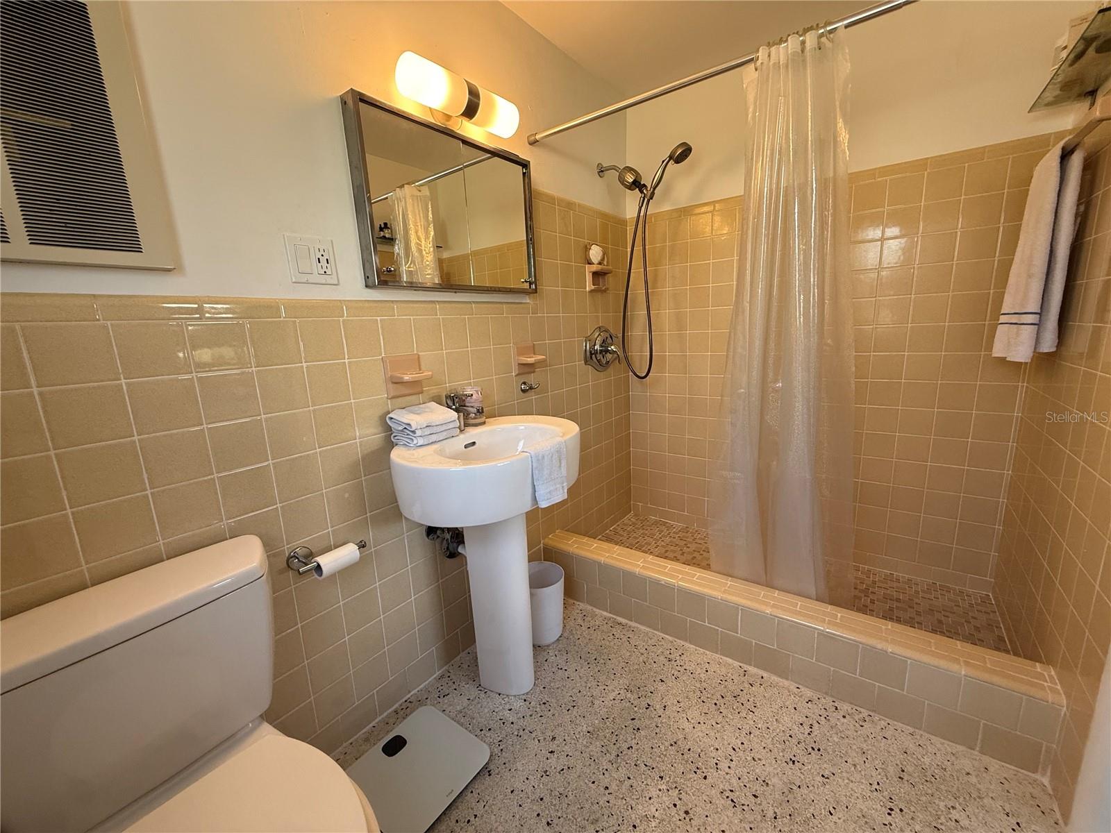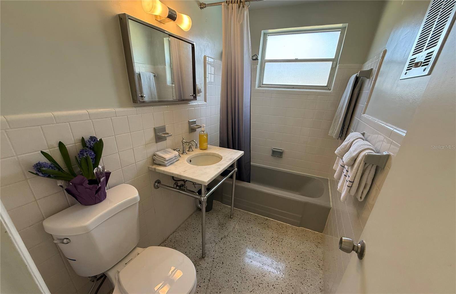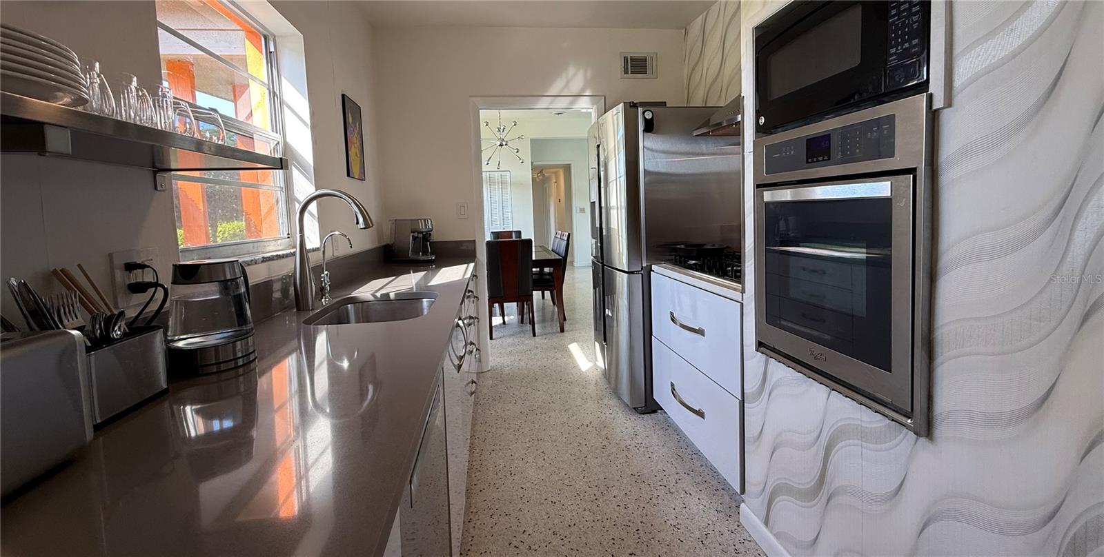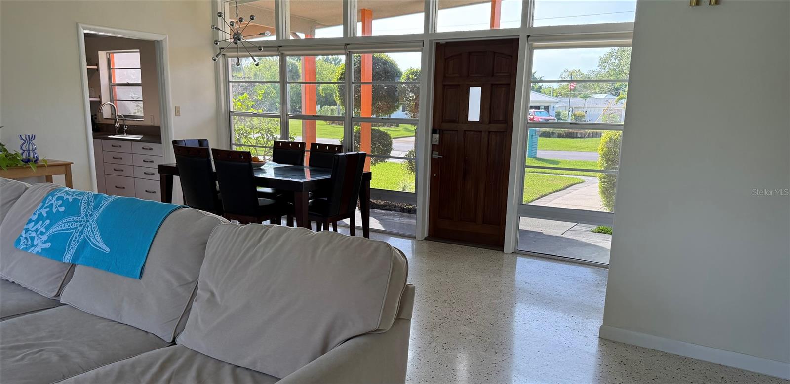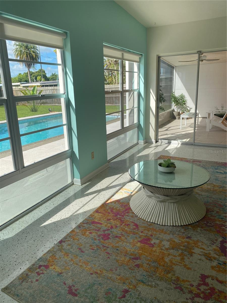 This impeccably maintained 3-bedroom, 2-bath home is built with solid CBS construction and full hurricane protection, including shutters and custom garage doors for enhanced safety and peace of mind. Step inside to discover a bright, airy interior filled with Mid-Century charm, expansive windows, and picturesque views of the 15x30 saltwater pool and lush, private backyard oasis — a true retreat. The unbeatable location offers quick access to grocery stores, pharmacies, gas stations, and the beach. Enjoy a spacious, fully fenced yard with a screened porch and side-gated access for your boat or RV. Striking Terrazzo floors, a sleek kitchen with stainless appliances and a gas stove, plus a double-car garage with ample storage make this home a rare gem.