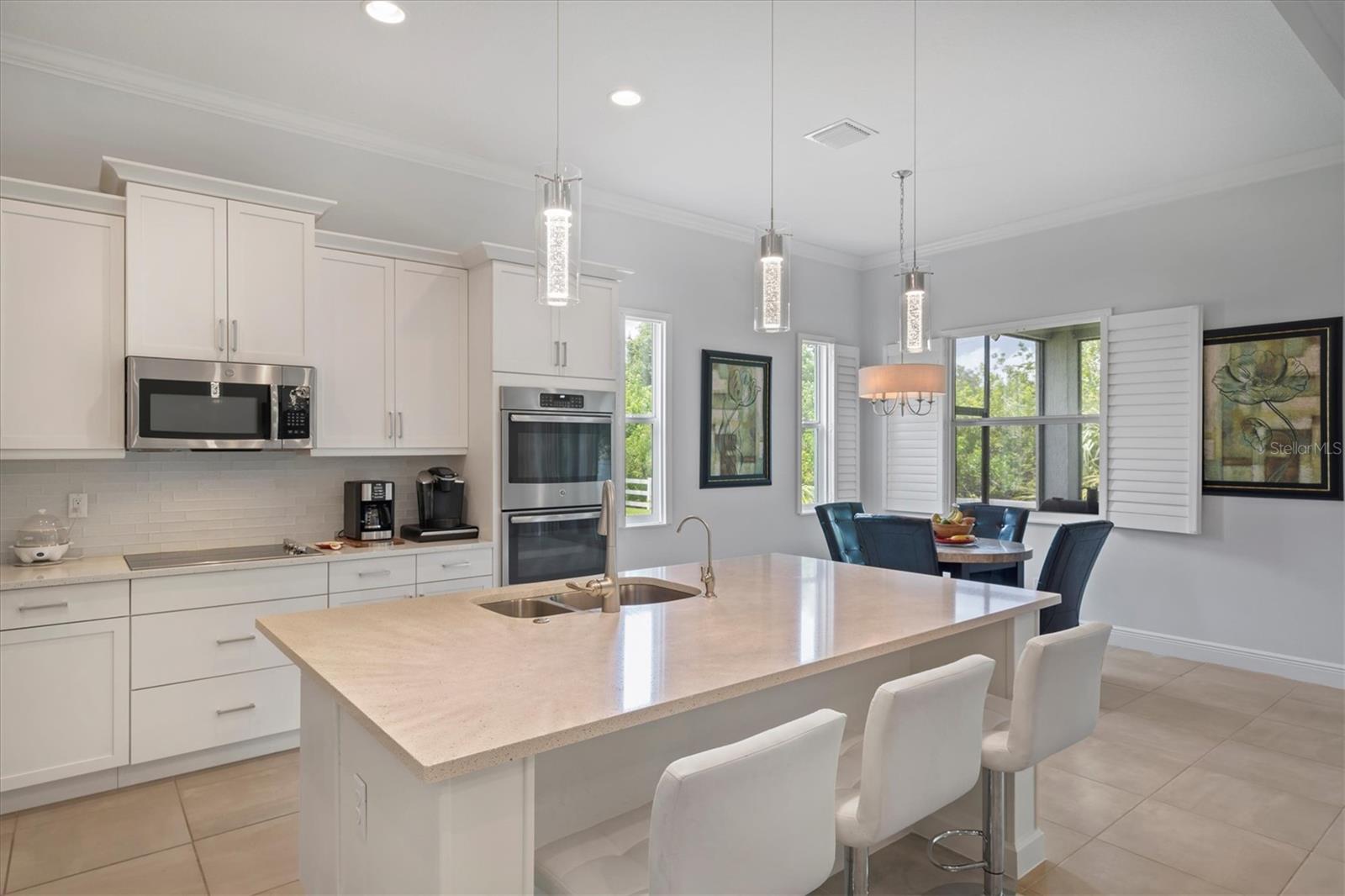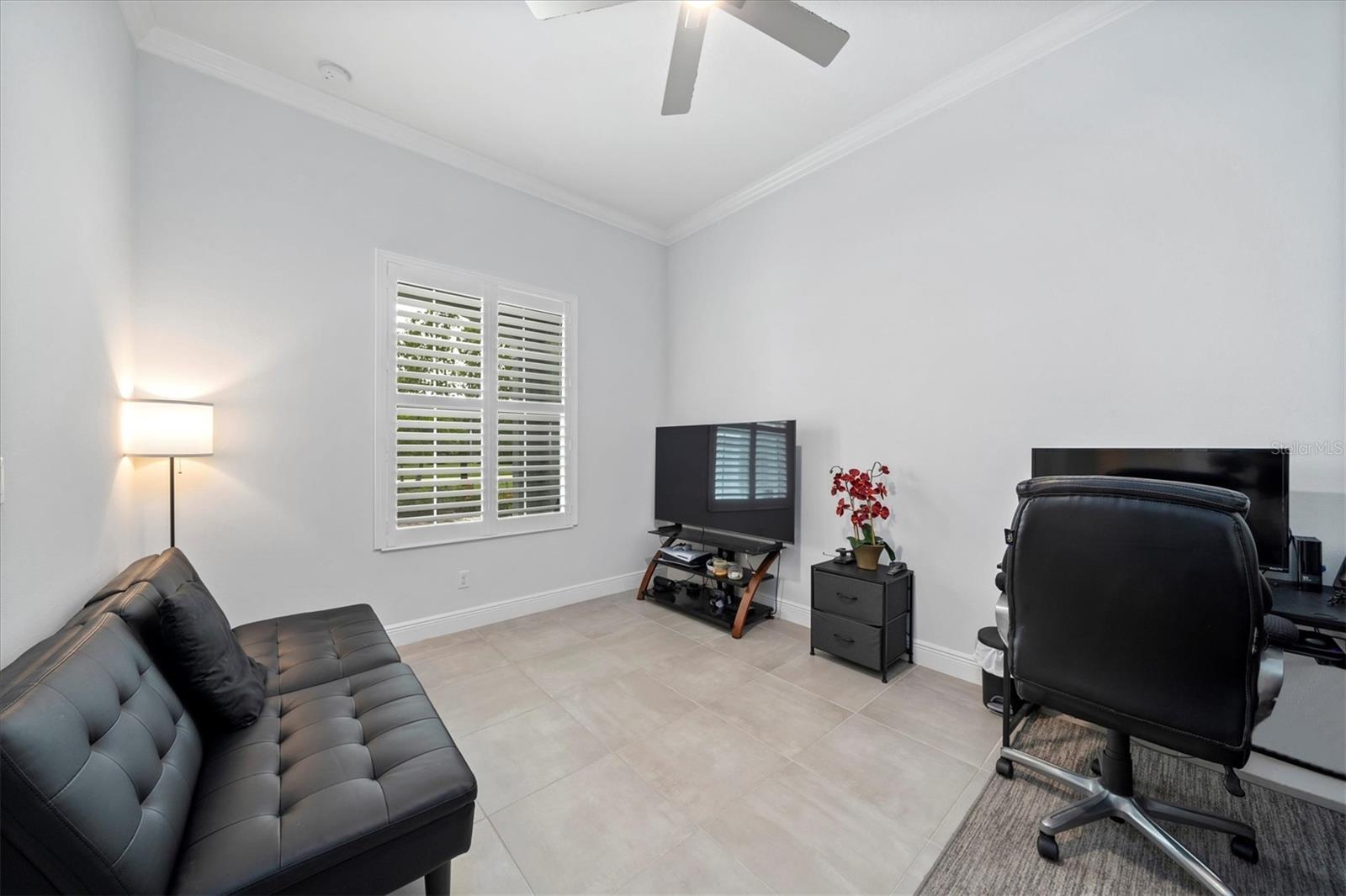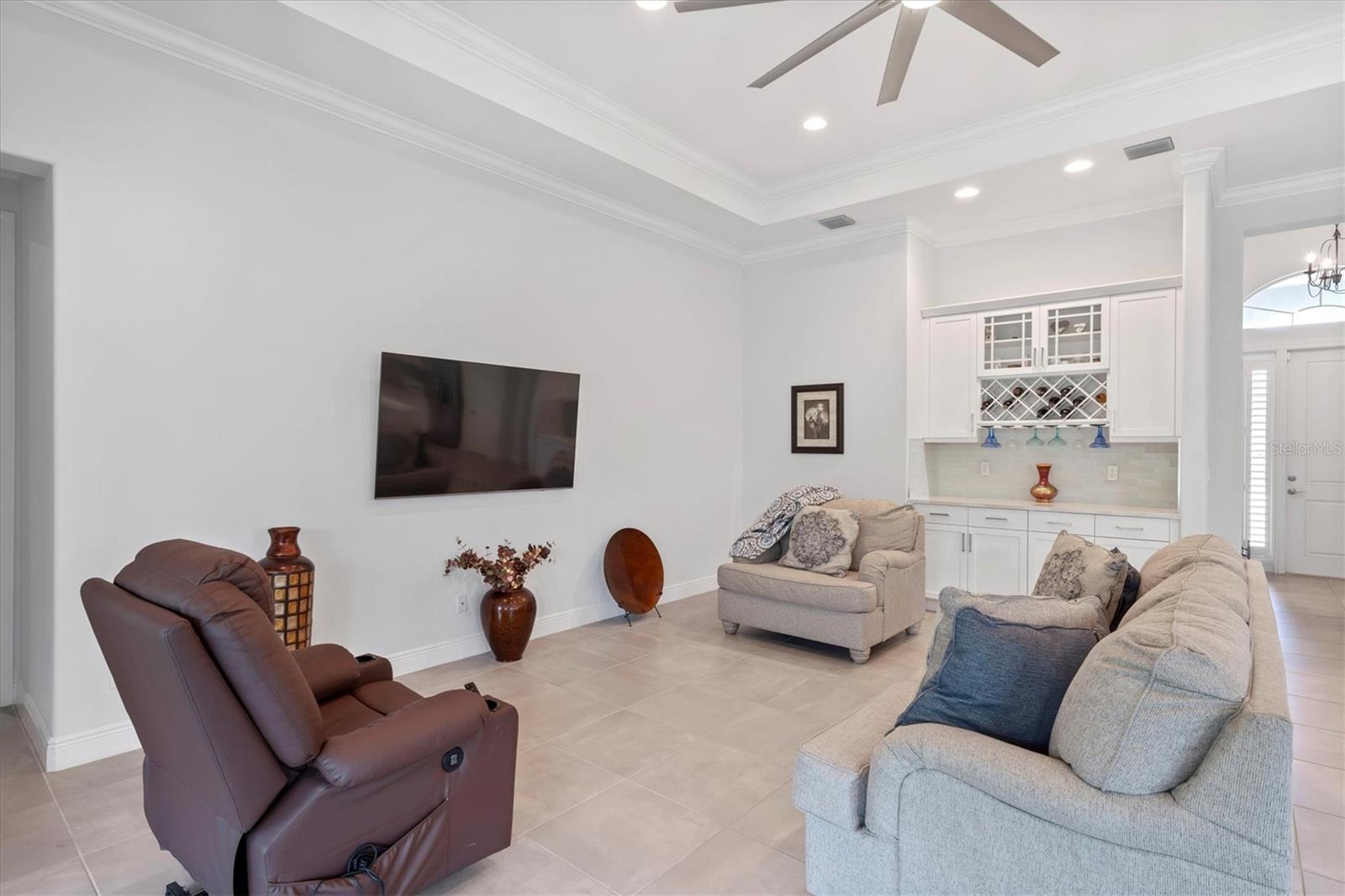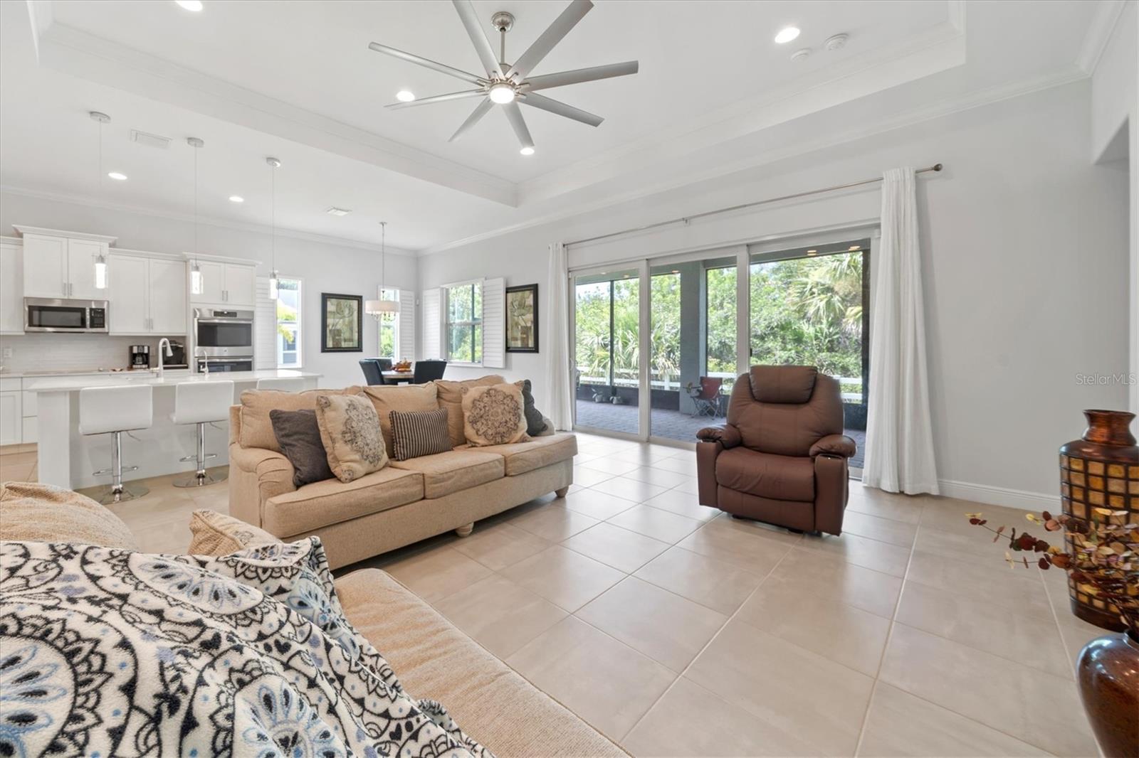 Seller is offering $10,000 closing credit! You'll love this thoughtfully designed 3-bedroom home with 2.5 baths, plus a flexible den/office! This layout just makes sense. The spacious gourmet kitchen is a standout. It features a center island, striking tile backsplash, wall oven, and a built-in bar area perfect for easy entertaining. Throughout the home, you'll find elegant tile flooring, impact windows accented with Bahama shutters, and a beautiful tray ceiling that adds a touch of architectural interest. The oversized en suite is a dream, offering two separate vanities and one of the largest showers you'll see - with dual shower heads and generous space. A nearly 50-foot wide, the covered and screened lanai extends your living area outdoors. Enjoy the perks of a community pool and fitness center while living in a home that feels both elevated and easy.