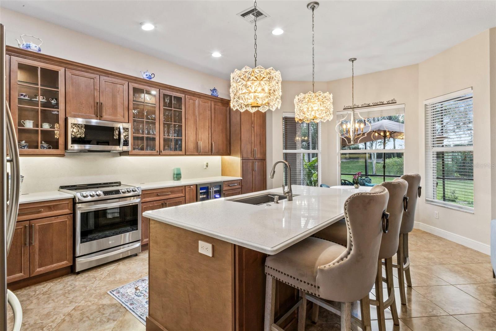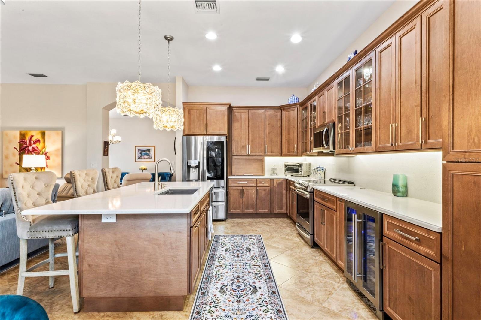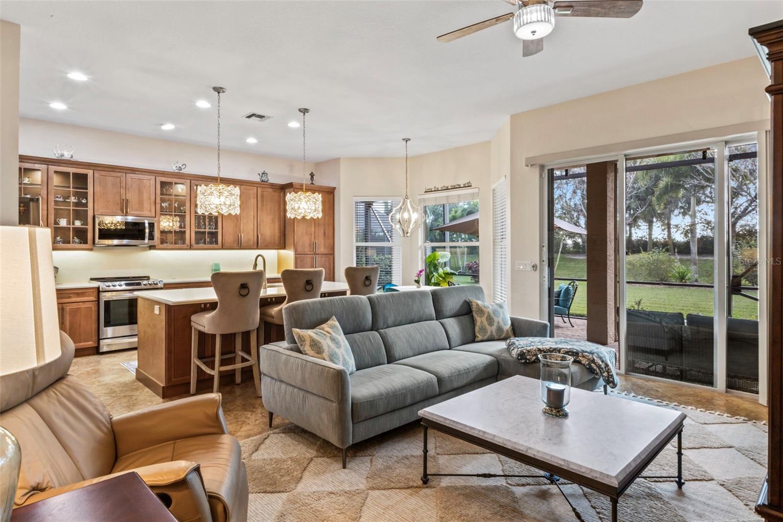 BRAND NEW KITCHEN! Maple cabinets, newer SS LG appliances, induction range, built-in wine cooler, quartzite countertops, perfect for entertaining. This spacious 2 Bedroom plus Den/office home features Diagonal tile in living areas, wood floors in bedrooms, custom closets in main bedroom, living and family room, breakfast nook & dining room, large extended lanai and whole house generator. Close to community amenities including resort-style pool, clubhouse, fitness room, play area and tennis courts. Gated community.