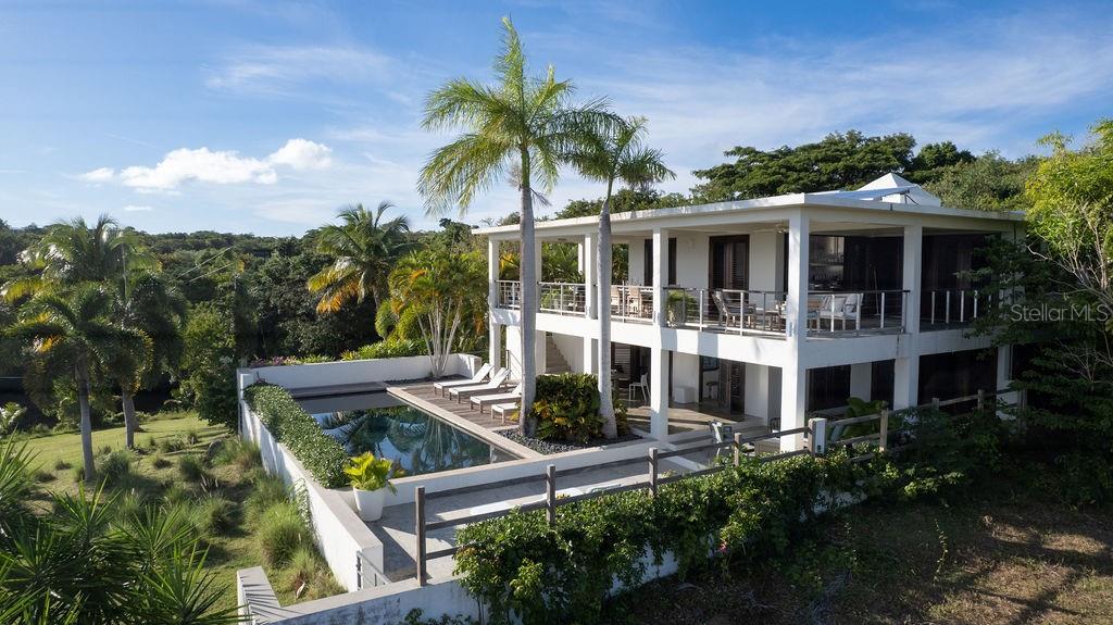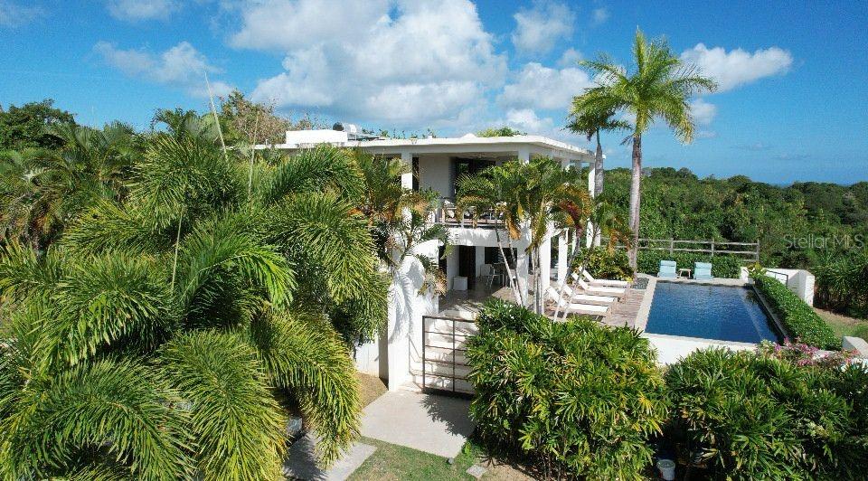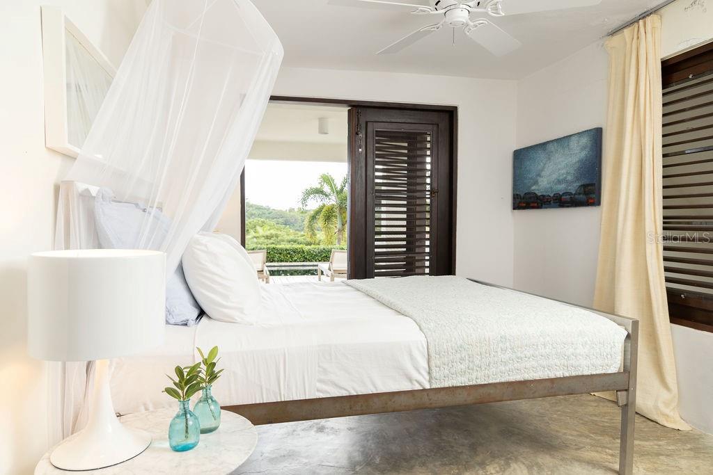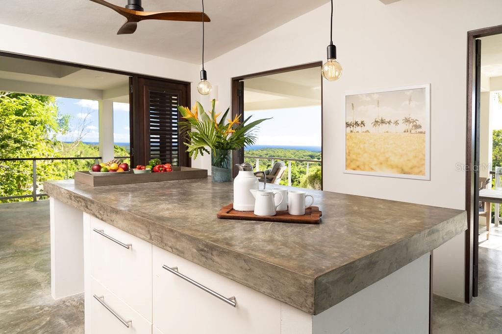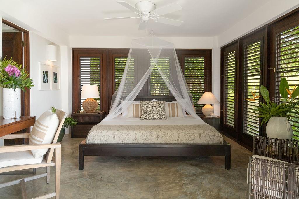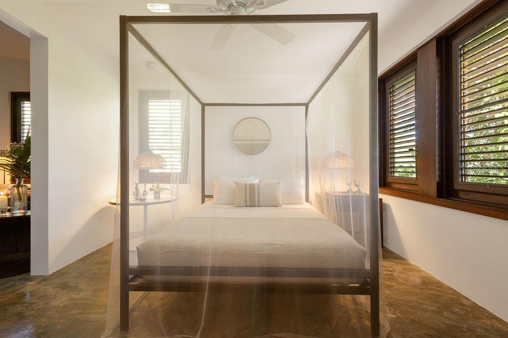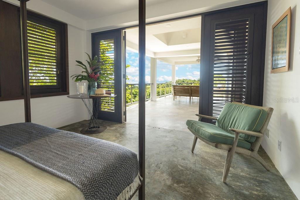 Un Poco De Fe, featured in Coastal Living magazine, is a state of the art villa located in the coveted tropical hills of el Pilón. As you enter into the property, a long tree-lined driveway leads to the highest point of the private lot, revealing this hidden architectural gem. The magical setting with stunning water views of the Caribbean sea is surrounded by nearly three acres of undeveloped lush land, giving the property a feel of seclusion without isolation. Embracing outdoor living, the house is wrapped in balconies and patios, gracefully opening out into nature and the expansive panoramic horizon. With custom Mahogany floor-to-ceiling French louvered doors and windows, the home was designed to maximize the gentle breeze and views of the Caribbean, St. Croix, and the rolling hills of Vieques. The south-facing home almost acts as a sundial, highlighting the changing light from sunrise to sunset through the day. Renowned Interior Designer Ray Booth designed the home, interiors and landscapes, harmoniously blending tropical and minimalist elegance. The open and spacious floor plan is evocative of Downtown loft meets Caribbean Hacienda, a perfect canvas to showcase a great collection of art. Warm lighting throughout the property creates an intimate ambience both in the private quarters and the many outdoor living and dining areas. The upper level has its principal living and dining areas, along with a principal bedroom suite. Among its many beautiful features, is a distinctive wrap-around terrace with outdoor dining and living spaces where the enchanting water views can be taken in. At the heart of the living space is an open gourmet kitchen, which has hand-crafted polished cement floors and counters surrounding a massive island with bar seating. On the eastern-side, the principal bedroom opens up to perfectly frame the sunrises and the ocean views. An adjacent private sitting room with ceiling height closets, can be a perfect spot for reading, study or a quiet work-from-home space. The large and airy bathroom has double sinks and an indulgent outdoor shower that welcomes in the afternoon sun. On the lower level are two bedroom, two bathroom private suites with a generous centrally located second full kitchen, outdoor dining and living areas, and work-from-home office with inspiring views. The king sized bedroom and study, which mimic their upper level counterparts, open out to the outdoor sitting area and pool-side lounge, which are all greeted by the sunrises and morning sun. On the western side, a queen sized bedroom opens up to the pool terrace and deck area, a perfect spot to catch the afternoon sun and watch the sunset over the hills. Each bathroom has a double-sink vanity, separate water closet and a spa-like outdoor shower. The Diamondbrite gunite pool’s warm and inviting waters create a mirror-like effect reflecting the changing sky throughout the day. Encompassed by mature gardens, an exquisite collection of palms, including two Royal Palms, bougainvillea, dracaena and other tropical plants, this property completely captivates with its picturesque lush tropical surroundings. The laundry room downstairs has a solar powered refrigerator and freezer and solar mechanicals. The home is partially solar powered, fully fenced and is a successful luxury rental, with 20-years of rental income. Can be easily utilized as a two-family house. Will be sold fully furnished with custom and imported pieces.