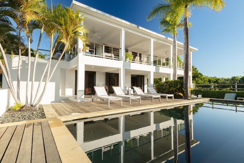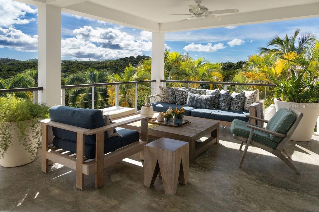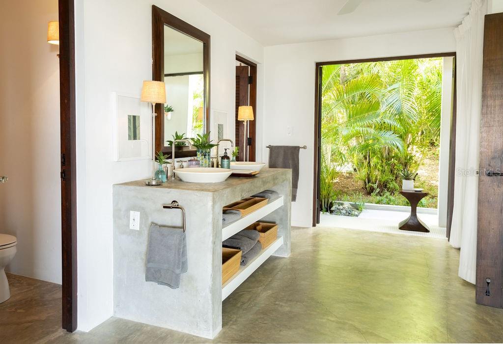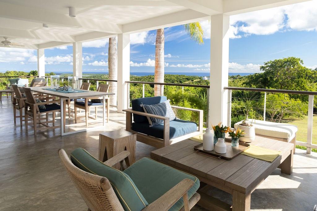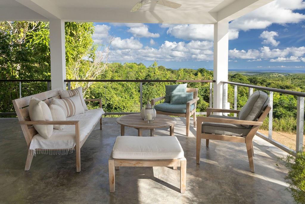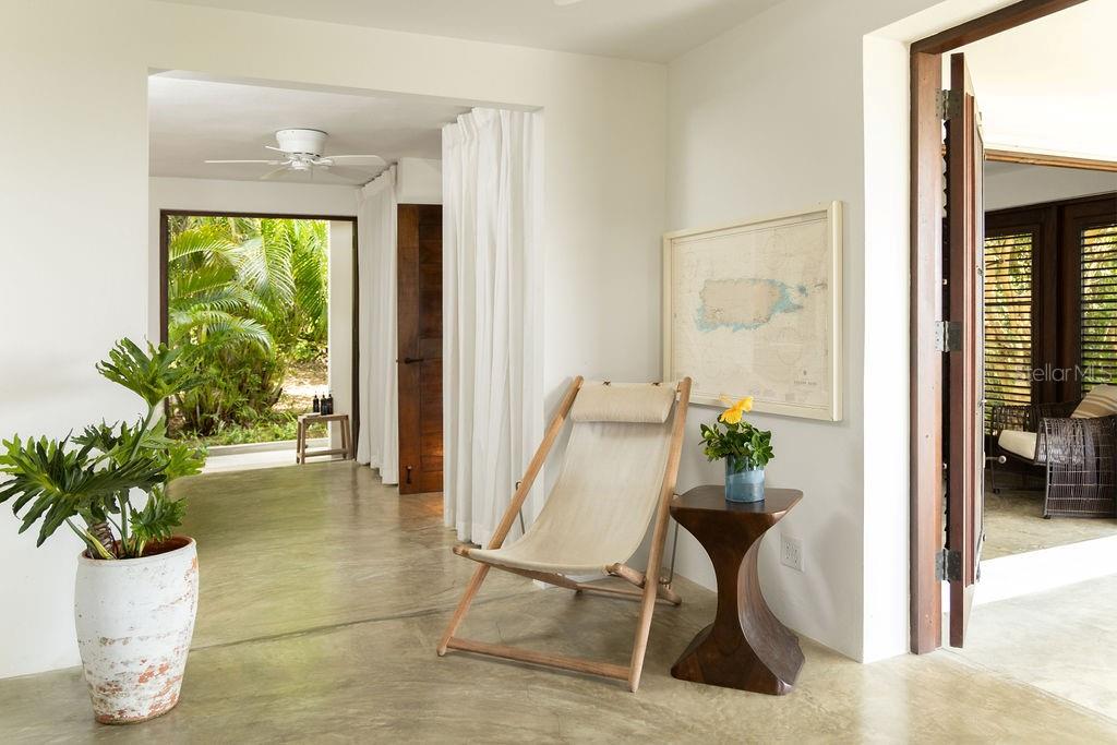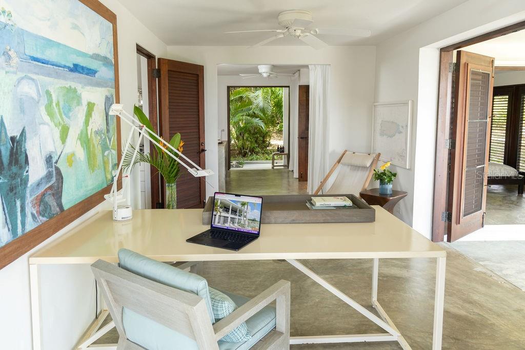 Un Poco De Fe, featured in Coastal Living magazine, is a state of the art villa located in the coveted tropical hills of el Pilón. As you enter into the property, a long tree-lined driveway leads to the highest point of the private lot, revealing this hidden architectural gem. The magical setting with stunning water views of the Caribbean sea is surrounded by nearly three acres of undeveloped lush land, giving the property a feel of seclusion without isolation. Embracing outdoor living, the house is wrapped in balconies and patios, gracefully opening out into nature and the expansive panoramic horizon. With custom Mahogany floor-to-ceiling French louvered doors and windows, the home was designed to maximize the gentle breeze and views of the Caribbean, St. Croix, and the rolling hills of Vieques. The south-facing home almost acts as a sundial, highlighting the changing light from sunrise to sunset through the day. Renowned Interior Designer Ray Booth designed the home, interiors and landscapes, harmoniously blending tropical and minimalist elegance. The open and spacious floor plan is evocative of Downtown loft meets Caribbean Hacienda, a perfect canvas to showcase a great collection of art. Warm lighting throughout the property creates an intimate ambience both in the private quarters and the many outdoor living and dining areas. The upper level has its principal living and dining areas, along with a principal bedroom suite. Among its many beautiful features, is a distinctive wrap-around terrace with outdoor dining and living spaces where the enchanting water views can be taken in. At the heart of the living space is an open gourmet kitchen, which has hand-crafted polished cement floors and counters surrounding a massive island with bar seating. On the eastern-side, the principal bedroom opens up to perfectly frame the sunrises and the ocean views. An adjacent private sitting room with ceiling height closets, can be a perfect spot for reading, study or a quiet work-from-home space. The large and airy bathroom has double sinks and an indulgent outdoor shower that welcomes in the afternoon sun. On the lower level are two bedroom, two bathroom private suites with a generous centrally located second full kitchen, outdoor dining and living areas, and work-from-home office with inspiring views. The king sized bedroom and study, which mimic their upper level counterparts, open out to the outdoor sitting area and pool-side lounge, which are all greeted by the sunrises and morning sun. On the western side, a queen sized bedroom opens up to the pool terrace and deck area, a perfect spot to catch the afternoon sun and watch the sunset over the hills. Each bathroom has a double-sink vanity, separate water closet and a spa-like outdoor shower. The Diamondbrite gunite pool’s warm and inviting waters create a mirror-like effect reflecting the changing sky throughout the day. Encompassed by mature gardens, an exquisite collection of palms, including two Royal Palms, bougainvillea, dracaena and other tropical plants, this property completely captivates with its picturesque lush tropical surroundings. The laundry room downstairs has a solar powered refrigerator and freezer and solar mechanicals. The home is partially solar powered, fully fenced and is a successful luxury rental, with 20-years of rental income. Can be easily utilized as a two-family house. Will be sold fully furnished with custom and imported pieces.