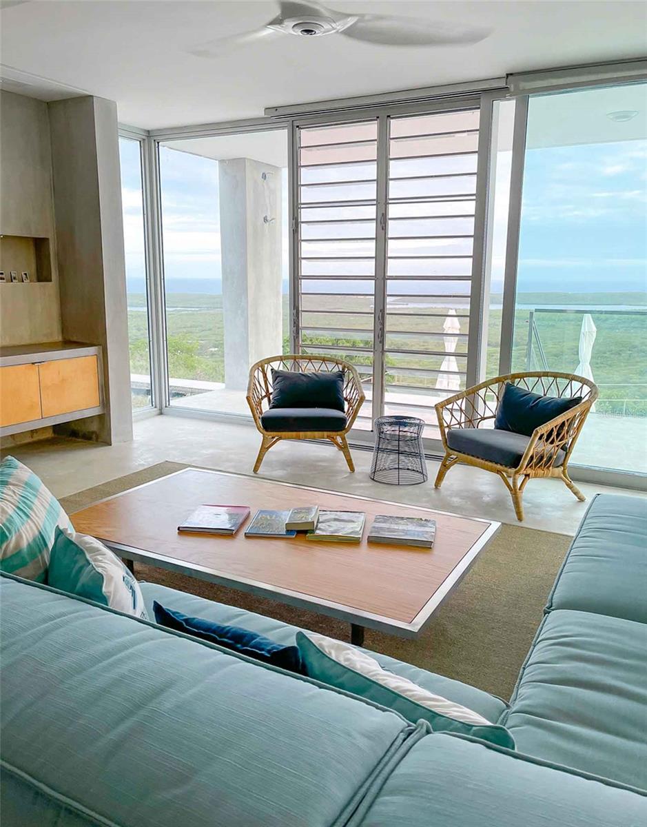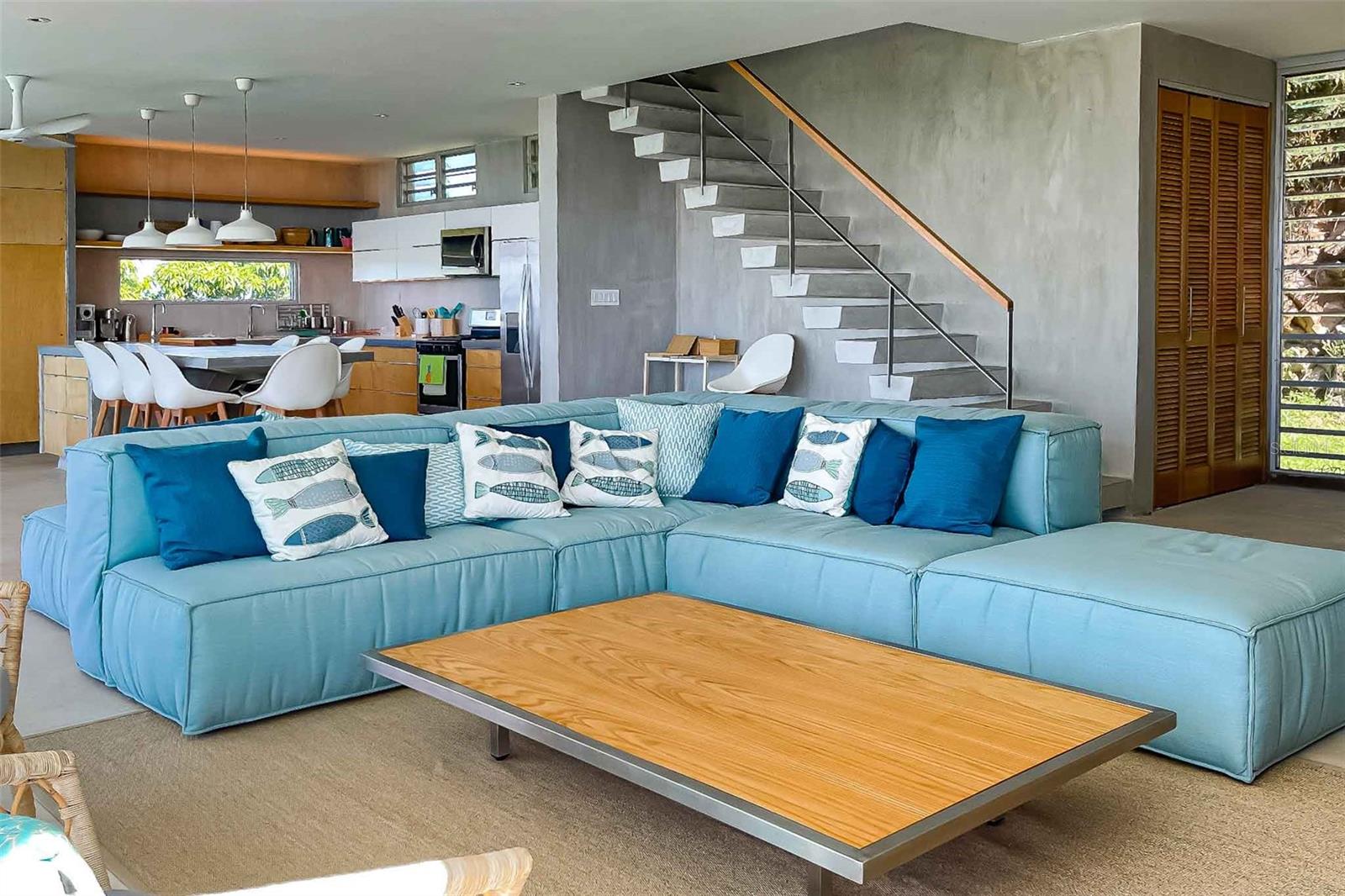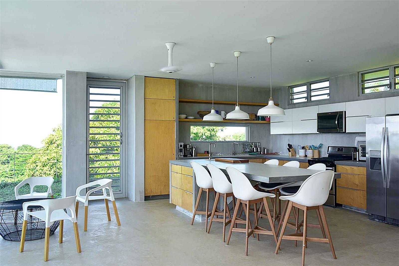 Casa Viento Norte on Vieques Island offers a luxurious Caribbean lifestyle. Imagine waking up to the Caribbean sun through floor-to-ceiling glass doors, with the scent of fresh coffee from your state-of-the-art kitchen. Located in the sought-after Los Chivos neighborhood, this property is more than just a home; it’s your dream Caribbean retreat. Designed by renowned architect Carlos Fierro, this contemporary tropical home features a polished concrete plaster finish, blending modern aesthetics with earthy appeal. Situated on one of the highest points of Vieques, Casa Viento Norte offers unobstructed views of both the north and south coasts. From the comfort of your home, gaze at the shimmering Caribbean Sea, the lush terrain towards Mount Pirata, and even catch a glimpse of El Yunque rainforest on the Puerto Rican mainland. Casa Viento Norte embraces its natural surroundings while offering modern luxury. The house is fully furnished with custom-made pieces crafted in Puerto Rico, so all you need is your toothbrush. The open-plan first floor seamlessly integrates indoor and outdoor spaces, perfect for entertaining or relaxing. Expansive sliding glass doors create a curtain wall of glass, leading you from the living area to the poolside patio and balcony. A large automatic cinema screen and recessed projector offer a cinematic experience at home. The chef’s kitchen centers around a sleek poured concrete island that seats eight and doubles as a bar or serving area. Top-of-the-line stainless steel appliances, custom-built cabinets, and modern finishes create a kitchen that’s as functional as it is stylish. The infinity-edge pool is the heart of Casa Viento Norte, offering breathtaking views of the world-famous BioBay, Esperanza, Puerto Ferro Bay, and Sun Bay. Solar-powered with automatic water level sensors, the pool is designed for effortless luxury. The second floor features three beautifully designed bedrooms, each with sliding glass doors opening onto a shared balcony. The primary bedroom is a private retreat with a king-size bed, en-suite bathroom, and a private terrace nook. The second bedroom can be configured with twin beds or a king-size bed, while the third bedroom offers a twin-full-trundle bunk bed. The shared bathroom includes a rain shower for a spa-like experience. The rooftop terrace, spanning 1400 square feet, offers another level of outdoor living space, perfect for yoga, sunset cocktails, or stargazing. Casa Viento Norte’s mechanical systems, including an 8000-gallon cistern and Danish pumps, ensure consistent water pressure, and circuits are ready for solar power, making off-grid living possible. The Rainbird soil irrigation system keeps the outdoor landscape lush and vibrant. Since its completion in 2022, Casa Viento Norte has been a popular short-term rental and family vacation home, offering a luxurious base to explore Vieques. Now, it’s your turn to experience the magic of Casa Viento Norte. This home is truly move-in ready, offering everything you need to start living your Caribbean dream. Whether you’re seeking a permanent residence, a vacation home, or an investment property, Casa Viento Norte is ready to welcome you. Contact us today to start your Caribbean adventure.