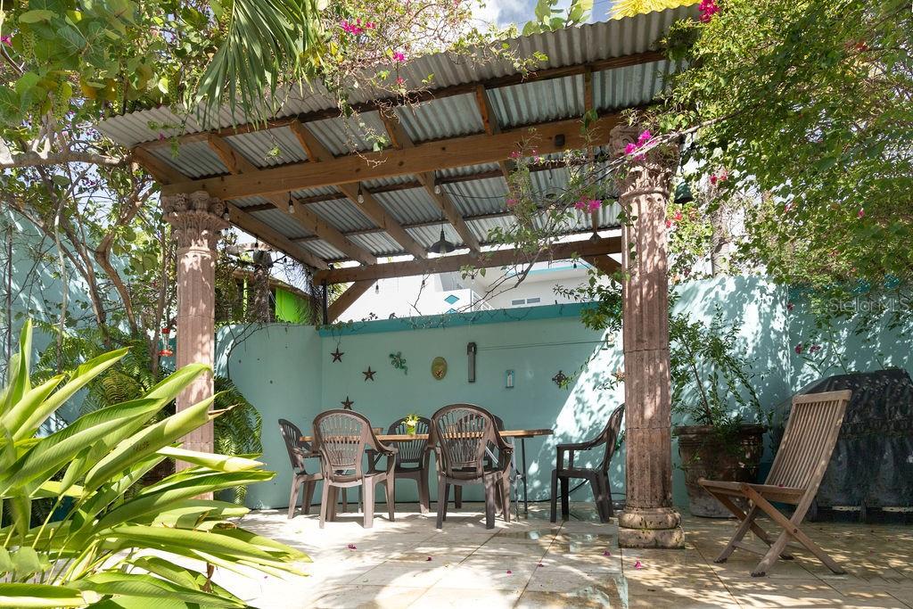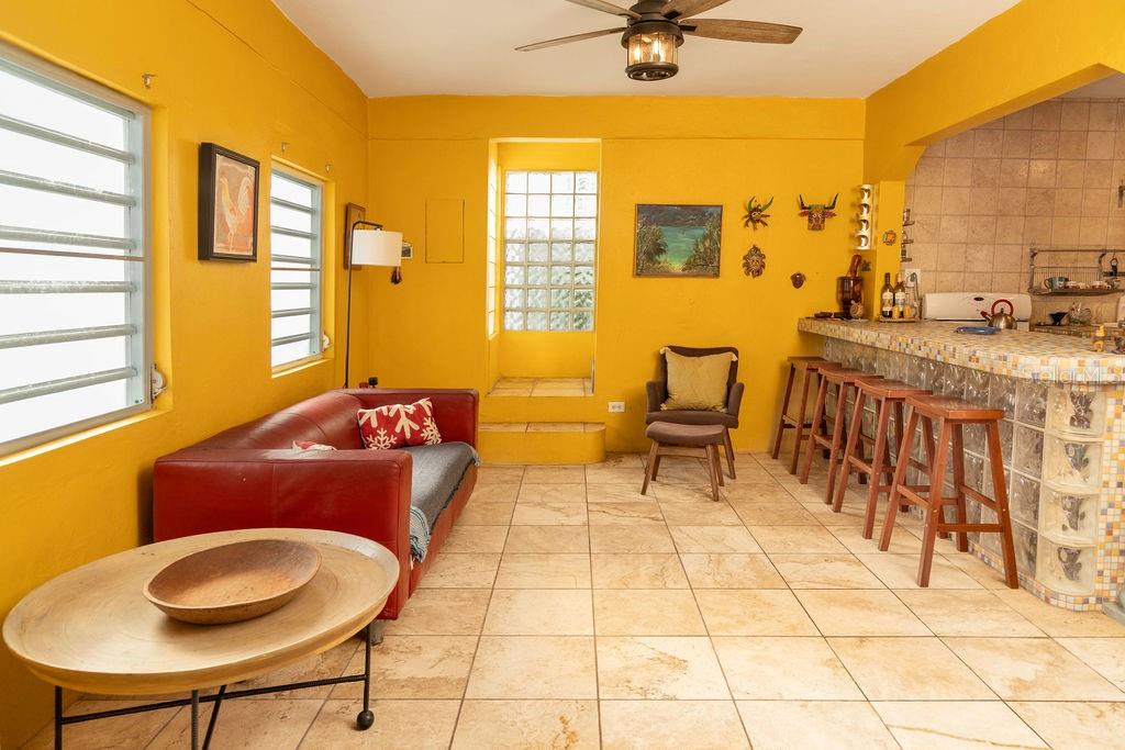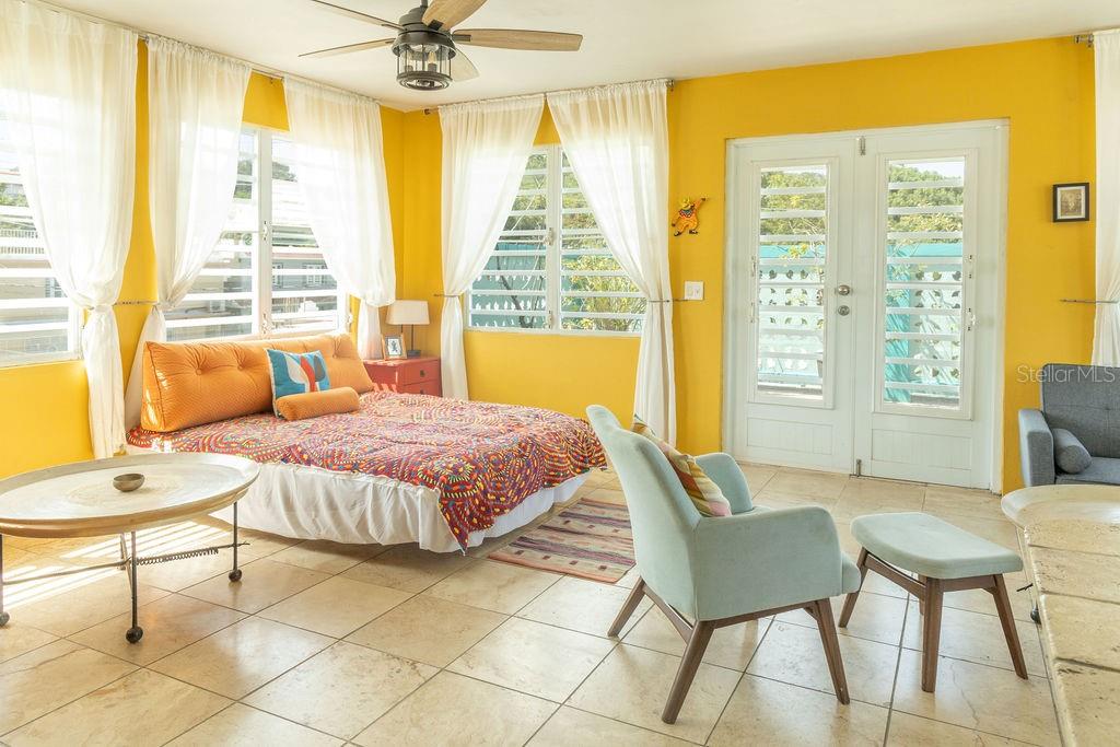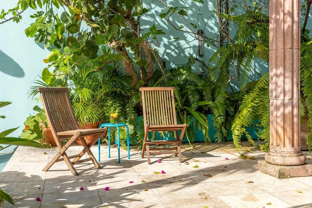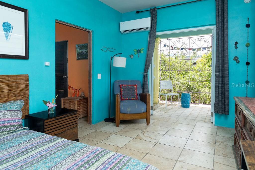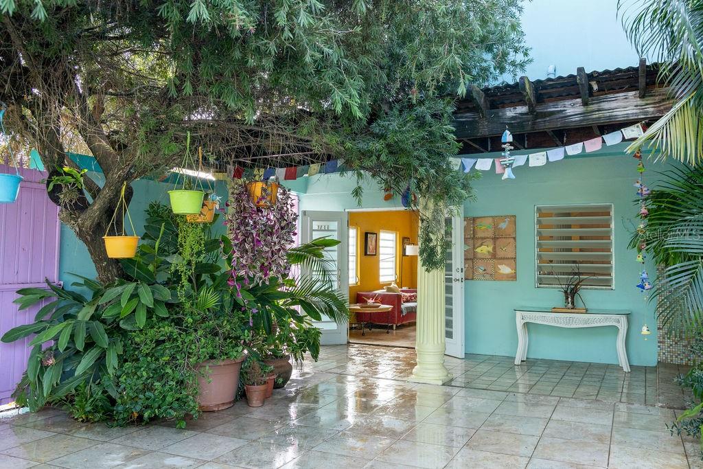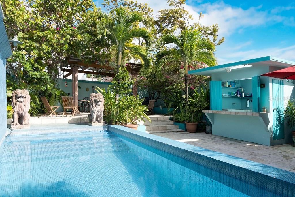 This urban three-story house is just a short walk from Playa de los Muertos (a.k.a. Sea Glass beach) and all the amenities of living in the Caribbean town of Isabel II. It’s traditional Spanish and colorful Creole architecture includes classic Puerto Rican breeze blocks and decorative rejas. Upon entering the property, a fabulous outdoor courtyard and garden reminiscent of Spanish Cloisters greets you. The elegantly centered pool is lined with iridescent blue tiles and flanked by the two sculptural lion fountains that give the home it’s name, fill the house with the water’s relaxing sound. The property is divided into three separate living quarters. The main level is perfect for entertaining and receiving guests. The common meeting grounds have an outdoor wet bar and poolside dining shaded under the bougainvillea, also great for spending the evenings playing cards or lounging with friends and family. The spectacular outdoor space connects with a spacious living room and oversized fully equipped kitchen with bar seating and dining space. At the rear is a full bath and a quiet air-conditioned guest bedroom with its own cozy and private outdoor green patio. The upper level principal suite is the ideal place to retreat from the urban atmosphere into a quiet and intimate environment and enjoy views of the north-side ocean. The large open area has an ensuite bathroom and kitchenette, offering the quarters complete privacy. The fully air-conditioned space also boasts it’s own living room for lounging and a dining/remote workspace. The outdoor balcony is a perfect place to hang a hammock, read a book or take a siesta surrounded by ocean views and plants. Below, the second level offers plenty of space for family and guests with two air-conditioned bedrooms with a shared full bathroom/laundry and living space. To the left a secondary bedroom has its own outdoor sitting area, while the righthand bedroom has it’s own workspace. The courtyard has a carport gate to station one car while away from Vieques. The outdoor pump room has space for additional storage. With a 3,312 sqft lot, its convenient location and beachside charm, this house would be a great place to call home or investment property.