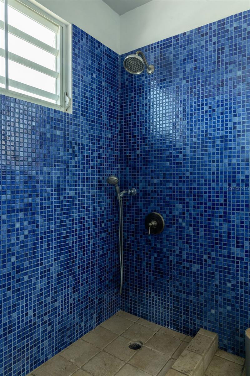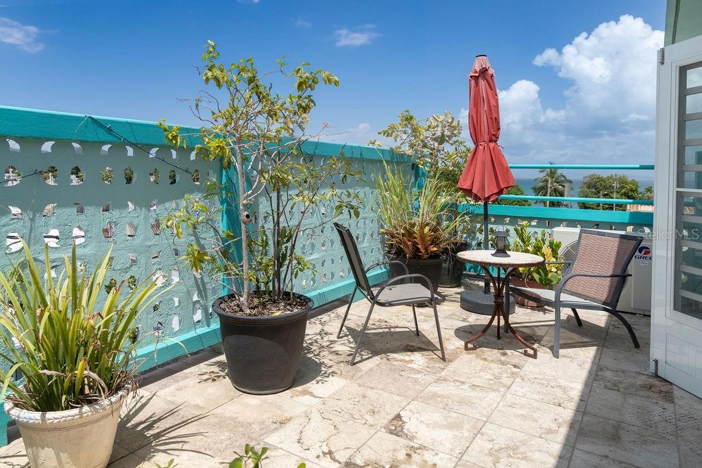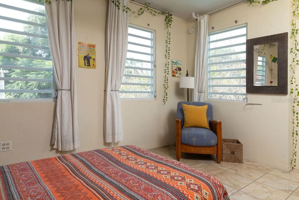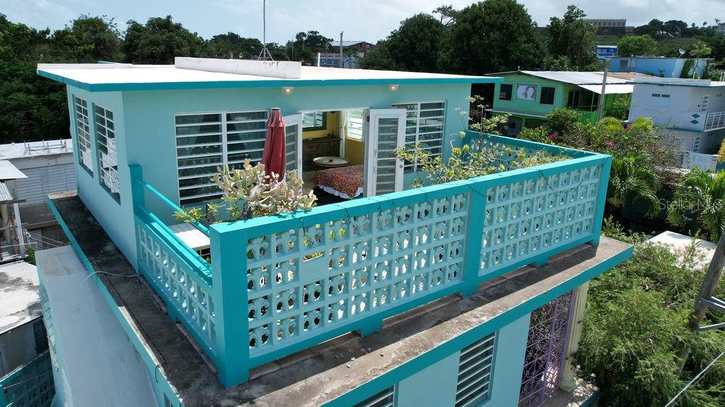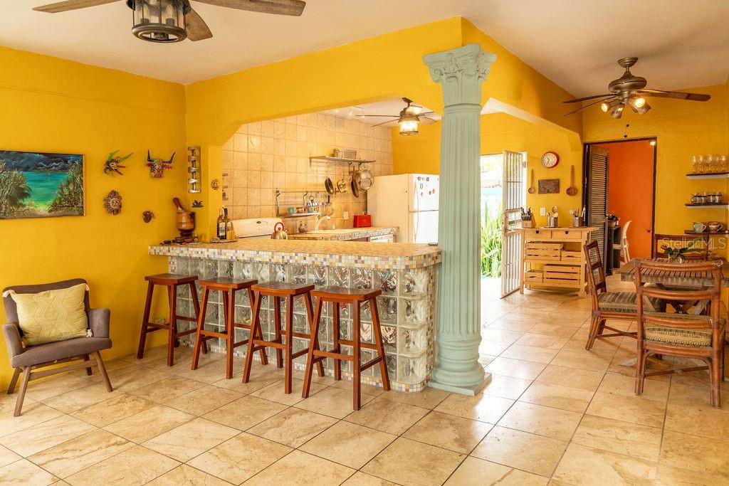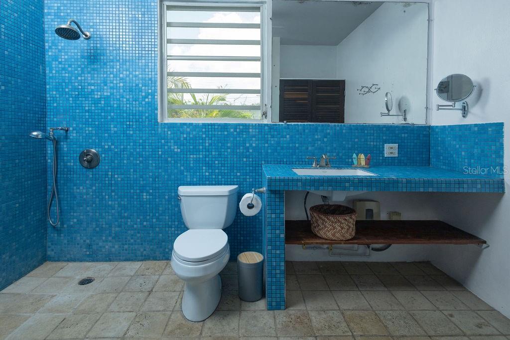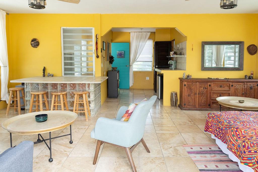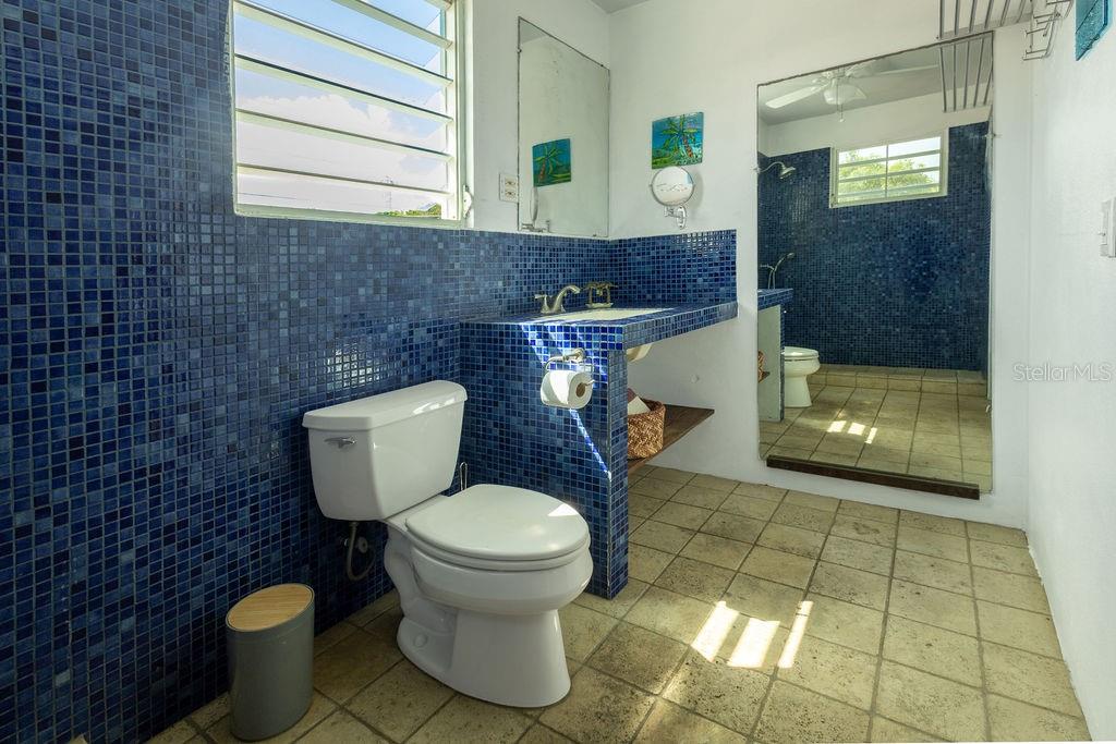 This urban three-story house is just a short walk from Playa de los Muertos (a.k.a. Sea Glass beach) and all the amenities of living in the Caribbean town of Isabel II. It’s traditional Spanish and colorful Creole architecture includes classic Puerto Rican breeze blocks and decorative rejas. Upon entering the property, a fabulous outdoor courtyard and garden reminiscent of Spanish Cloisters greets you. The elegantly centered pool is lined with iridescent blue tiles and flanked by the two sculptural lion fountains that give the home it’s name, fill the house with the water’s relaxing sound. The property is divided into three separate living quarters. The main level is perfect for entertaining and receiving guests. The common meeting grounds have an outdoor wet bar and poolside dining shaded under the bougainvillea, also great for spending the evenings playing cards or lounging with friends and family. The spectacular outdoor space connects with a spacious living room and oversized fully equipped kitchen with bar seating and dining space. At the rear is a full bath and a quiet air-conditioned guest bedroom with its own cozy and private outdoor green patio. The upper level principal suite is the ideal place to retreat from the urban atmosphere into a quiet and intimate environment and enjoy views of the north-side ocean. The large open area has an ensuite bathroom and kitchenette, offering the quarters complete privacy. The fully air-conditioned space also boasts it’s own living room for lounging and a dining/remote workspace. The outdoor balcony is a perfect place to hang a hammock, read a book or take a siesta surrounded by ocean views and plants. Below, the second level offers plenty of space for family and guests with two air-conditioned bedrooms with a shared full bathroom/laundry and living space. To the left a secondary bedroom has its own outdoor sitting area, while the righthand bedroom has it’s own workspace. The courtyard has a carport gate to station one car while away from Vieques. The outdoor pump room has space for additional storage. With a 3,312 sqft lot, its convenient location and beachside charm, this house would be a great place to call home or investment property.