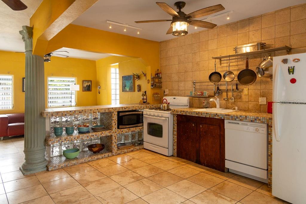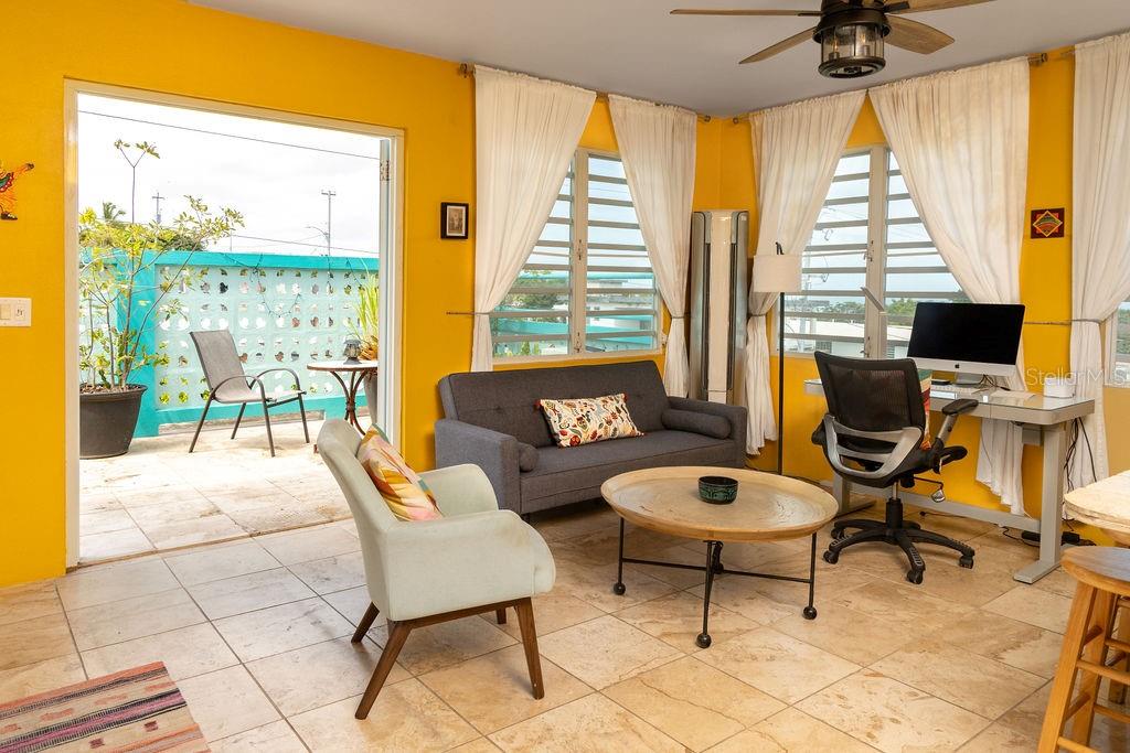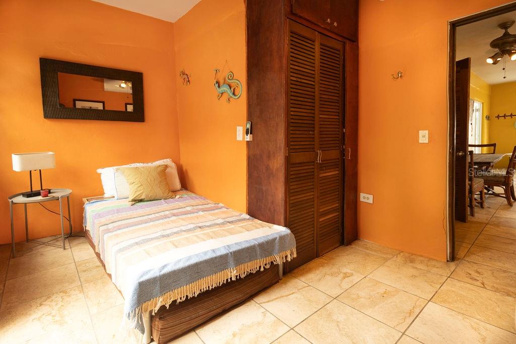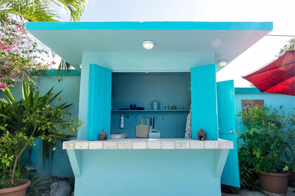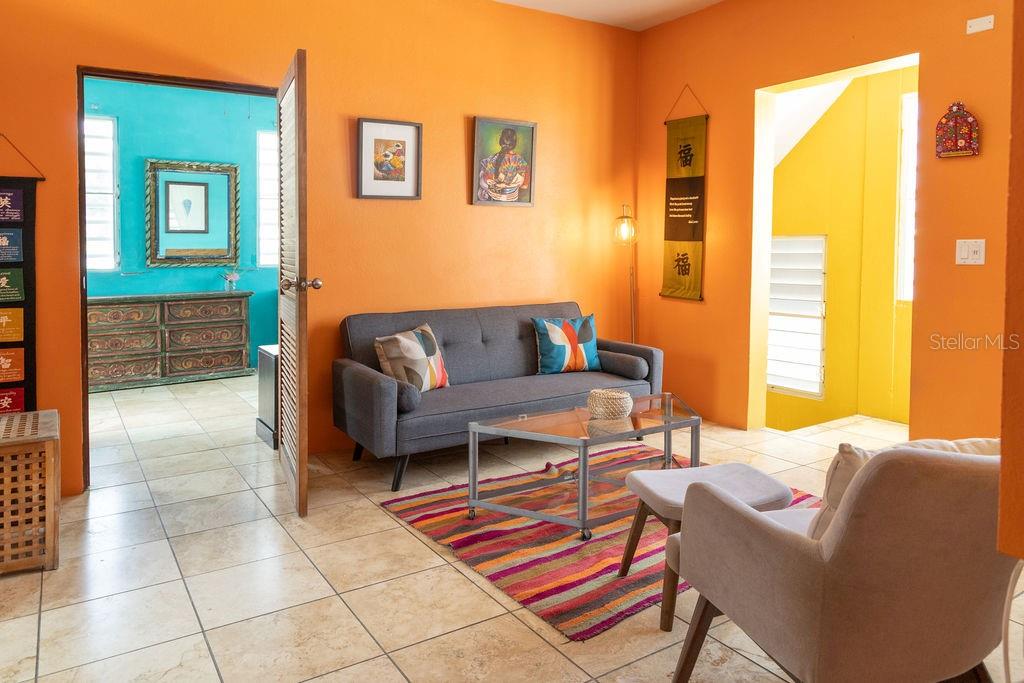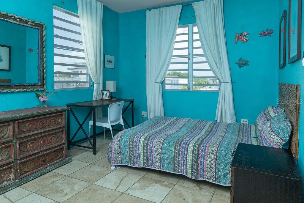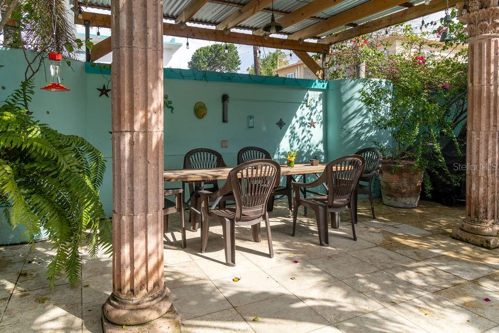 This urban three-story house is just a short walk from Playa de los Muertos (a.k.a. Sea Glass beach) and all the amenities of living in the Caribbean town of Isabel II. It’s traditional Spanish and colorful Creole architecture includes classic Puerto Rican breeze blocks and decorative rejas. Upon entering the property, a fabulous outdoor courtyard and garden reminiscent of Spanish Cloisters greets you. The elegantly centered pool is lined with iridescent blue tiles and flanked by the two sculptural lion fountains that give the home it’s name, fill the house with the water’s relaxing sound. The property is divided into three separate living quarters. The main level is perfect for entertaining and receiving guests. The common meeting grounds have an outdoor wet bar and poolside dining shaded under the bougainvillea, also great for spending the evenings playing cards or lounging with friends and family. The spectacular outdoor space connects with a spacious living room and oversized fully equipped kitchen with bar seating and dining space. At the rear is a full bath and a quiet air-conditioned guest bedroom with its own cozy and private outdoor green patio. The upper level principal suite is the ideal place to retreat from the urban atmosphere into a quiet and intimate environment and enjoy views of the north-side ocean. The large open area has an ensuite bathroom and kitchenette, offering the quarters complete privacy. The fully air-conditioned space also boasts it’s own living room for lounging and a dining/remote workspace. The outdoor balcony is a perfect place to hang a hammock, read a book or take a siesta surrounded by ocean views and plants. Below, the second level offers plenty of space for family and guests with two air-conditioned bedrooms with a shared full bathroom/laundry and living space. To the left a secondary bedroom has its own outdoor sitting area, while the righthand bedroom has it’s own workspace. The courtyard has a carport gate to station one car while away from Vieques. The outdoor pump room has space for additional storage. With a 3,312 sqft lot, its convenient location and beachside charm, this house would be a great place to call home or investment property.