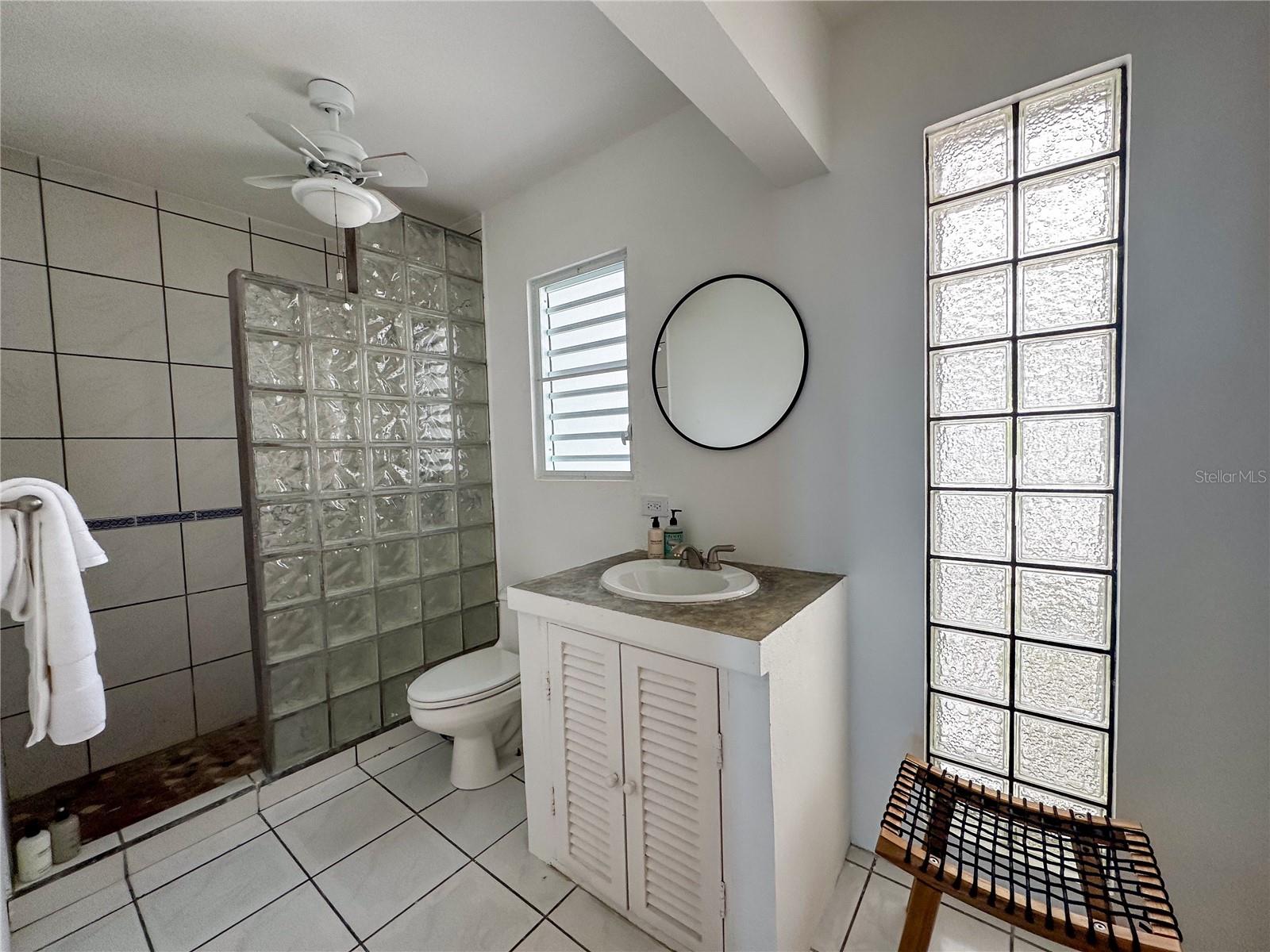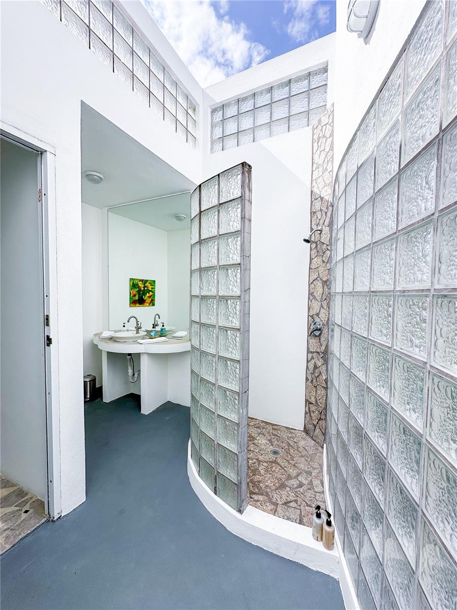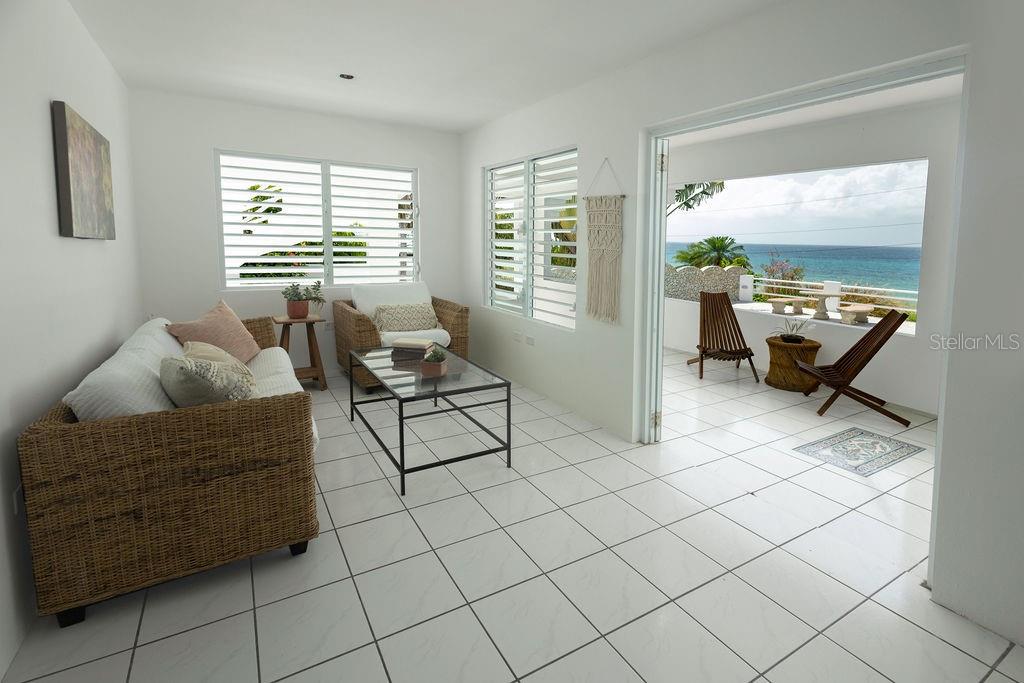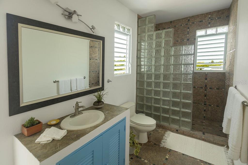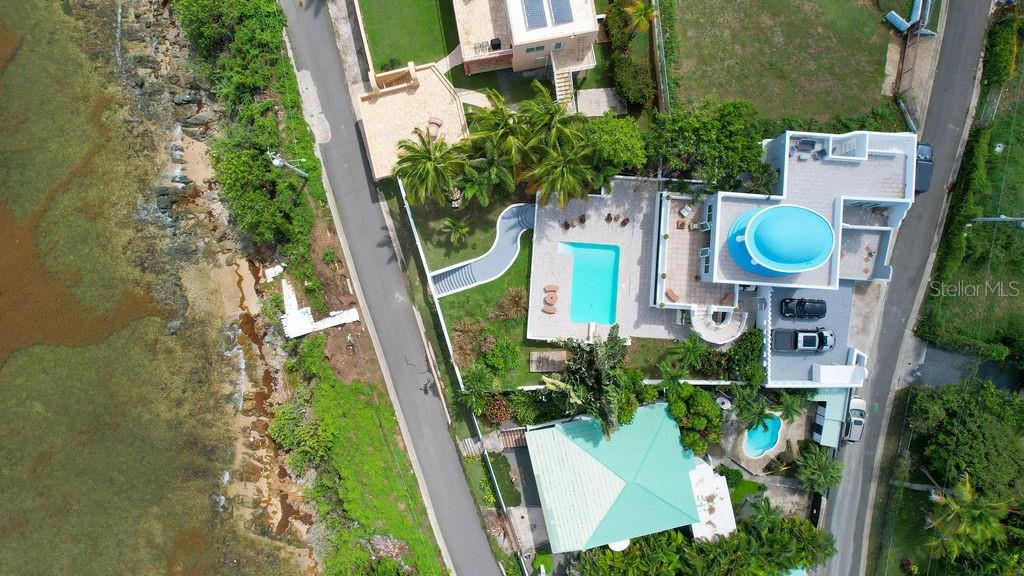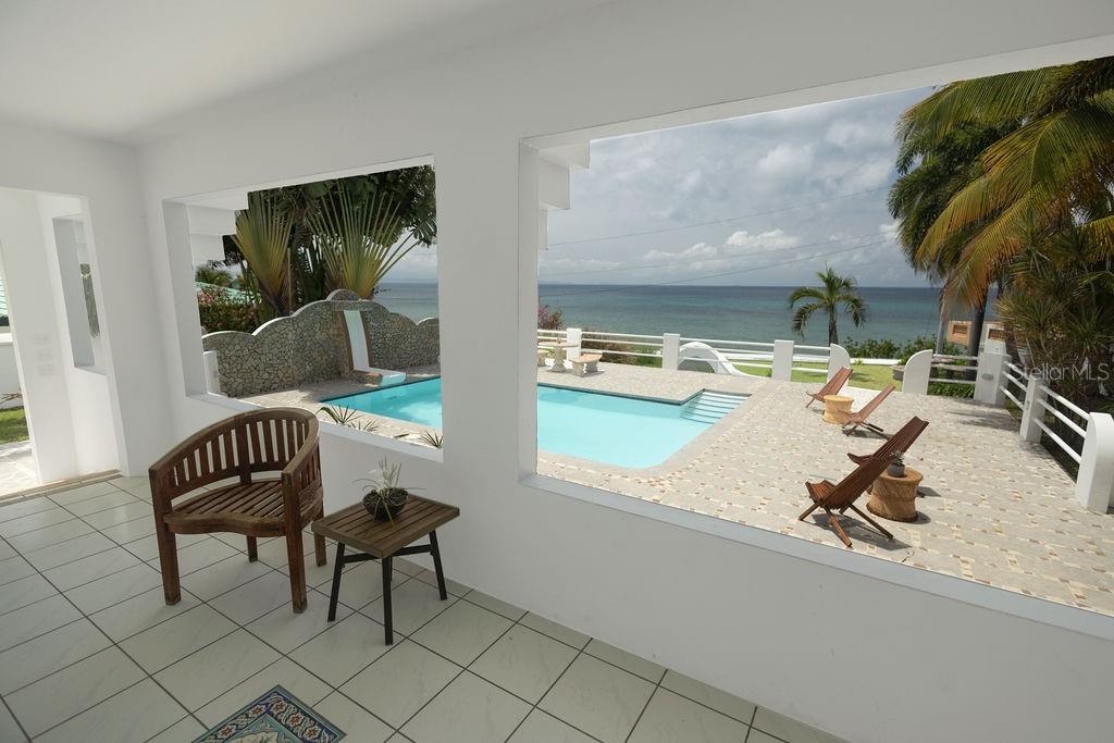 Villa La Riposa is beachfront living at its best. This amazing oceanfront property sits on a large lot that extends between two streets in the exclusive Bravos de Boston neighborhood. The property is bounded by the north shore beaches and is a 15 min walk to all the commodities in Isabel II (the ferry, restaurants, shops, and markets), and just 15 minutes from the airport (by car). It’s promontory location gives the property a sense of seclusion and allows for unobstructed 180 ocean views. The art deco style villa elegantly mixes Mediterranean and Caribbean architecture. It’s distinct blue dome has become iconic of the North Shore skyline. The most spectacular space is the upper level apartment which has a unique European vibe with its stone mosaic floors, cathedral-esque arches, and grecian style louvered cabinets. The back drop from the main living space and the large outdoor lounge are the magnificent pool and turquoise ocean. Some of the spaces best features are the exterior bathroom and the amazing rooftop duomo with views of the mainland, Palomino and Culebra. Its doric columns frame the spectacular sunrises and sunsets during the morning and evening hours and the ferries can be seen as they come and go during the days. The lower level apartments each are fully equipped and have their own outdoor spaces and separate entrances. Guests can enjoy a private dinner or evening in but come together for gatherings in the large garden terrace that surrounds the pool and fountain. All the spaces are interconnected and have access to the ocean with a natural tide pool via a stairway built into the rocky cliffside. Every room has it’s own AC unit. The villa also has a parking area for up to three cars and additional private street parking, outdoor storage, and an outdoor shower by the pool area. The villa can be a great home, vacation escape, or an income producing rental.