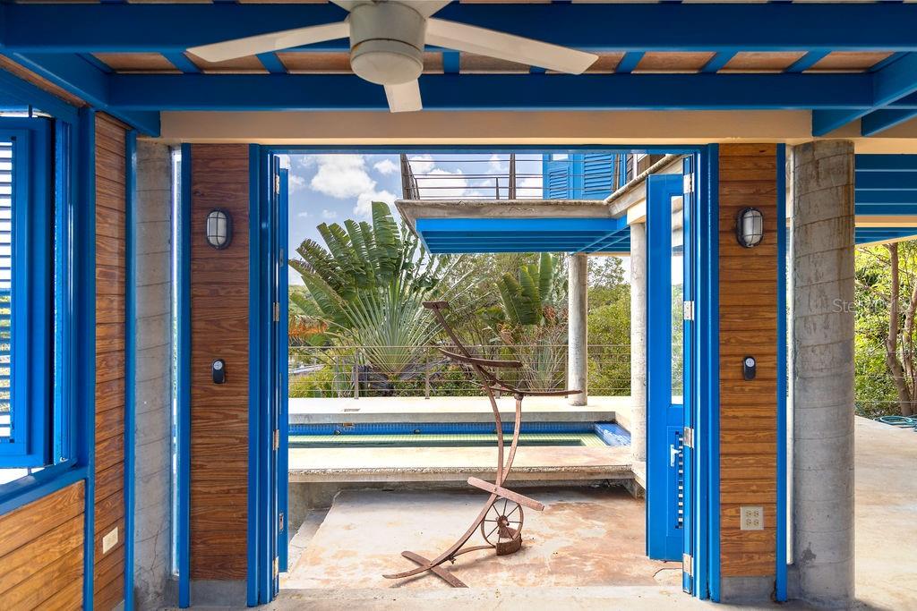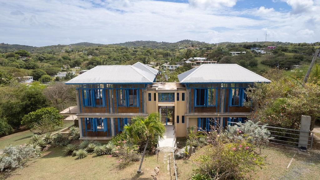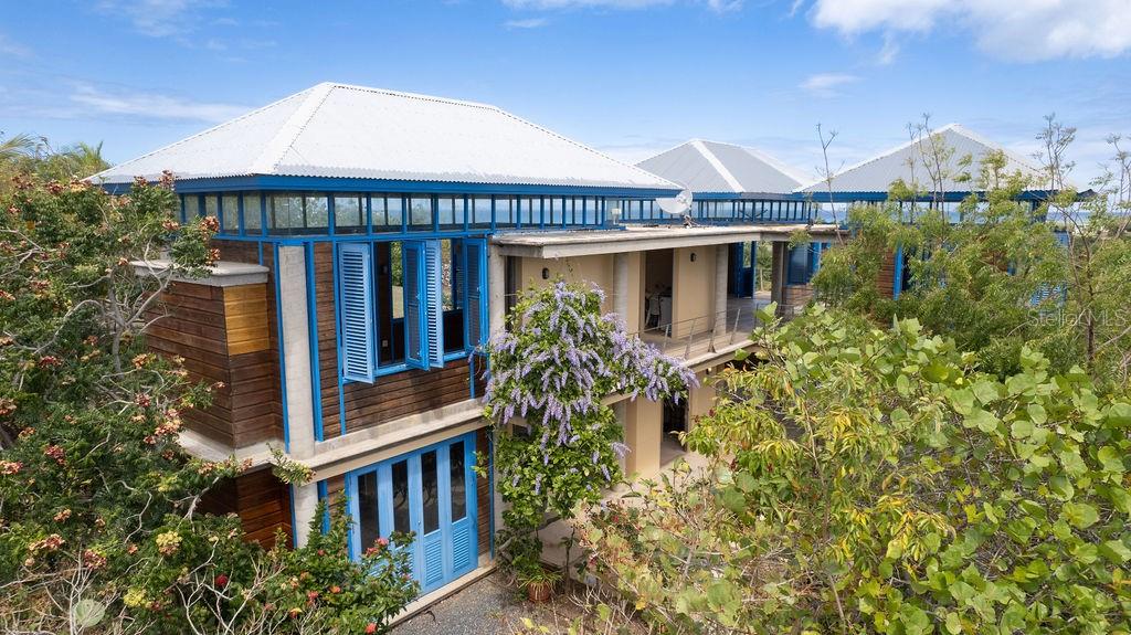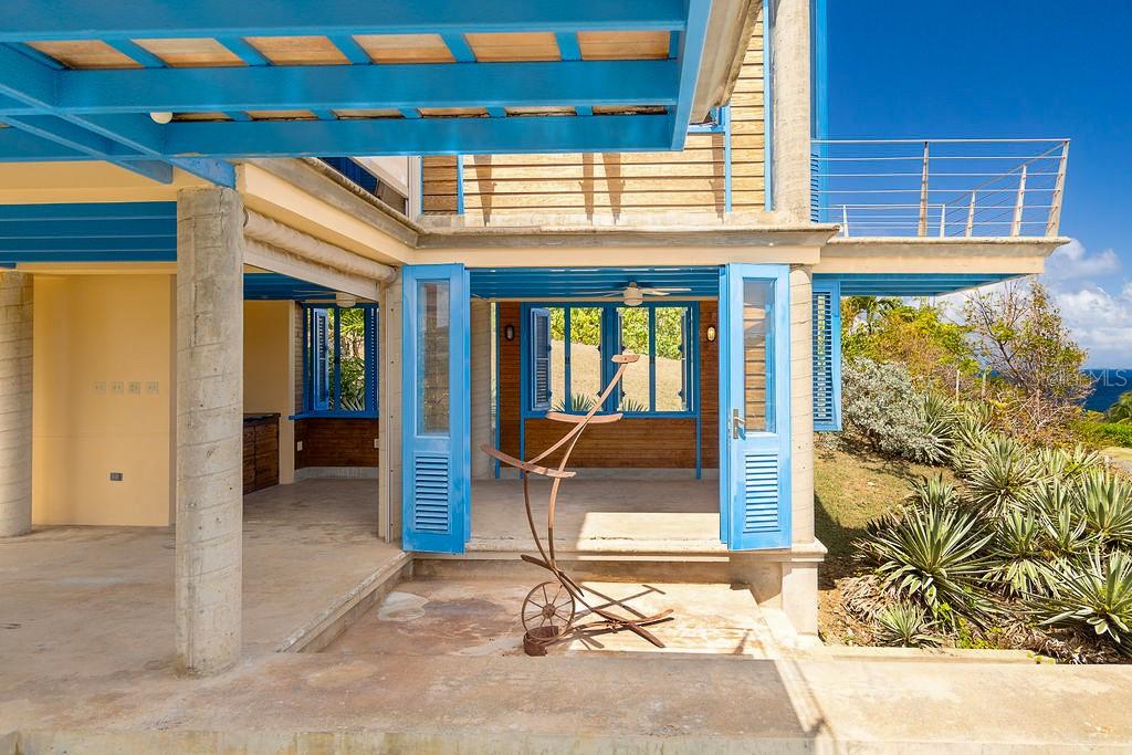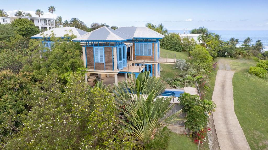 This exclusive house inspired by traditional turn-of-the-century Puerto Rican architecture, was designed by renowned architect Pablo Ojeda, whose work has earned international recognition, including the 2001 URBE Prize for Architectural Excellence in Design and Construction. Ideally situated atop a hill at the end of a private road, this home offers constant breezes throughout and sweeping sea views over the lush tropical foliage of the valley below. The main island, Culebra and St. Thomas can be seen dotting the horizon from multiple parts of the house. With a total 0.7 acres, this property is a rare find in the highly desirable neighborhood of Bravos de Boston which is coveted for, among other things, its proximity to the sea, the ferry, and the shops, restaurants and cafes of Isabel II. The house’s design embraces traditional materials and construction methods reimagined for modern tropical living. Intentionally oriented to take advantage of the ocean views and sea breezes, t’s massive blue French doors and louvered windows open up to various outdoor balconies and living spaces, blurring the line between indoors and outdoors. The surrounding mature gardens and plantings in the central courtyard complement the architecture and bring nature into the heart of the home. Polished cement floors and countertops add a contemporary touch while being easy to maintain. The soothing sound of the fountain coupled with the backdrop of the ocean waves and local birds, envelops you in the serene tropical landscape as you relax by the pool. The house can be accessed by a quaint pedestrian pathway via the courtyard or via the parking area over an elevated walkway that leads to a split-level entryway. Spanning approximately 2,000 sqft, the home is spread across two levels, with the main living areas on the upper level and guest and communal spaces on the lower level. On the upper level, the dining area, which has both sea and courtyard views, leads into the kitchen, which has ample counter and storage space and room for an island or small breakfast nook. Off the kitchen is a sea-facing balcony; a perfect place for a morning coffee or evening cocktails. The adjacent living room features soaring ceilings and clerestory windows that allow natural light to seep in. At the end of the living room in another sea-facing balcony. To the rear is the master suite with an ensuite bathroom, including a luxurious soaking tub. The upper level also includes a half-bathroom which can also accommodate a washer/dryer. The main focal point of the lower level is the flora-filled courtyard terrace. Toward the back-end of the property is a large bedroom with an ensuite bathroom, which can also be accessed directly from the adjacent terrace. This bedroom has an outdoor seating area accessible through a separate entrance. Toward the front is an ocean-facing the tiered pool area, which has ample room for a shaded dining area. Directly adjacent is a guest suite and kitchenette, with accordion doors that open up to the pool. A storage room with plumbing provides the potential for easy conversion into a third full bathroom. The grounds include a spacious parking area bordered by olive trees, a variety of palms, oleander, cactuses, and tropical plants. The house is just a two-minute walk to the pristine waters of La Chata beach and a four-minute drive to town.