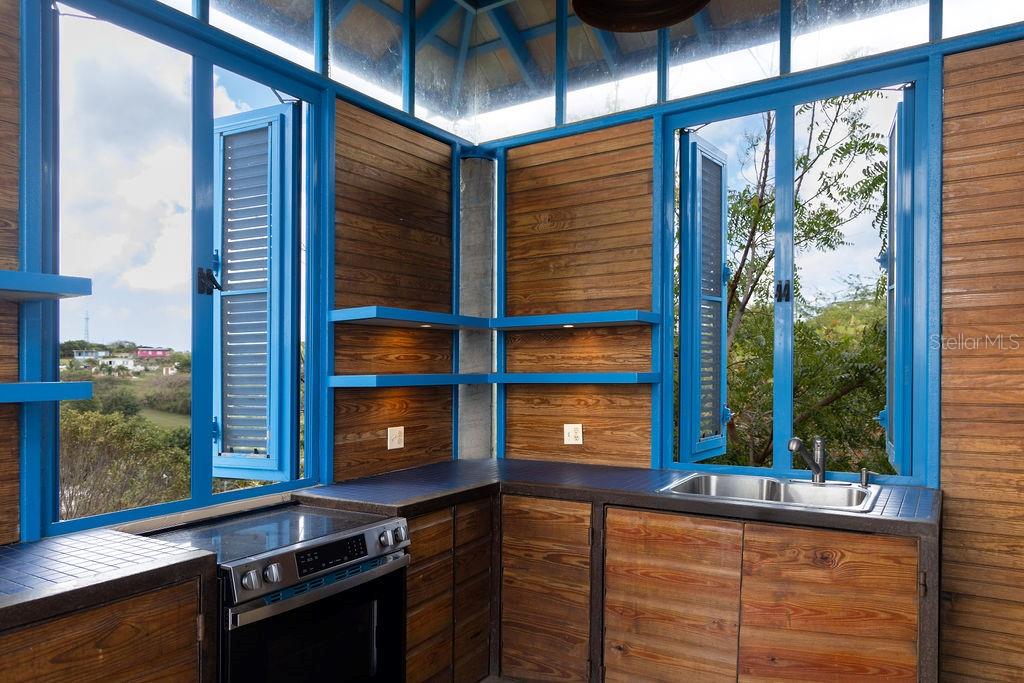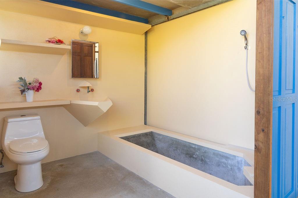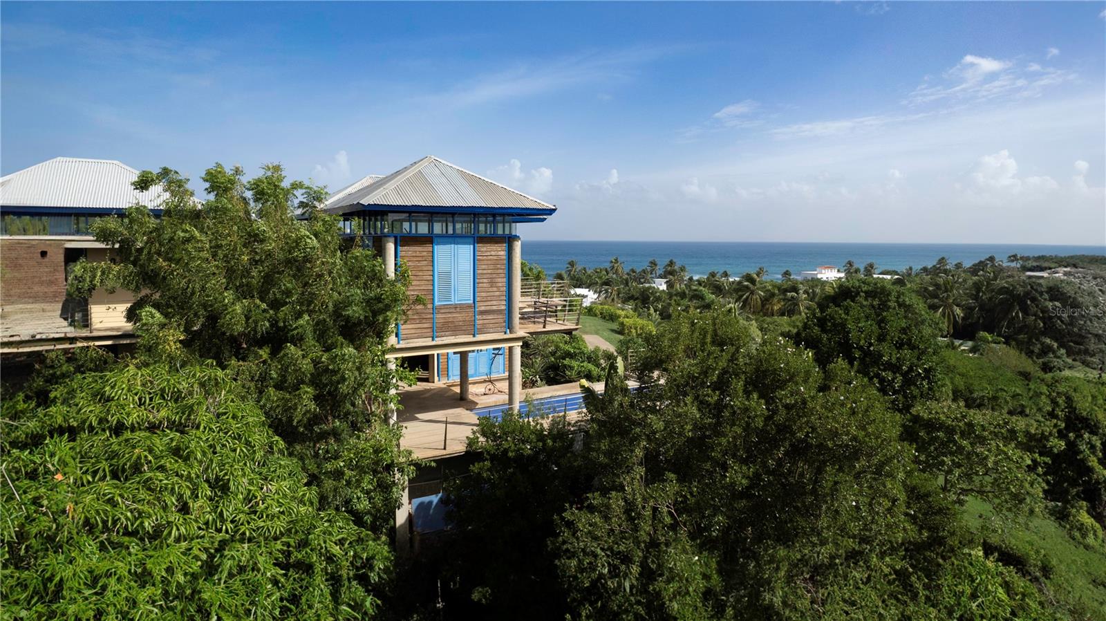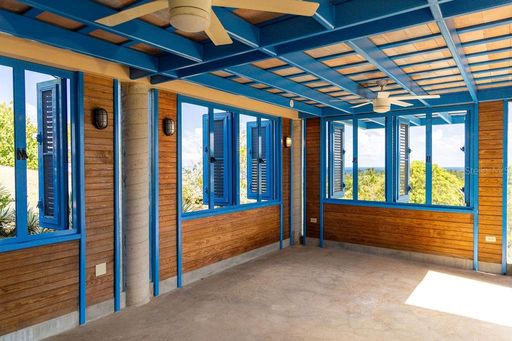 This exclusive house inspired by traditional turn-of-the-century Puerto Rican architecture, was designed by renowned architect Pablo Ojeda, whose work has earned international recognition, including the 2001 URBE Prize for Architectural Excellence in Design and Construction. Ideally situated atop a hill at the end of a private road, this home offers constant breezes throughout and sweeping sea views over the lush tropical foliage of the valley below. The main island, Culebra and St. Thomas can be seen dotting the horizon from multiple parts of the house. With a total 0.7 acres, this property is a rare find in the highly desirable neighborhood of Bravos de Boston which is coveted for, among other things, its proximity to the sea, the ferry, and the shops, restaurants and cafes of Isabel II. The house’s design embraces traditional materials and construction methods reimagined for modern tropical living. Intentionally oriented to take advantage of the ocean views and sea breezes, t’s massive blue French doors and louvered windows open up to various outdoor balconies and living spaces, blurring the line between indoors and outdoors. The surrounding mature gardens and plantings in the central courtyard complement the architecture and bring nature into the heart of the home. Polished cement floors and countertops add a contemporary touch while being easy to maintain. The soothing sound of the fountain coupled with the backdrop of the ocean waves and local birds, envelops you in the serene tropical landscape as you relax by the pool. The house can be accessed by a quaint pedestrian pathway via the courtyard or via the parking area over an elevated walkway that leads to a split-level entryway. Spanning approximately 2,000 sqft, the home is spread across two levels, with the main living areas on the upper level and guest and communal spaces on the lower level. On the upper level, the dining area, which has both sea and courtyard views, leads into the kitchen, which has ample counter and storage space and room for an island or small breakfast nook. Off the kitchen is a sea-facing balcony; a perfect place for a morning coffee or evening cocktails. The adjacent living room features soaring ceilings and clerestory windows that allow natural light to seep in. At the end of the living room in another sea-facing balcony. To the rear is the master suite with an ensuite bathroom, including a luxurious soaking tub. The upper level also includes a half-bathroom which can also accommodate a washer/dryer. The main focal point of the lower level is the flora-filled courtyard terrace. Toward the back-end of the property is a large bedroom with an ensuite bathroom, which can also be accessed directly from the adjacent terrace. This bedroom has an outdoor seating area accessible through a separate entrance. Toward the front is an ocean-facing the tiered pool area, which has ample room for a shaded dining area. Directly adjacent is a guest suite and kitchenette, with accordion doors that open up to the pool. A storage room with plumbing provides the potential for easy conversion into a third full bathroom. The grounds include a spacious parking area bordered by olive trees, a variety of palms, oleander, cactuses, and tropical plants. The house is just a two-minute walk to the pristine waters of La Chata beach and a four-minute drive to town.