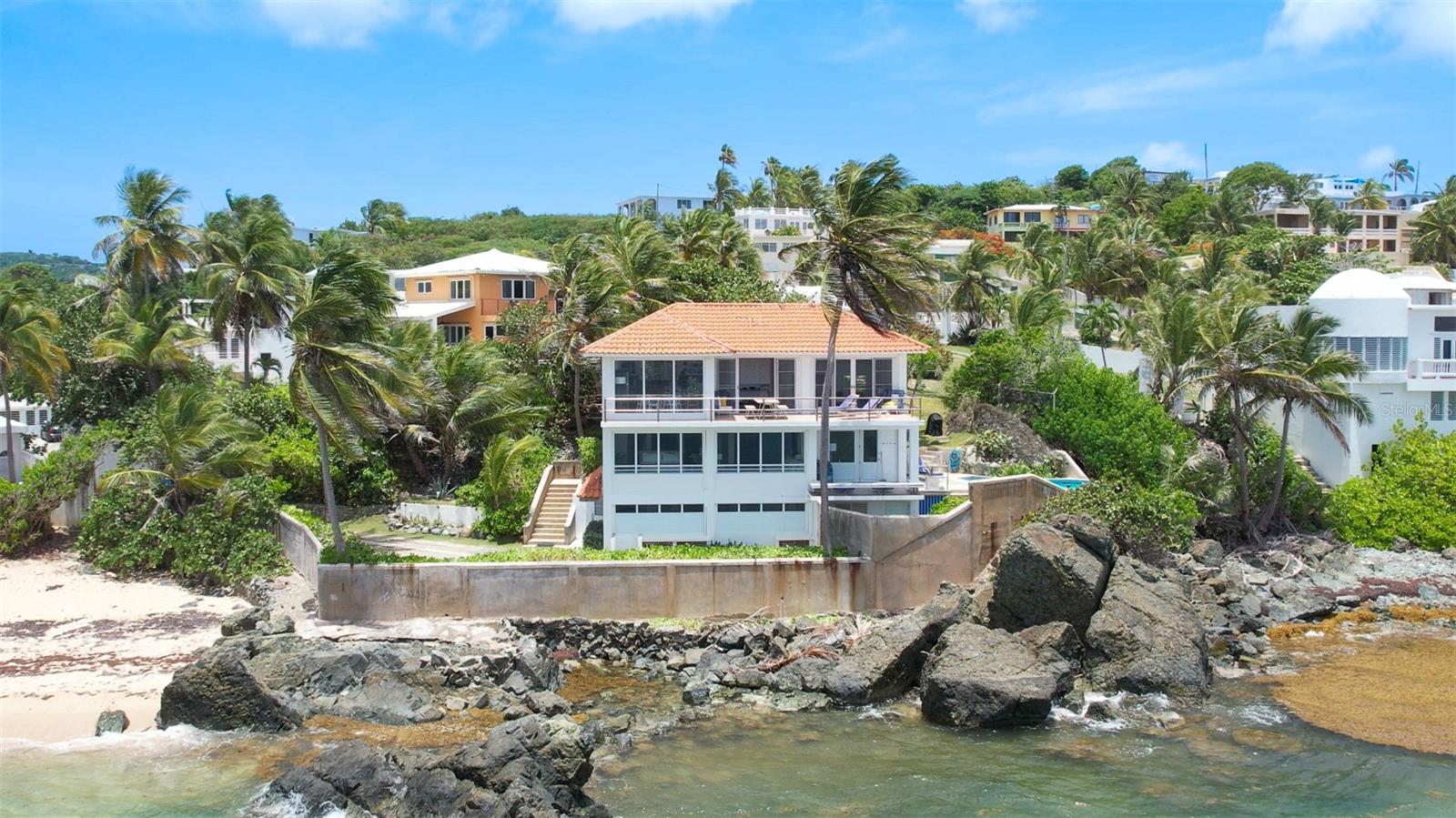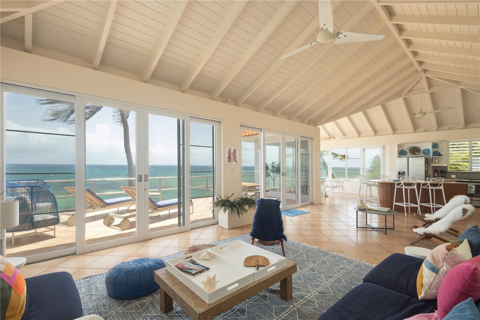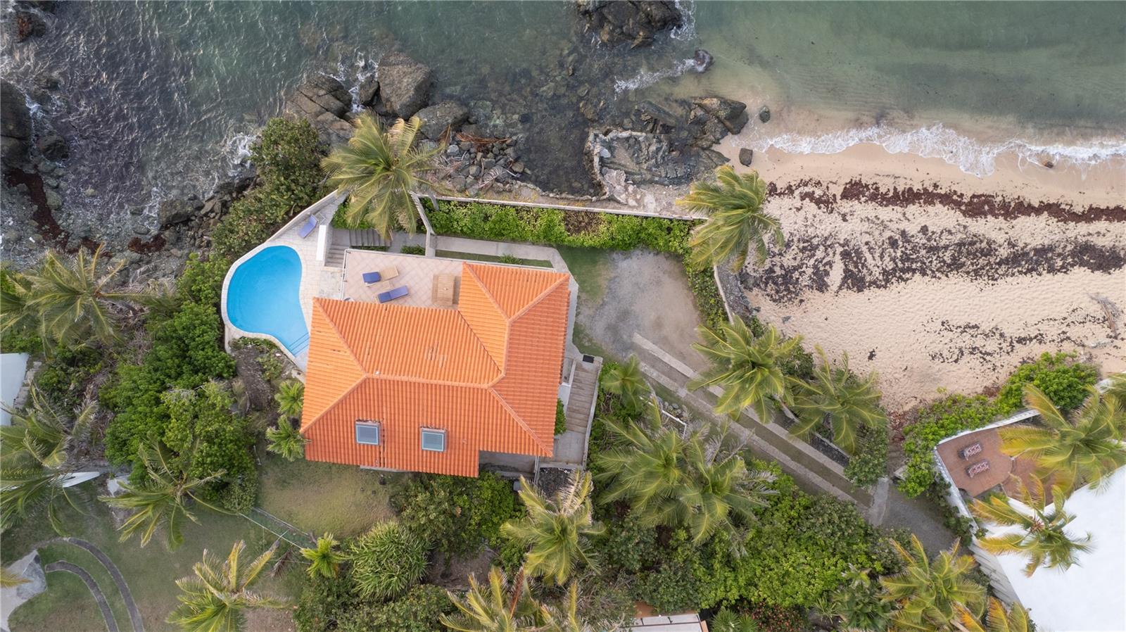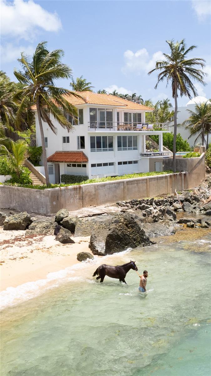 Las Piedras is a rare oceanfront property offering unmatched views and a remarkable connection to its surroundings. Set just above the clear waters of Vieques’ north shore, the home captures a full 180-degree view of the Caribbean—stretching from the coral-lined shallows below to the distant outlines of Culebra, St. Thomas, and St. John on the horizon. To the west, the mountains of mainland Puerto Rico rise against the sky, anchoring the landscape in every direction. A private driveway lined with mature palms and dense tropical foliage leads to the home’s entrance, which reveals a contemporary structure with subtle Spanish Colonial elements—most notably its terracotta-tiled, hipped roof. The three-story residence is solidly built and thoughtfully laid out, with four bedrooms, two and a half baths, and multiple indoor-outdoor living areas that make the most of the setting. The upper level is the heart of the home, with vaulted ceilings and an open-concept kitchen, dining, and living area. Floor-to-ceiling windows and doors frame uninterrupted views of the ocean from nearly every angle. The living space opens onto a wide ocean-facing balcony, ideal for sun lounging or outdoor dining. A half bath and an adjacent auxiliary room—currently outfitted with a bed—offer potential for a flexible use space or an additional bathroom conversion. Anchoring the structure is a central staircase built directly into the landscape, incorporating large natural boulders that not only define the aesthetic but also act as part of the home’s foundation. The second level houses the primary sleeping quarters, including two ocean-view bedrooms. The principal suite includes a modern ensuite bath with a polished cement shower and integrated sink. This level also features a smaller sitting room with a hidden Murphy bed, which opens onto a balcony overlooking the sea and connecting to the pool terrace. A spacious second full bath includes an oversized built-in tiled tub. The ground floor offers two additional cozy, well-proportioned bedrooms and a common area with a reading nook. There’s also a modern full bathroom with a polished cement shower and built-in sink, positioned next to a large laundry and storage room. Beneath the pool deck is a utility and pump room, discreetly tucked away from the main living areas. The bedrooms are fully air-conditioned for comfort, while the rest of the home is designed to take full advantage of natural ventilation, ocean breezes, and crosswinds. Las Piedras combines privacy and presence—set apart from the street, with direct access to the quiet sands of La Chata beach. Landscaped with native palms and low-maintenance gardens, the property includes a walking path that circles the house and offers seamless access to every corner of this uniquely situated coastal home. A gated entrance opens to a parking area that comfortably accommodates two vehicles. Whether as a personal retreat, an elegant space for entertaining, or an income-producing asset, Las Piedras delivers. It is currently operated as a highly successful luxury vacation rental, offering immediate investment potential with a proven rental history.