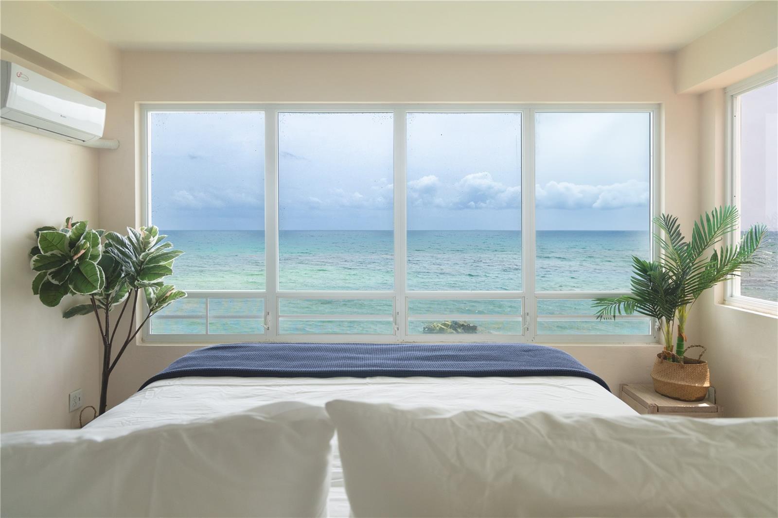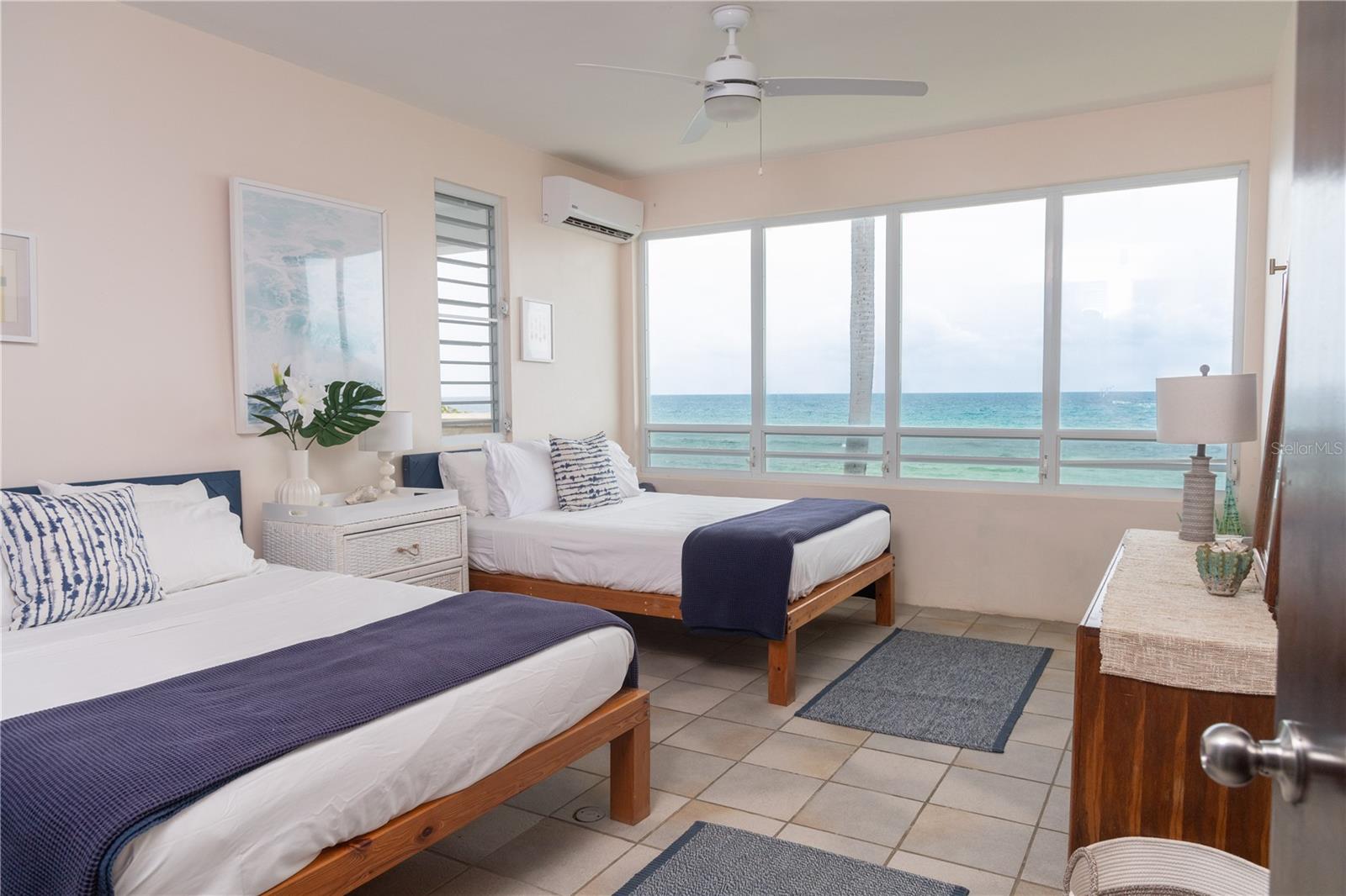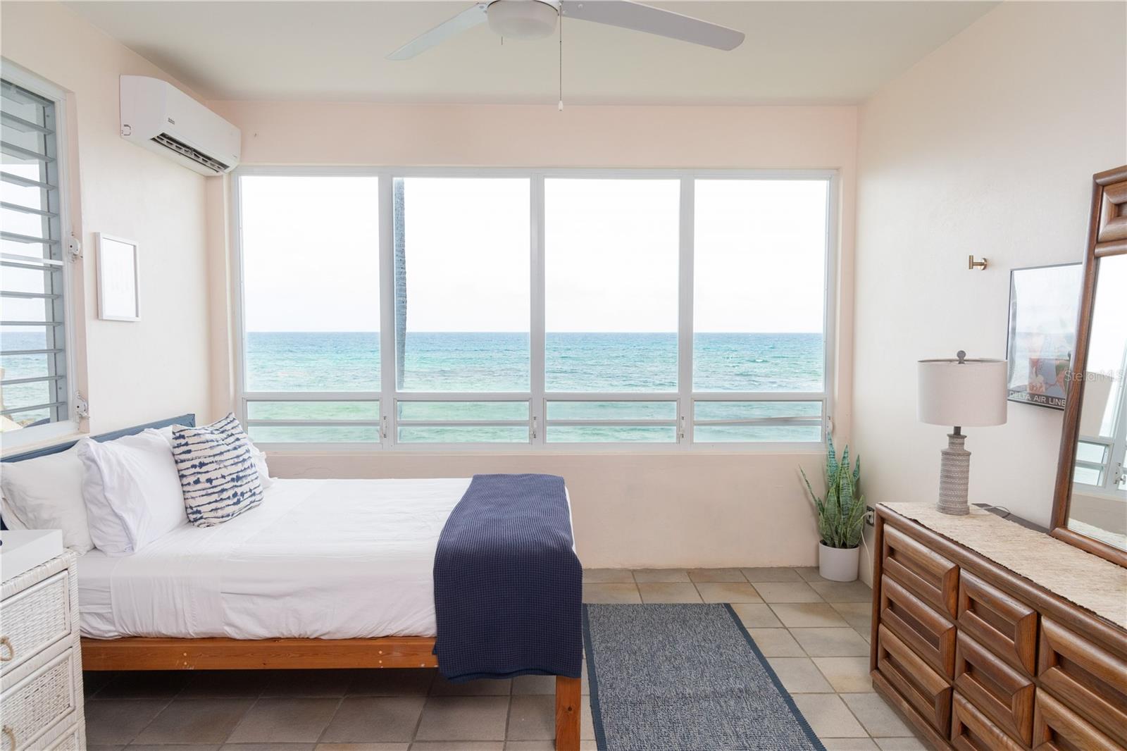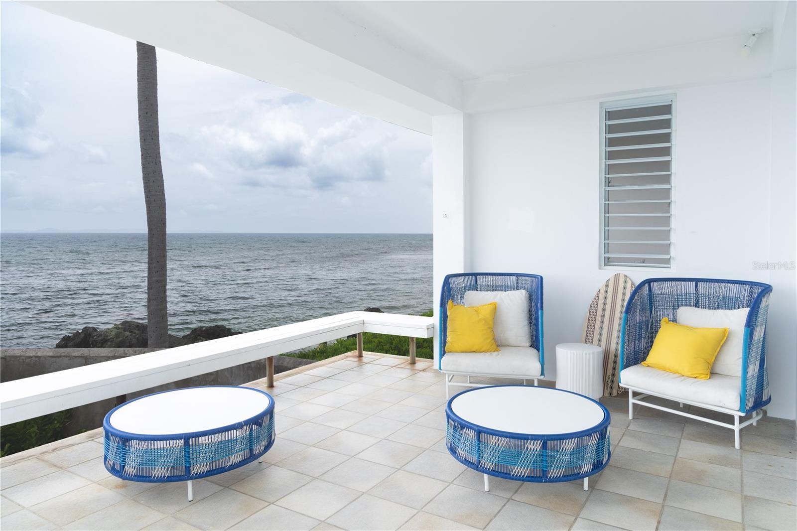 Las Piedras is a rare oceanfront property offering unmatched views and a remarkable connection to its surroundings. Set just above the clear waters of Vieques’ north shore, the home captures a full 180-degree view of the Caribbean—stretching from the coral-lined shallows below to the distant outlines of Culebra, St. Thomas, and St. John on the horizon. To the west, the mountains of mainland Puerto Rico rise against the sky, anchoring the landscape in every direction. A private driveway lined with mature palms and dense tropical foliage leads to the home’s entrance, which reveals a contemporary structure with subtle Spanish Colonial elements—most notably its terracotta-tiled, hipped roof. The three-story residence is solidly built and thoughtfully laid out, with four bedrooms, two and a half baths, and multiple indoor-outdoor living areas that make the most of the setting. The upper level is the heart of the home, with vaulted ceilings and an open-concept kitchen, dining, and living area. Floor-to-ceiling windows and doors frame uninterrupted views of the ocean from nearly every angle. The living space opens onto a wide ocean-facing balcony, ideal for sun lounging or outdoor dining. A half bath and an adjacent auxiliary room—currently outfitted with a bed—offer potential for a flexible use space or an additional bathroom conversion. Anchoring the structure is a central staircase built directly into the landscape, incorporating large natural boulders that not only define the aesthetic but also act as part of the home’s foundation. The second level houses the primary sleeping quarters, including two ocean-view bedrooms. The principal suite includes a modern ensuite bath with a polished cement shower and integrated sink. This level also features a smaller sitting room with a hidden Murphy bed, which opens onto a balcony overlooking the sea and connecting to the pool terrace. A spacious second full bath includes an oversized built-in tiled tub. The ground floor offers two additional cozy, well-proportioned bedrooms and a common area with a reading nook. There’s also a modern full bathroom with a polished cement shower and built-in sink, positioned next to a large laundry and storage room. Beneath the pool deck is a utility and pump room, discreetly tucked away from the main living areas. The bedrooms are fully air-conditioned for comfort, while the rest of the home is designed to take full advantage of natural ventilation, ocean breezes, and crosswinds. Las Piedras combines privacy and presence—set apart from the street, with direct access to the quiet sands of La Chata beach. Landscaped with native palms and low-maintenance gardens, the property includes a walking path that circles the house and offers seamless access to every corner of this uniquely situated coastal home. A gated entrance opens to a parking area that comfortably accommodates two vehicles. Whether as a personal retreat, an elegant space for entertaining, or an income-producing asset, Las Piedras delivers. It is currently operated as a highly successful luxury vacation rental, offering immediate investment potential with a proven rental history.