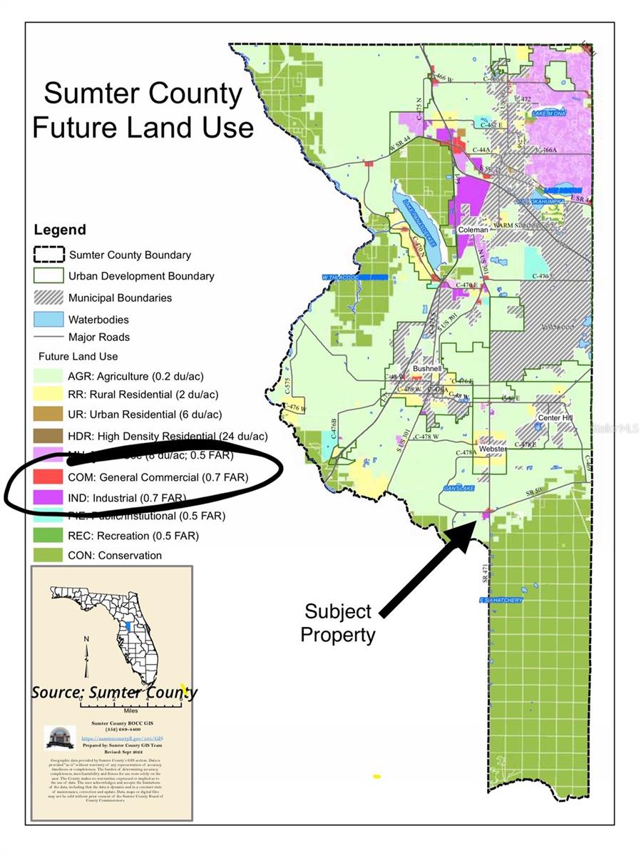 Everyone has asked, so here you go. There was a large demand for the seller to cut off a portion of this incredible property an offer the hard corner, and the time has come. INCREDIBLE OPPORTUNITY! Prime location on the busy intersection of SR 50 and SR 471. The ONLY corner currently for sale that has both SR 50 frontage AND SR 471 frontage. Approximately 4 acres, that could be cut from the existing 13 acre parcel. Need more than 4 acres…no problem, we can do that. High traffic area in the path of future growth and development. Sumter County Economic Development has identified this area as a secondary “Economic opportunity zone” for Sumter County. There is currently no sewer or water available to site. On-site fire suppression could be accommodated by alternate ways. Please do not access site without prior approval. The property is currently zoned RR5C to allow for the current residential home however future land use is identified as potential commercial/heavy commercial. Industrial is also identified as potential future land use. For information on the most current DOT information for the road widening project please call or email. You can also reach out to the DeLand branch of DOT directly for questions and information on the SR 50 road widening project in south Sumter County. The parcel being sold T19-011 has already undergone SR 50 expansion alterations. Dimensions are approximate. Buyer or Buyer’s agent to verify all information. Existing heavy commercial and industrial already in the vicinity. Proof of funds required for offer submission. Sumter County is a pro-business county with an emphasis on manufacturing, distribution and agribusiness as targeted industries. Commute to Ocala, Tampa, Orlando or Lakeland in approximately 1 hour. Site visits are available by appointment only 7 days a week with 24 hours notice. For more information, call today.