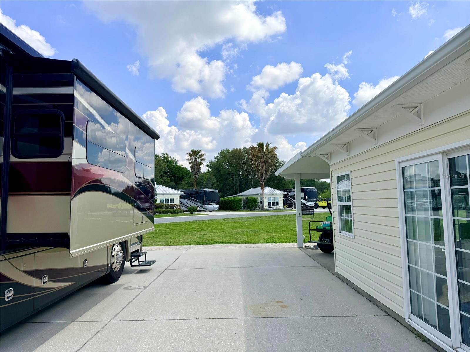 Welcome to Lot 285 in Florida Grande Motor Coach Resort, one of the most spacious developed properties in the community. Situated on a desirable corner lot and spanning an impressive 10,394 square feet, this property offers an extraordinary amount of outdoor space—making it the second largest developed property in the resort and a rare opportunity for motorcoach owners who value room to spread out and enjoy outdoor living. The 26’ x 76’ reinforced concrete pad easily accommodates your motorhome, with a full-hookup utility pedestal conveniently located on the driver’s side. This pull-in, east-facing property offers beautiful morning sun and a welcoming arrival experience. Outdoor living is where this property truly shines. The expansive layout provides exceptional flexibility for entertaining, relaxing, or designing your own outdoor retreat. Additional pavers behind the coach expand the living space even further, creating a generous setting for outdoor seating, dining, and gatherings. A 12’ x 16’ covered patio with ceiling fan offers shade and comfort, making it the perfect place to enjoy Florida’s beautiful weather year-round. The 384-square-foot Grande Suite provides convenient guest and owner accommodations with tile flooring throughout, a kitchenette with full-size refrigerator, and a full bathroom with tub/shower. A washer and dryer are also included, adding to the practicality of this flexible space. Florida Grande Motor Coach Resort is known as Florida’s friendliest motorcoach resort, offering a welcoming community and exceptional amenities. Owners enjoy a 20,000-square-foot clubhouse, fitness center, billiards room, library, resort-style pool and spa, dog park, and an active pickleball complex. Throughout the winter season, activities and community events keep residents and guests as busy as they’d like, creating a vibrant and social atmosphere. Located in a peaceful country setting in Central Florida, Florida Grande is ideally positioned for exploration—approximately an hour from Tampa, Orlando, and Ocala and about 30 minutes from The Villages. Whether you enjoy beaches, theme parks, nature parks, or charming small towns, the resort provides the perfect home base for discovering everything Central Florida has to offer. When you’re not using your property, owners have the option to rent their lot, creating potential passive income while sharing the Florida Grande experience with other motorcoach travelers. If you're looking for space and comfort while traveling, don't miss this opportunity.