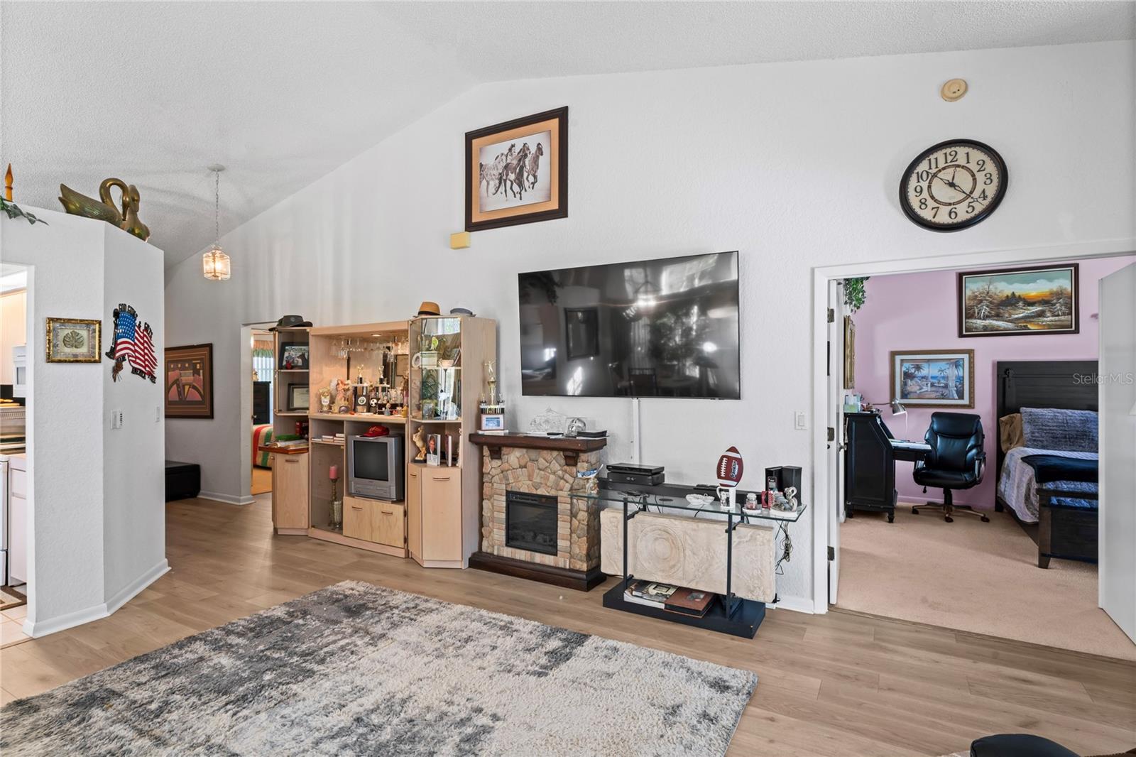 Welcome to this charming two bedroom two bathroom Villa. It sits on a corner lot with a double garage and double driveway. You are welcomed into a private patio entrance. This home also boasts a large outdoor back patio that is screened for privacy to enjoy your get togethers. The kitchen has bright lighting and large windows with room for your breakfast table and chairs. This home has a dinning room separate from the kitchen and a large living room with sliding pocket glass doors leading to the outback patio is which is surrounded by matured hedges for your privacy. The master bedroom has plenty of space for a king size bed, two walk in closets and a large master bathroom, bathtub and separate shower with lots of lighting from the large window's. Split floor plan, second bedroom and bathroom. This home is one that is included with the maintenance of the yard bushes grass and the tile roof, exterior paint that is all included in your HOA fees. Maintenance of sprinkler system also included. The Estate includes tennis courts/pickelball, Two pools, Hot tub one across the street just for this part of the development a dog park veterans park, Clubhouse, Golfing and shuffle board along with many clubs to keep you entertained like Kayak, Italian, Garden, and many more. Private security guard entrance. Shopping and stores are a golf cart ride away for your convenience!