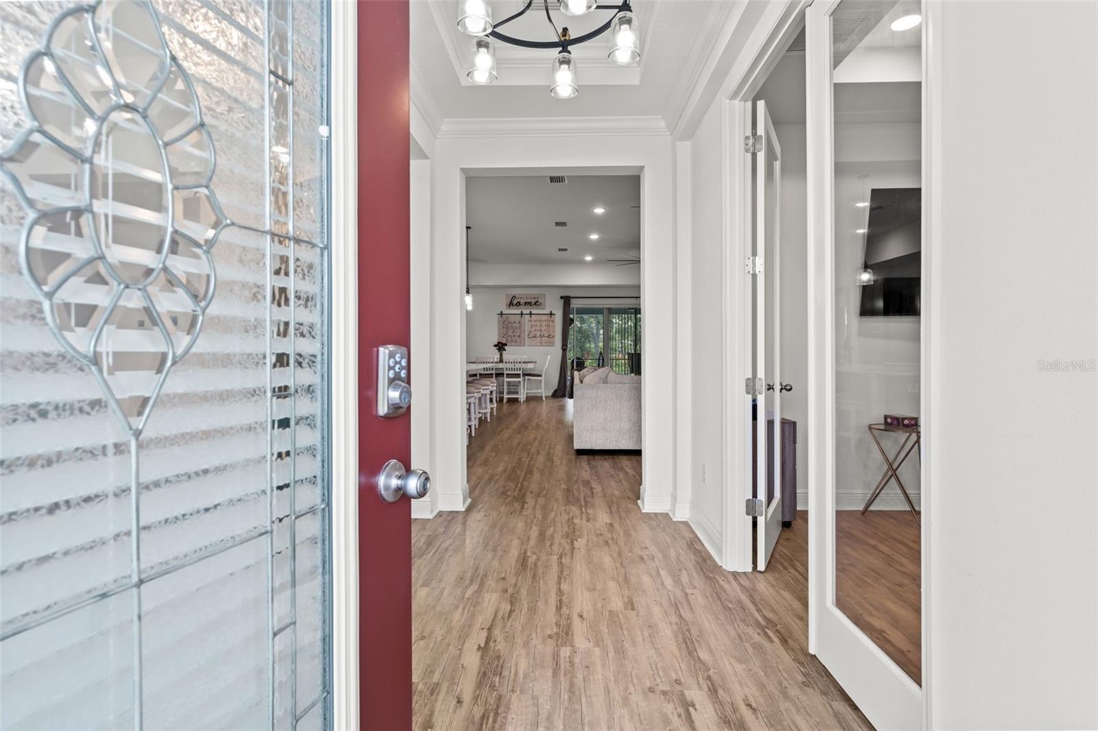 PRICE REDUCTION + SELLER OFFERING UP TO $20K TOWARDS CLOSING COSTS! Or, take the discount off the current listing price to make it $714K! HONEY, THIS HOME IS THE ONE!! Welcome to this stunning, custom-built masterpiece in the highly desired Woodland Waters Community Phase 6, a rare gem with low HOA dues. Whether you're seeking luxury, space, or privacy, this home has it all—and then some! Built in 2022, it is pristine and offers countless upgrades that make it an entertainer’s dream and a homeowner’s oasis. Key Features: AC with extended warranty, paid by the seller, for peace of mind. Side-entry 3-car garage with extended depth for larger vehicles. Enjoy evenings on the front porch with space to relax, read, or sip a beverage in your favorite rocking chair. Meticulously landscaped yard on ¾ of an acre, offering privacy and room to play. Custom touches throughout including upgraded light fixtures, crown molding, tray ceilings, LED lights, and custom fans that add elegance to every room. Kitchen: The heart of the home features luxurious countertops, stainless steel appliances, and an impressive 15-foot island—perfect for culinary enthusiasts. Tile backsplash, two ovens, plenty of cabinet space, and a walk-in pantry make this kitchen a chef's dream. Living & Dining: Spacious living room with upgraded carpet-less flooring, double fans, and LED lights—designed for oversized furniture and a grand ambiance. Dining area ideal for both intimate gatherings and large family meals. Owner's Suite: A luxurious retreat with ample space for upscale furniture. The owner’s bath features a rainfall shower, indulgent soaking tub, and dual sinks—perfect for relaxing after a long day. Additional Bedrooms: 3 generously sized bedrooms with walk-in closets for comfort and privacy. 1 bedroom with double door entry—ideal for use as a home office, gym, or guest room. Upstairs Media Room: A massive media room upstairs offers endless possibilities—gaming, movies, or creating your own private retreat. Plus, a huge storage area upstairs to keep things organized. Outdoor Oasis: Screened-in extended lanai—ideal for grilling, entertaining, or just enjoying the outdoors, all while being protected from the elements. Relax in your heated saltwater pool or unwind in the heated spa, surrounded by lush, peaceful landscaping. Bonus Features: Both AC units have 7.5 years of warranty left—another big plus for peace of mind. Upgraded flooring, designer fixtures, and a layout that offers both privacy and openness. With every upgrade imaginable and a location in a community that offers a rare combination of luxury, tranquility, and access to amenities, this home truly offers the best of both worlds. Don't miss this opportunity to own your dream home! Schedule your private showing today and bring offers! This home is waiting for YOU!