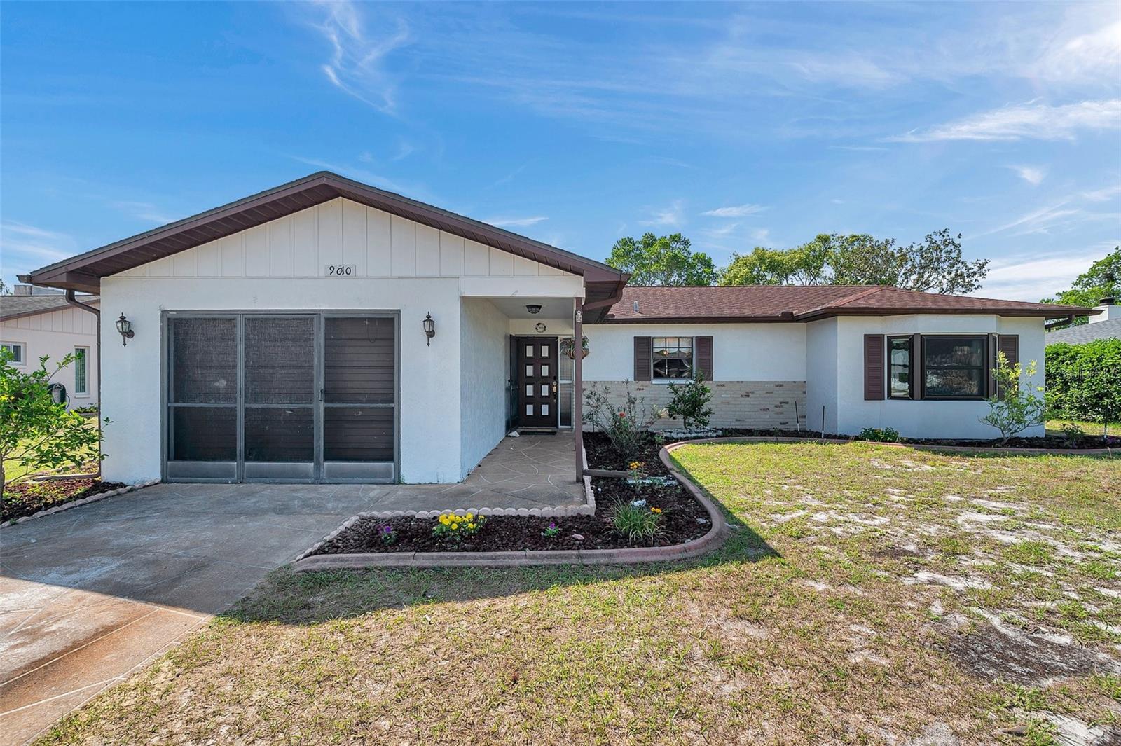 Welcome to 9010 Bonnet Way, where stylish updates and thoughtful details come together in the beautiful golf community of The Heather. Step inside and immediately feel at home. The heart of the home—a brand-new kitchen—has been beautifully reimagined with shaker cabinets, sleek stainless steel appliances, stunning butcher block countertops, and a custom tile backsplash that adds a perfect pop of style. The open concept design allows the kitchen to flow effortlessly into the living and dining spaces, where a cozy wood-burning fireplace and skylights create a warm and welcoming atmosphere filled with natural light. Off the kitchen, what was once an open flex space has been thoughtfully enclosed with a stylish barn door, creating a versatile bonus room ideal for a third bedroom, office, guest room, or hobby space. New luxury vinyl flooring has been added to the spacious primary bedroom, offering a modern and durable touch underfoot. Both bathrooms have been fully renovated with updated vanities, fixtures, and tile work, giving the home a fresh, contemporary feel throughout. Outside, the expansive paver patio provides plenty of room to relax or entertain, with enough space to add a future pool if you wish. Around back, you’ll find a separate golf cart garage—ideal for extra storage, weekend adventures, or your next round on the greens. All of this is set within The Heather, a quiet, deed-restricted community with low HOA fees, offering easy access to Pine Island Beach, Weeki Wachee Springs, shopping, restaurants, and the Suncoast Parkway for a quick trip to Tampa.