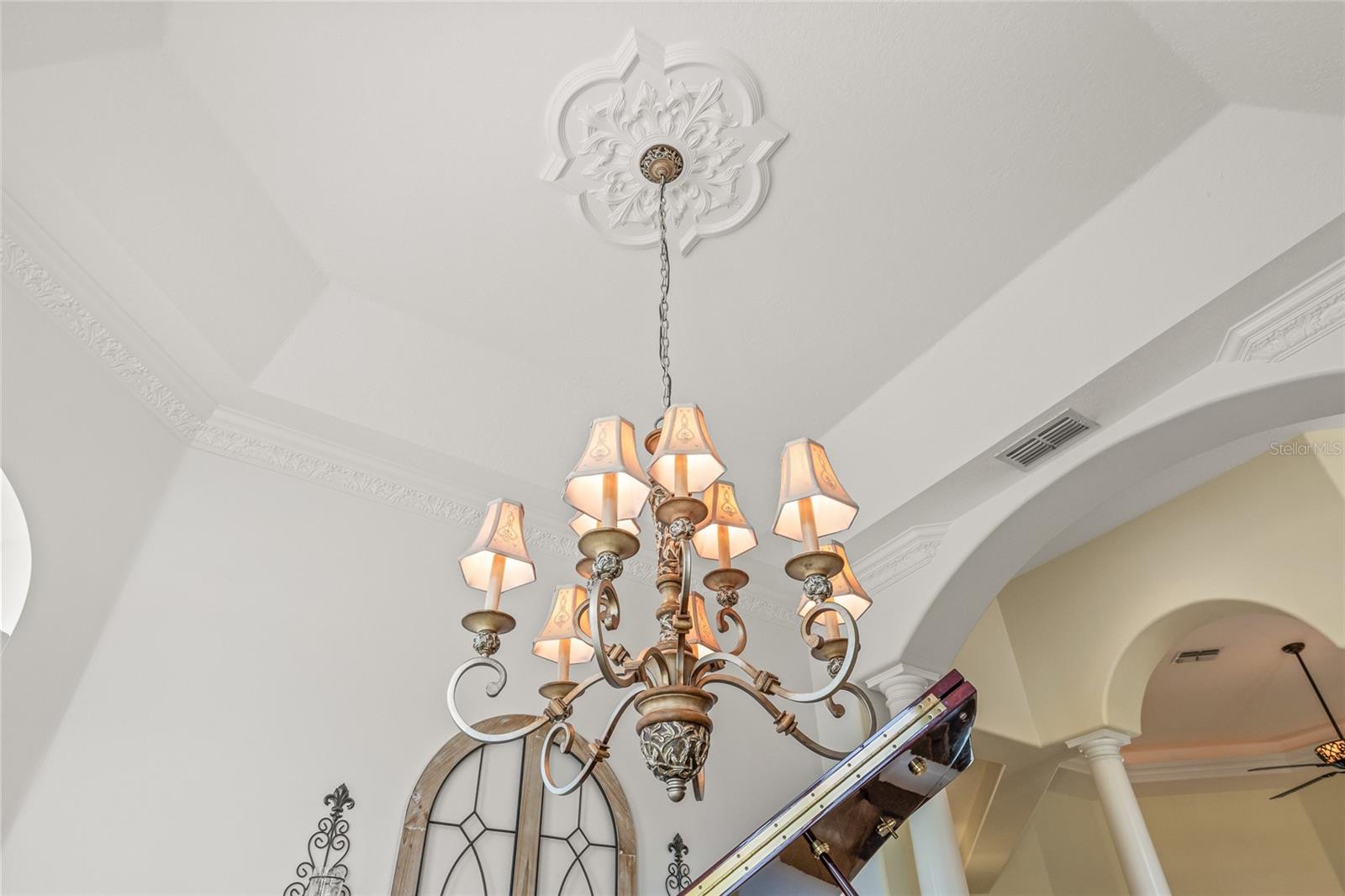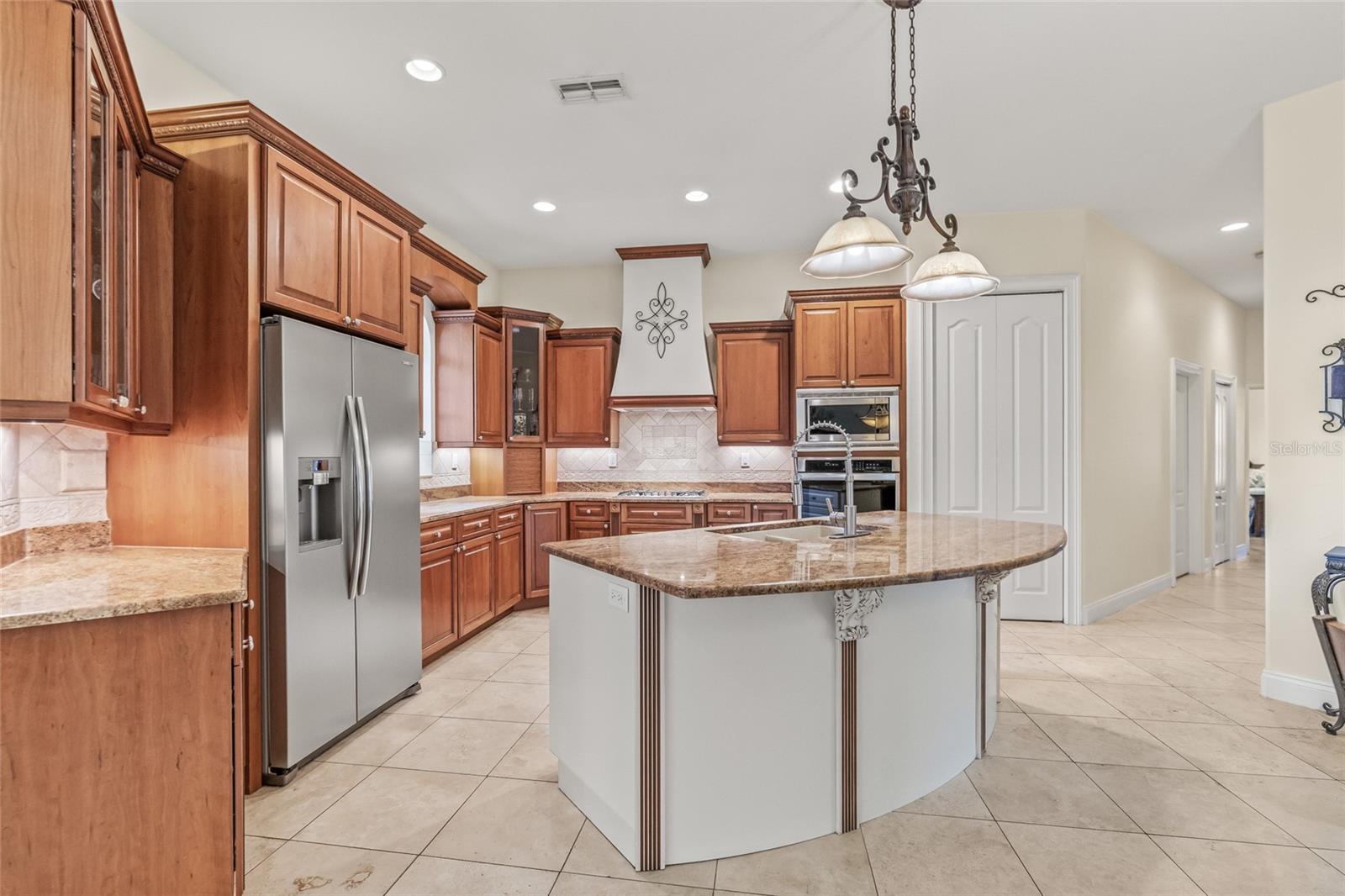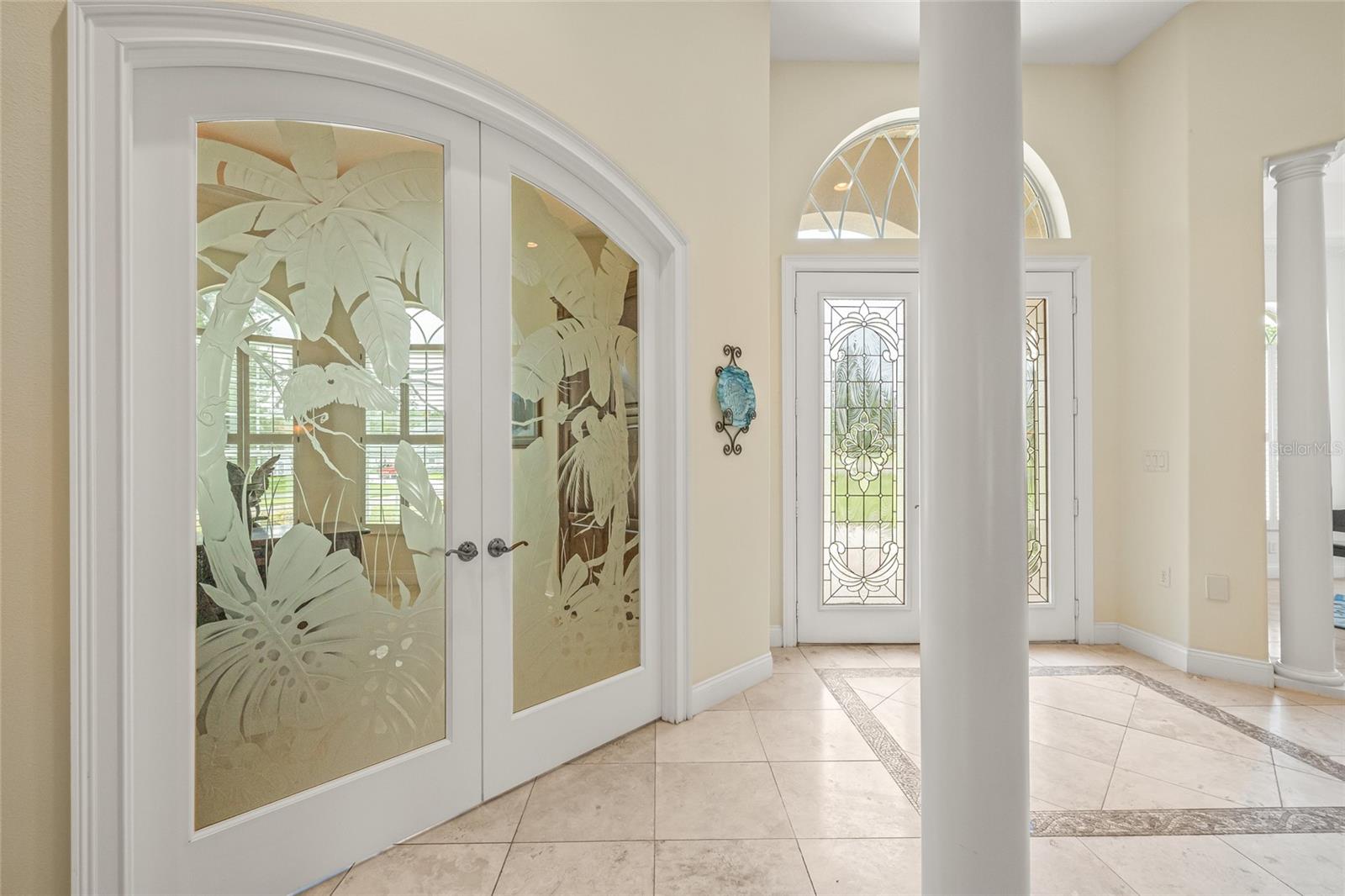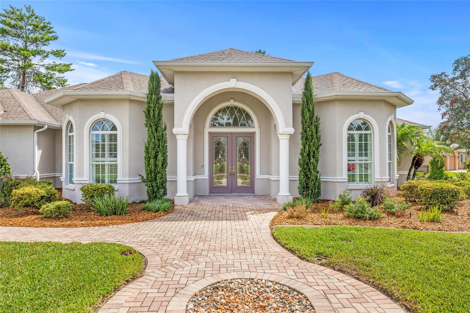 This is a one-of-a-kind custom home, built in 2010, sitting on a spacious 0.63-acre corner lot with incredible curb appeal and a long list of thoughtful upgrades inside and out. With a split floor plan, 3 bedrooms, an office, 2.5 bathrooms, and outdoor living space, this home is anything but typical as no detail was overlooked. Inside, you’ll find travertine tile throughout and 10-foot ceilings in every room, with the formal living room standing out thanks to its 14-foot coffered ceiling, LED accent lighting, and crown molding. The separate office also features a coffered ceiing, built in cabinetry, and beautiful hand-carved glass doors—perfect for working from home in style. The kitchen is both functional and inviting, with custom maple cabinets, pull-out drawers, granite countertops, a gas cooktop, newer stainless appliances, and even electrical outlets above the cabinets for accent lighting or holiday décor. Just off the kitchen, the dining room includes a built-in cabinet, crown molding, and a decorative ceiling medallion. The primary bedroom has its own pool access, another coffered ceiling, dual walk-in closets with hidden storage, and a large en suite bath with a jetted tub, walk-around shower, and dual marble vanities. One of the guest bedrooms also opens to the pool, and the other includes an extra-large closet. A Jack & Jill bathroom connects the two with wood cabinetry, granite counters, dual sinks, and a tub/shower combo. There’s also a half bath conveniently located off the main living area with direct pool access. Step outside to your own backyard retreat, complete with a saltwater, solar-heated pool and a gas fireplace under a fully re-screened cage (with Florida glass, done in 2024). The solar panels for pool heating were recently deep cleaned, with four panels replaced with brand new ones for added efficiency. There’s also a propane hookup for a grill, newer pool motor (2023), new salt cell and hosting unit (2024), and new outdoor fans and security lighting. Additional highlights include: NO FLOODING or STORM DAMAGE from hurricanes. New landscaping with mulch and drip system, New Rainbird sprinkler timer (2025), New water softener, Central vacuum, Crown molding throughout, Gas tankless water heater and 125-gallon propane tank, Newer 4-ton HVAC system with regular maintenance, Newer rod iron fencing, Well for irrigation. This home has a solid, custom feel throughout—nothing cookie-cutter here. If you're looking for a unique home with space, quality finishes, and a true indoor-outdoor Florida lifestyle, this one is definitely worth a look. Woodland Waters offers access to Tooke Lake with a private boat ramp, plus tennis and pickleball courts, and a community park. Daily conveniences like Publix and other shopping are just outside the neighborhood. You're only 15 minutes from Pine Island Beach for sunset views, kayaking, boating, fishing, and even swimming with manatees on the river—or spending the day at Buccaneer Bay Water Park. And with the Suncoast Parkway just 15 minutes away, getting to Tampa International Airport is quick and easy.